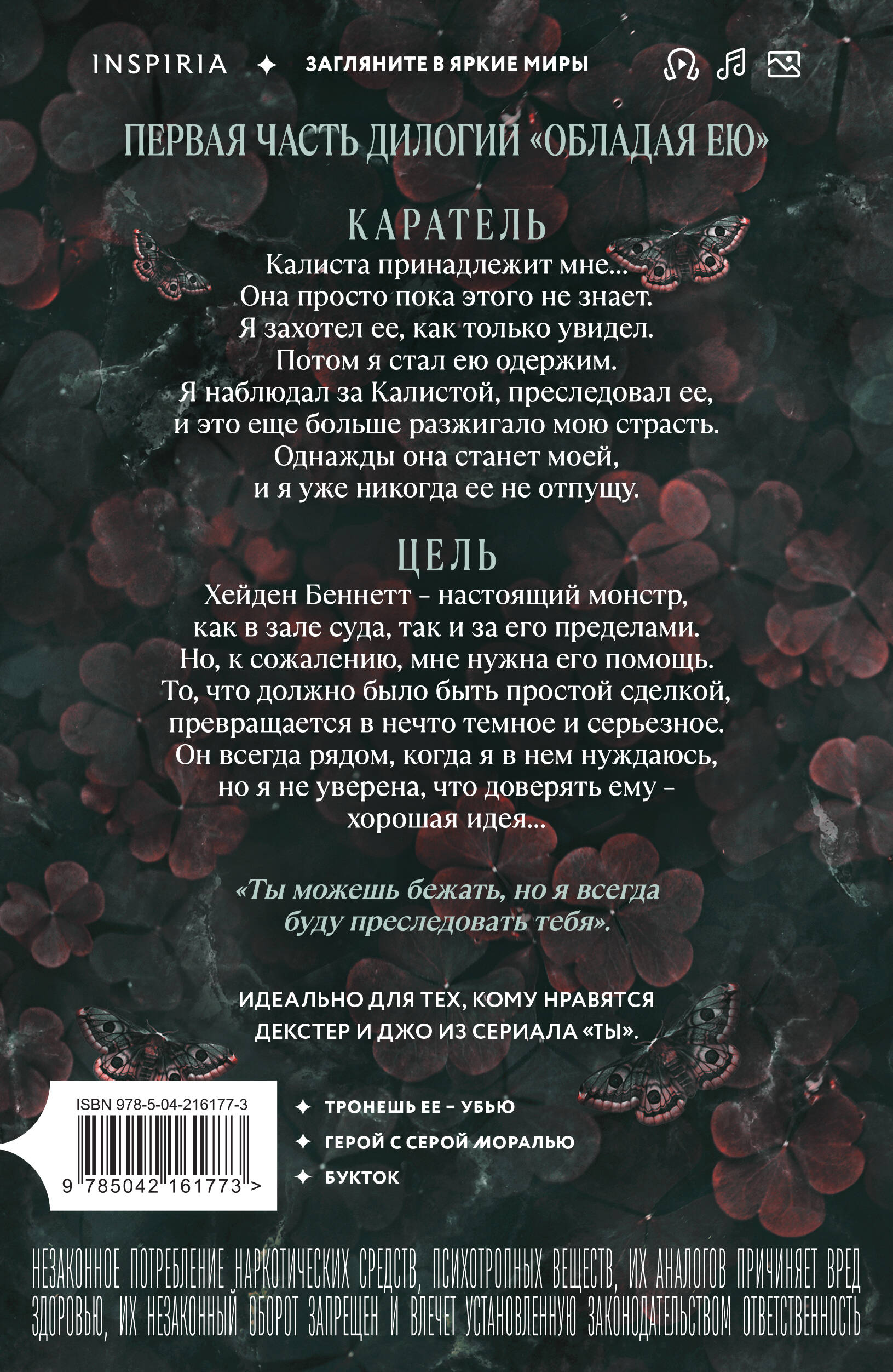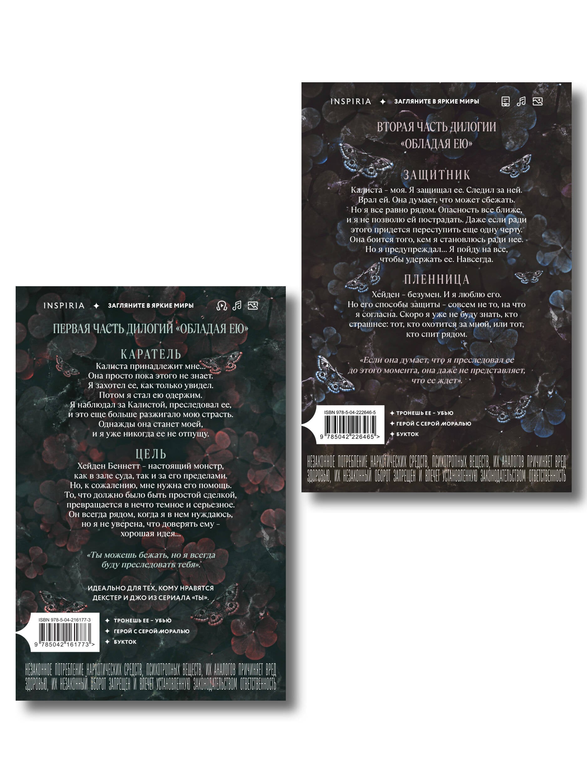 НЕЗАКОННОЕ ПОТРЕБЛЕНИЕ НАРКОТИЧЕСКИХ СРЕДСТВ, ПСИХОТРОПНЫХ ВЕЩЕСТВ, ИХ АНАЛОГОВ ПРИЧИНЯЕТ ВРЕД ЗДОРОВЬЮ, ИХ НЕЗАКОННЫЙ ОБОРОТ ЗАПРЕЩЕН И ВЛЕЧЕТ УСТАНОВЛЕННУЮ ЗАКОНОДАТЕЛЬСТВОМ ОТВЕТСТВЕННОСТЬ. Первая часть дилогии «Обладая ею». Хит Буктока - более 200 МЛН просмотров по хэштегу! Любимые тропы: «тронешь ее - убью», «герой с серой моралью», «помешанный на ней герой». Фирменный покет с клапанами, кремовой бумагой, софт-тач покрытием и объемным лаком на обложке. Нас свело убийство. И только смерть разлучит нас. Каратель Калиста принадлежит мне... Она просто пока этого не знает. Я захотел ее, как только увидел. Потом я стал ею одержим. Я наблюдал за Калистой, преследовал ее, и это еще больше разжигало мою страсть. Однажды она станет моей, и я уже никогда ее не отпущу. Цель Хейден Беннетт - настоящий монстр, как в зале суда, так и за его пределами. Но, к сожалению, мне нужна его помощь. То, что должно было быть простой сделкой, превращается в нечто темное и серьезное. Он всегда рядом, когда я в нем нуждаюсь, но я не уверена, что доверять ему - хорошая идея... «Ты можешь бежать, но я всегда буду преследовать тебя». Идеально для тех, кому нравятся Декстер и Джо из сериала «Ты». Вторая часть дилогии «Обладая ею». Хит Буктока - более 200 МЛН просмотров по хэштегу! Любимые тропы: «тронешь ее - убью», «герой с серой моралью», «помешанный на ней герой». Фирменный покет с клапанами, кремовой бумагой, софт-тач покрытием и объемным лаком на обложке. Быть без нее - для меня не вариант. Для нее тоже. Защитник Калиста - моя. Я защищал ее. Следил за ней. Врал ей. Она думает, что может сбежать. Но я все равно рядом. Опасность все ближе, и я не позволю ей пострадать. Даже если ради этого придется переступить еще одну черту. Она боится того, кем я становлюсь ради нее. Но я предупреждал… Я пойду на все, чтобы удержать ее. Навсегда. Пленница Хейден - безумен. И я люблю его. Но его способы защиты - совсем не то, на что я согласна. Скоро я уже не буду знать, кто страшнее: тот, кто охотится за мной, или тот, кто спит рядом. «Если она думает, что я преследовал ее до этого момента, она даже не представляет, что ее ждет». Морган Бриджес - автор темной романтики, любительница антигероев, глубоких книг с красивым слогом, романтики, от которой захватывает дух, и горячих сцен, которые заставляют краснеть. Она живет со своей семьей недалеко от Далласа, штат Техас.| Издательство | ООО "Издательство "Эксмо" |