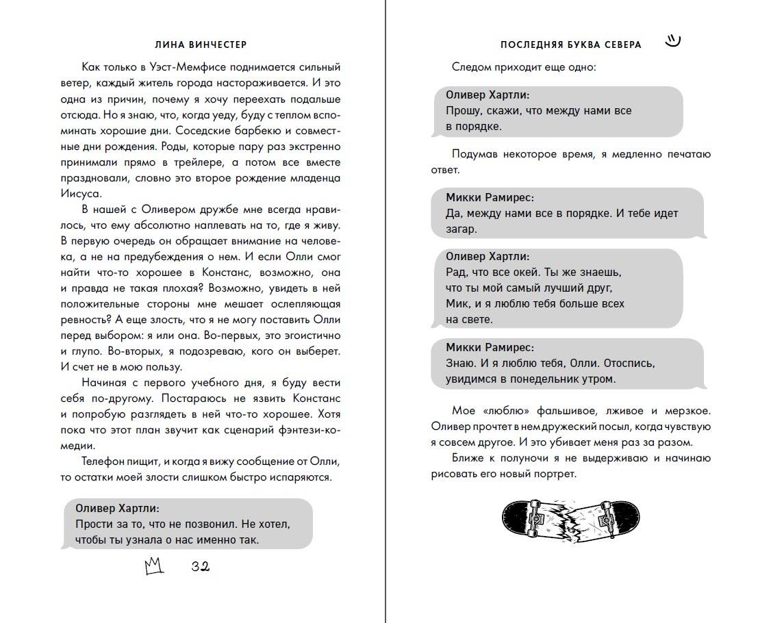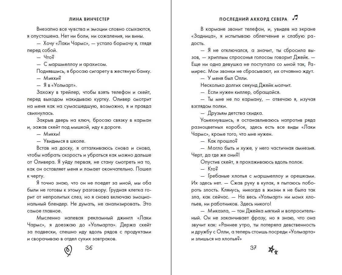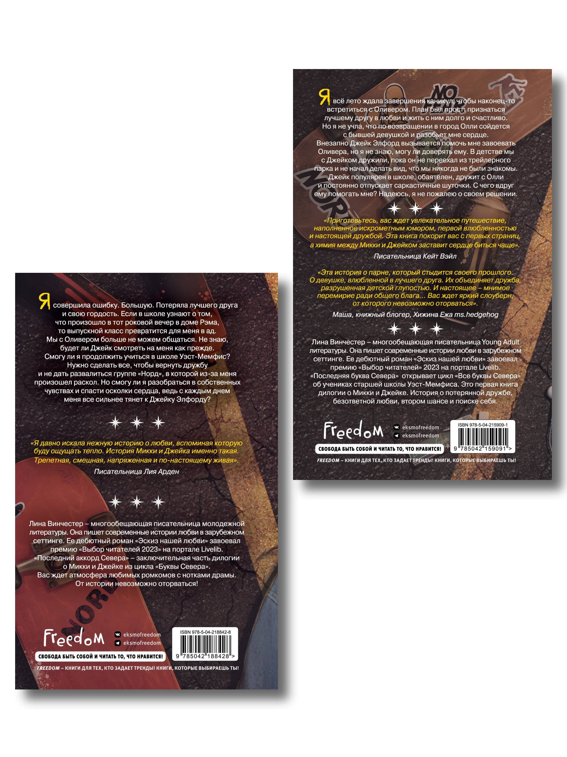 Комплект «Буквы Севера» Лины Винчестер - популярного автора молодежной сентиментальной прозы. Романтическая история Микки и Джейка в антураже американской школы и рок-группы напомнит вам романы «Всем парням, которых я любила», «Сделка», а также фильм «Простушка», и расскажет о потерянной дружбе, втором шансе, любви и о том, как важно ценить себя. Внутри красочные форзацы с узорами на асфальте и портретами героев, а также атмосферная верстка! «Последняя буква Севера» Я все лето ждала завершения каникул, чтобы наконец-то встретиться с Оливером. План был прост: признаться лучшему другу в любви и жить с ним долго и счастливо. Но я не учла, что по возвращении в город Олли сойдется с бывшей девушкой и разобьет мне сердце. Внезапно Джейк Элфорд вызывается помочь мне завоевать Оливера, и я не знаю, могу ли доверять ему. В детстве мы с Джейком дружили, пока он не переехал из трейлерного парка и не начал делать вид, что мы никогда не были знакомы. Джейк популярен в школе, обаятелен, дружит с Олли и постоянно отпускает саркастичные шуточки. С чего вдруг ему помогать мне? Надеюсь, я не пожалею о своем решении. «Последний аккорд Севера» Я совершила ошибку. Большую. Потеряла лучшего друга и свою гордость. Если в школе узнают о том, что произошло в тот роковой вечер в доме Рэма, то выпускной класс превратится для меня в ад. Мы с Оливером больше не можем общаться. Не знаю, будет ли Джейк смотреть на меня как прежде. Смогу ли я продолжить учиться в школе Уэст-Мемфис? Нужно сделать все, чтобы вернуть дружбу и не дать развалиться группе «Норд», в которой из-за меня произошел раскол. Но смогу ли я разобраться в собственных чувствах и спасти осколки сердца, ведь с каждым днем меня все сильнее тянет к Джейку Элфорду? Лина Винчестер пишет современные истории любви в зарубежном сеттинге. Ее дебютный роман «Эскиз нашей любви» завоевал премию «Выбор читателей» 2023 на портале Livelib. Читайте романы автора: Одиночные книги: «Ноттингем» «Эскиз нашей любви» «Притворись моим на Рождество» Цикл «Буквы Севера»: «Последняя буква Севера» «Последний аккорд Севера» Продолжение следует…| Издательство | ООО "Издательство "Эксмо" |