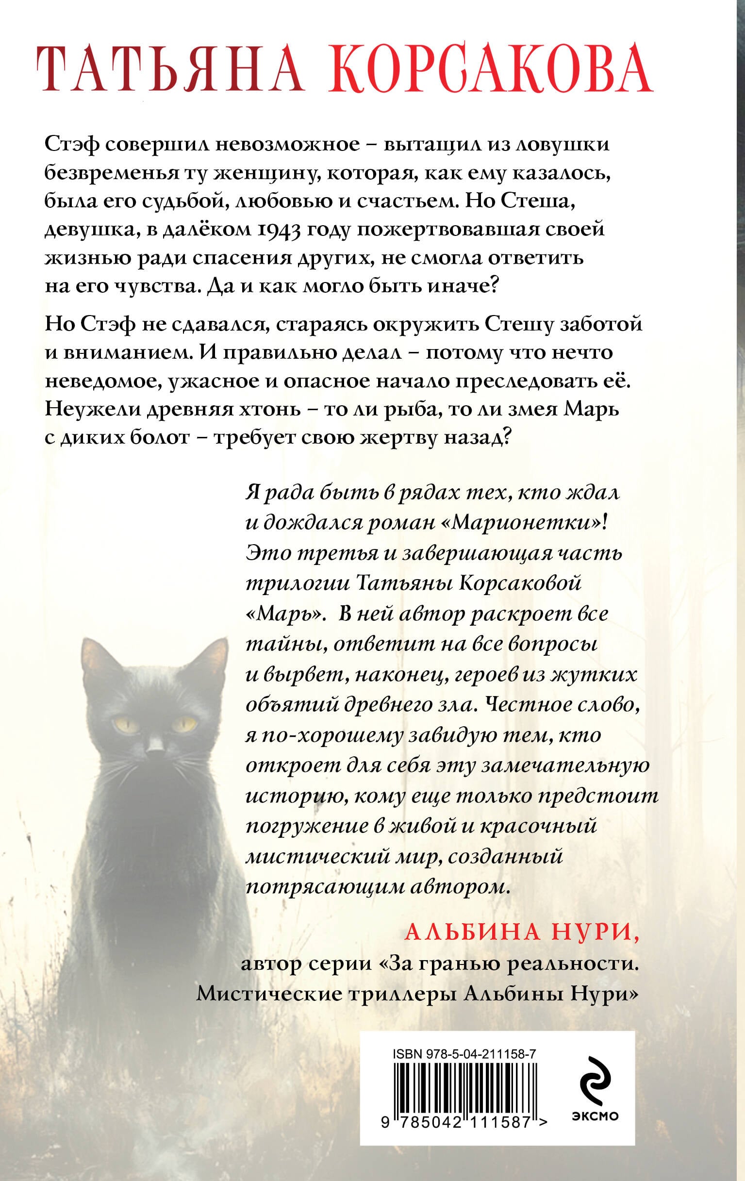 Комплект из 3-х книг цикла «Марь» Татьяны Корсаковой: «Марь», «Марионеточник», «Марионетки»! «Марь» Не ходите на болото с наступлением темноты. Нечего вам делать в старом доме у края болота. А если вы там оказались, не верьте жалобным голосам тех, кто будет стучаться в вашу дверь. Откроете - до утра не доживёте. Болотная Марь видит вас, слышит вас, чувствует. Она сильнее, умнее, опаснее, у неё много детей и верных помощников... Всем этим ужасам есть рациональное объяснение, но всегда есть люди, для которых нет запретов. Именно такими оказались Стэф и Арес, искатели артефактов и всего необычного. Привела их сюда удивительная карта и старая армейская фляга. А до них на болоте сгинул отряд таких же охотников за удачей. Повезёт ли им - даже если их планы далеки от грабительских? «Марионеточник» Бесконечно древняя рыба Марь, чешуя которой превратилась в камни, дремлет в бездонных водах… Лишь изредка открывается её глаз, чтобы тому, кого приметил, принести либо горе, либо счастье. Вот и Стэф - умный, везучий, расчётливый, не знает, куда заведёт его поход по болотным хлябям. А девушка из давнего-давнего прошлого всё зовёт и просит спасти, вырвать из снов древней рыбы, вернуть к жизни. С каждой минутой поход становится всё опаснее - особенно с появлением на болотах зловещего персонажа по имени Марионеточник… «Марионетки» Стэф совершил невозможное - вытащил из ловушки безвременья ту женщину, которая, как ему казалось, была его судьбой, любовью и счастьем. Но Стеша, девушка, в далёком 1943 году пожертвовавшая своей жизнью ради спасения других, не смогла ответить на его чувства. Да и как могло быть иначе? Но Стэф не сдавался, стараясь окружить Стешу заботой и вниманием. И правильно делал - потому что нечто неведомое, ужасное и опасное начало преследовать её. Неужели древняя хтонь - то ли рыба, то ли змея Марь с диких болот - требует свою жертву назад?