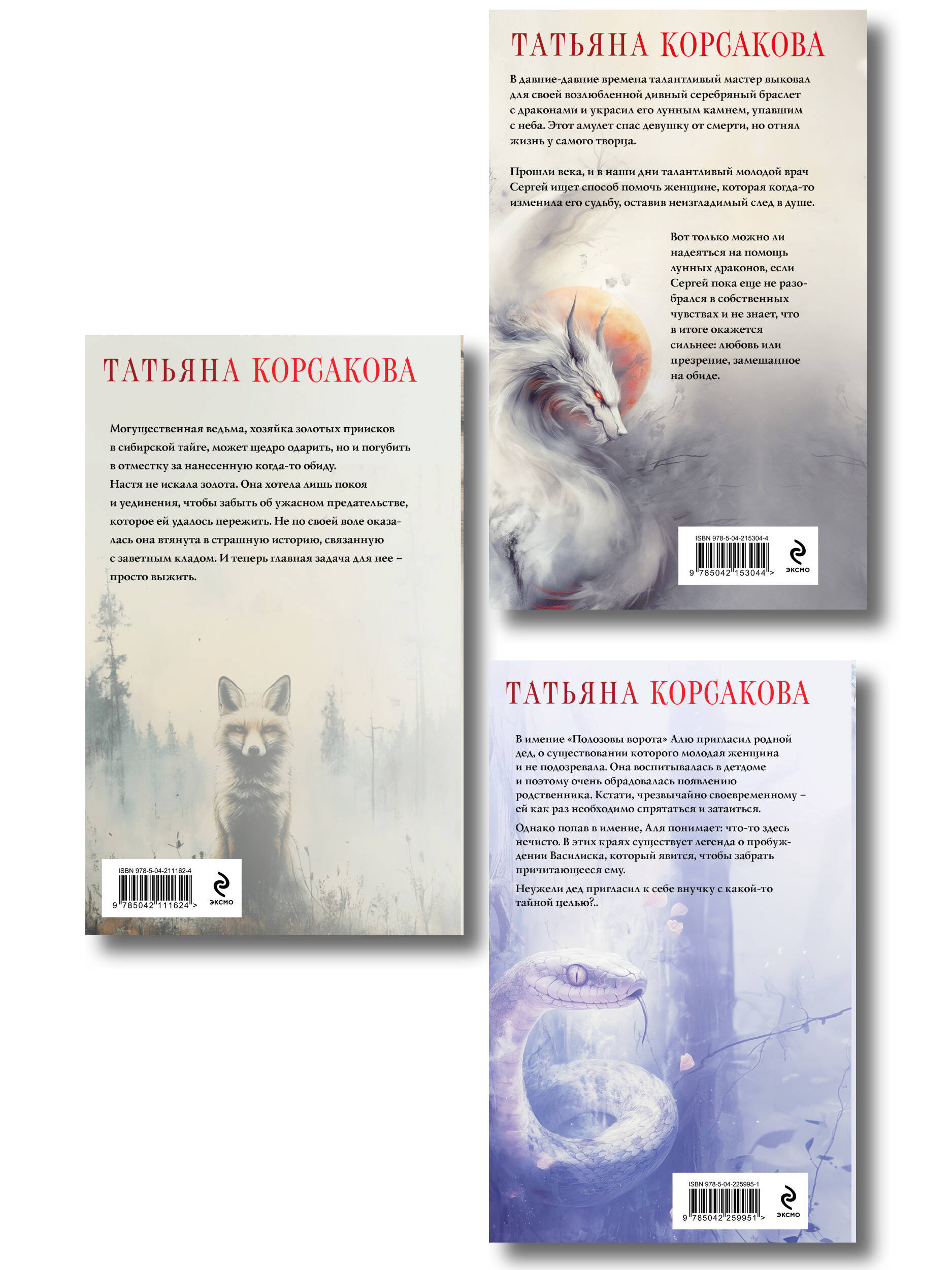 Татьяна Корсакова - популярный автор любовно-авантюрных романов с элементами мистики. Из-под ее пера вышло более двух десятков книг. Сюжеты рождаются из городских легенд, народных сказаний, древних книг и собственной буйной фантазии. Комплект из 3-х книг Татьяны Корсаковой: «Ведьмин клад», «Лунные драконы» и «Печать Василиска»! «Ведьмин клад» Могущественная ведьма, хозяйка золотых приисков в сибирской тайге, может щедро одарить, но и погубить в отместку за нанесенную когда-то обиду. Настя не искала золота. Она хотела лишь покоя и уединения, чтобы забыть об ужасном предательстве, которое ей удалось пережить. Не по своей воле оказалась она втянута в страшную историю, связанную с заветным кладом. И теперь главная задача для нее - просто выжить. «Лунные драконы» В давние-давние времена талантливый мастер выковал для своей возлюбленной дивный серебряный браслет с драконами, украсив его лунным камнем, упавшим с неба. Этот амулет спас девушку от смерти, зато отнял жизнь у самого творца. Прошли века, и молодой талантливый врач Сергей ищет способ помочь той женщине, что оставила неизгладимый след в его прошлом, перевернув всю его жизнь. Помогут ли ей лунные драконы, тем более что Сергей еще не разобрался в своих чувствах к ней и не знает, что победит: любовь или презрение, замешанное на обиде. «Печать Василиска» В имение «Полозовы ворота» Алю пригласил родной дед, о существовании которого молодая женщина и не подозревала. Она воспитывалась в детдоме и поэтому очень обрадовалась появлению родственника. Кстати, чрезвычайно своевременному - ей как раз необходимо спрятаться и затаиться. Однако, попав в имение, Аля понимает: что-то здесь не чисто. В этих краях существует легенда о пробуждении Василиска, который явится за тем, чтобы забрать причитающееся ему. Неужели дед пригласил к себе внучку с какой-то тайной целью?..| Издательство | ООО "Издательство "Эксмо" |