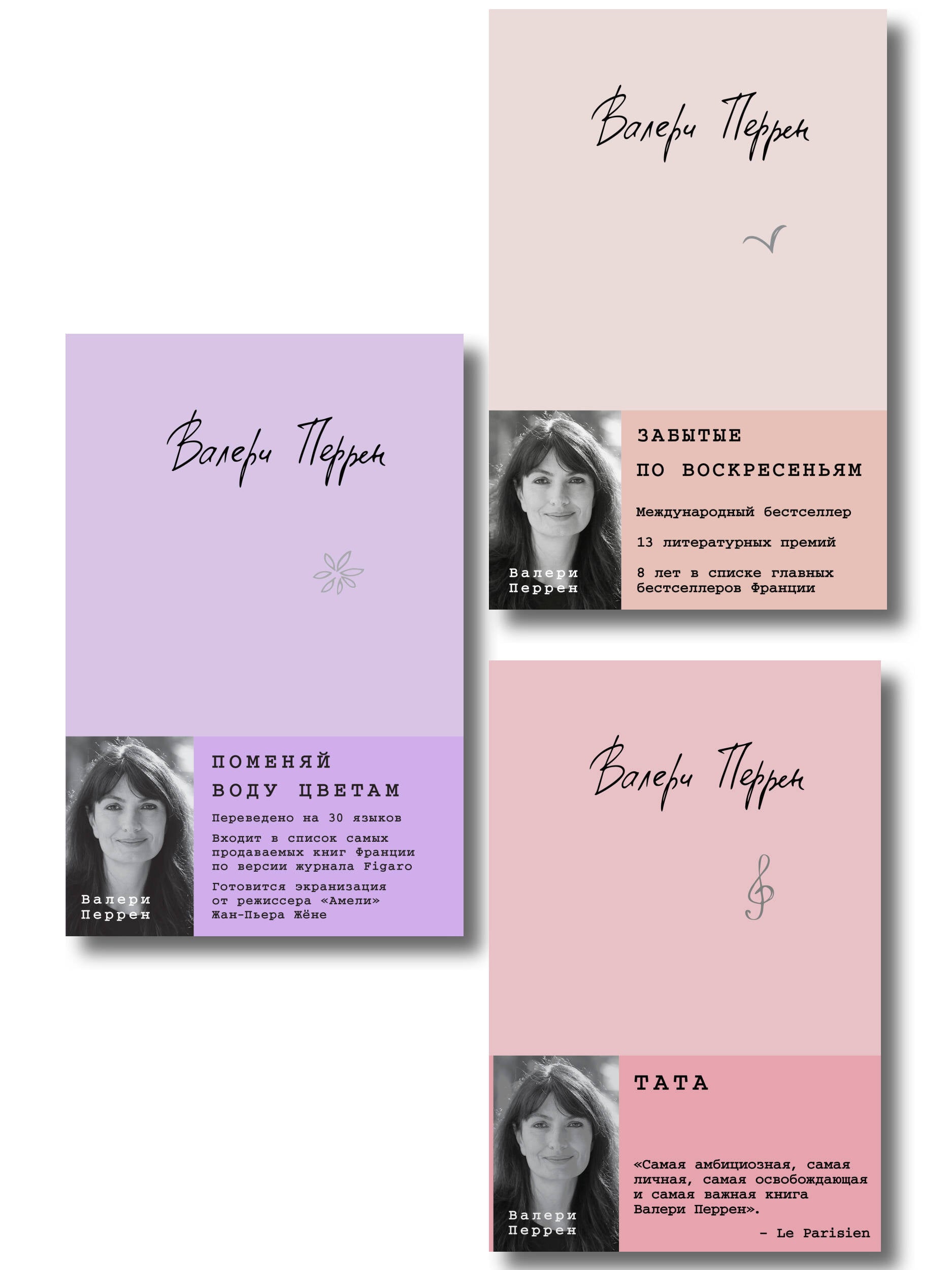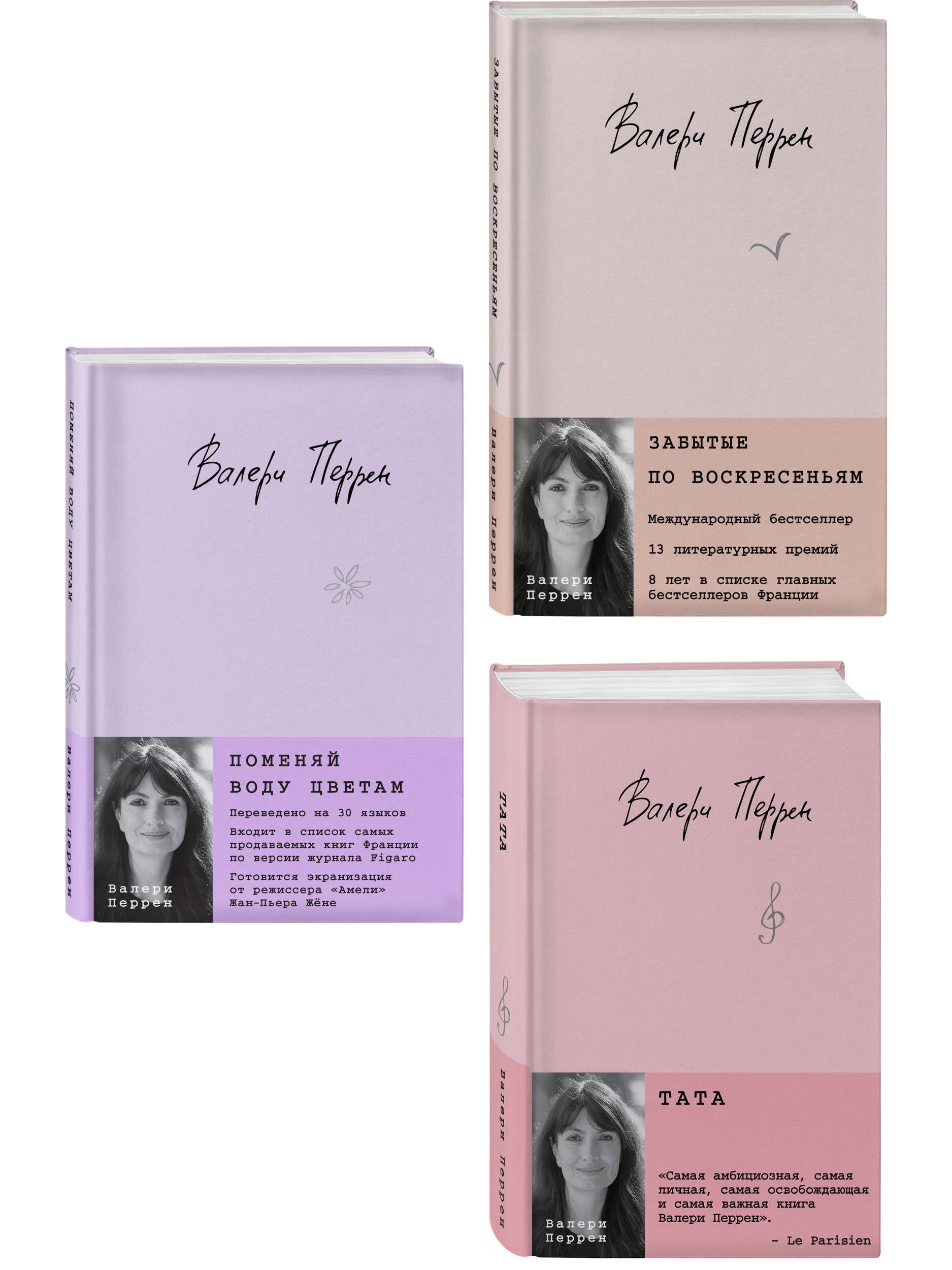 Комплект из трех романов Валери Перрен «Поменяй воду цветам», «Тата», «Забытые по воскресеньям». Книги Валери Перрен надежно занимают первые строчки бестселлеров Франции. Она автор, фотограф и сценарист, работающий со всемирно известным кинорежиссером Клодом Лелушем. Его фильм «Мужчина и женщина» получил «Золотую пальмовую ветвь» Каннского кинофестиваля и два Оскара. Роман «Поменяй воду цветам» получил широкое признание в европейском литературном сообществе. Он был отмечен несколькими премиями, в том числе престижной «Prix Maison de la Presse 2018». Роман переведен на 30 языков и входит в список самых продаваемых книг Франции по версии журнала «Figaro». Готовится экранизация от режиссера «Амели» Жан-Пьера Жёне. «Поменяй воду цветам» - это роман о чувствах, понятных каждому, и о торжестве жизни над смертью. Валери Перрен исцеляет душу читателя, проращивая в ней сад прекрасных цветов, освещенных солнечными лучами надежды. «Если бы каждый раз, когда я думаю о тебе, распускался хотя бы один цветок, земля стала бы огромным садом». Как быть, если кажется, что все потеряно и пережить несчастья невозможно? Виолетта Туссен решается на то, что в прошлой жизни показалось бы ей абсурдным: соглашается на должность смотрительницы кладбища. Виолетта знакомится с завсегдатаями этого необычного места, которые не прочь зайти к ней погреться в промозглый день, выпить чашечку кофе и поговорить о жизни. Как ни странно, в этом невеселом месте Виолетта понимает: любовь к людям и жизни способна спасти человека от всего на свете. Главное - не отказываться от самых смелых и порой даже сумасшедших поступков. «Прекрасный баланс драмы и юмора». - LIRE Первый роман Валери Перрен «Забытые по воскресеньям» стал международным бестселлером, получил 13 литературных наград и вот уже 8 лет держится в списке главных книг Франции. Это история о том, как прошлое формирует настоящее, а еще это история о шрамах, которые способна оставить любовь. Та, что зовется любовью всей жизни. «Воскресенье - день посещений. Не для всех. Воскресенье - сложный день. Каждое воскресенье старики точно знают, какой день недели наступил». Жюстин Неж двадцать один. Она живет с бабушкой, дедушкой и братом Жюлем. Жюстин работает в доме престарелых «Гортензии» и больше всего на свете любит разговаривать с его обитателями. Ее любимица - Элен, ей за девяносто, и ее воспоминания заслуживают отдельного романа. Рассказы Элен побуждают Жюстин встретиться лицом к лицу с тайнами своего прошлого и пережить потерю, которую она прячет глубоко внутри. Неожиданный анонимный звонок в дом престарелых меняет жизнь самой Жюстин навсегда. «Очаровательная героиня, удивительный мир, талантливая рассказчица». - ELLE «Тата» - роман для тех, кто ищет тепло, поддержку и веру в лучшее. Эта история останется с вами надолго и напомнит: иногда самое главное - просто быть рядом. Долгожданная новинка Валери Перрен, самой любимой писательницы французов, переведенная на несколько языков. Тата - (ударение на последний слог) во французсом языке ласковое и неформальное обращение к родной тете. Часто используется детьми и взрослыми, чтобы подчеркнуть особую близкую связь и выразить силу любви. «Скончалась ваша тетя», - сообщает голос полицейского. Но Аньес понимает: это невозможно, ведь Колетт умерла три года назад. Ошибка? Совпадение имен? Чтобы опо