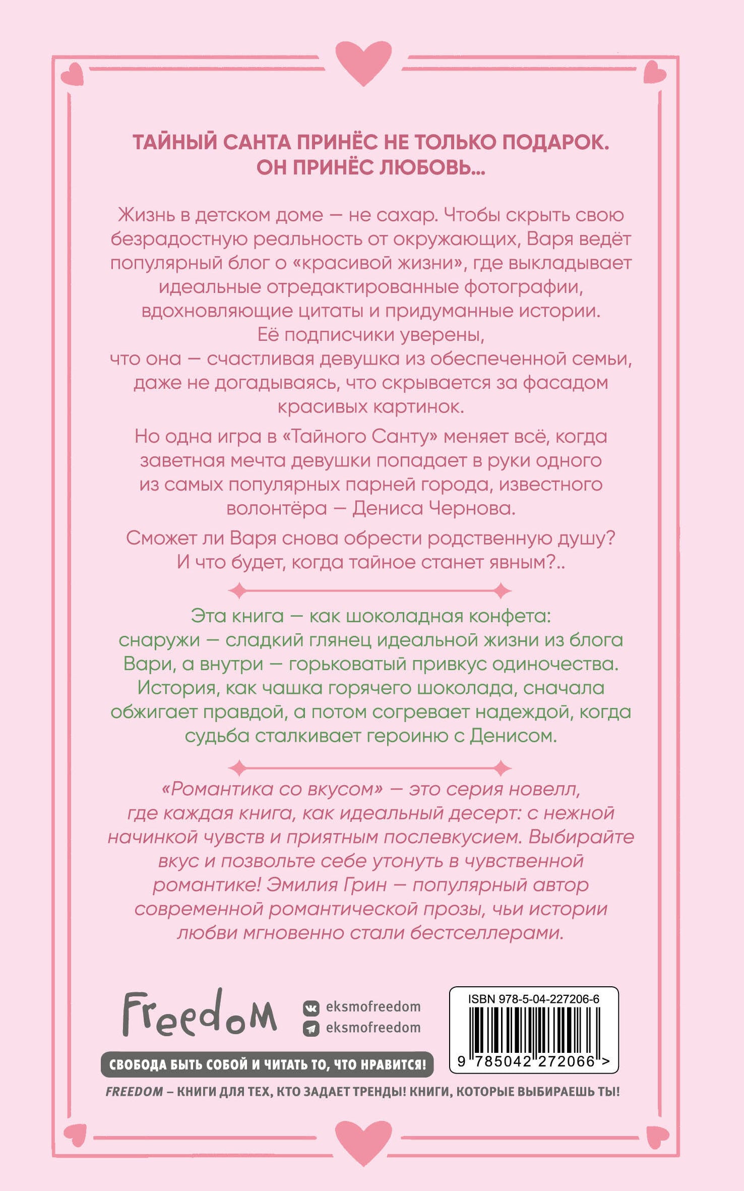 «Романтика со вкусом» - это серия новелл, где каждая книга, как идеальный десерт: с нежной начинкой чувств и приятным послевкусием. Стильное оформление: яркая обложка с клапанами, блестящим лаком и фольгой, а также атмосферное внутреннее оформление. Выбирайте вкус и позвольте себе утонуть в чувственной романтике от популярных авторов современной любовной прозы Ники Сью, Эмилии Грин, Лины Винчестер! «Поцелуй под снегом» Она - будущая золотая медалистка, чья жизнь расписана по минутам: идеальные оценки, безупречная репутация, поступление в элитный вуз. Он - бунтарь без правил. Прогулы и дерзкий взгляд давно стали его визитной карточкой. Их миры не пересекались, пока случайное поручение передать задания от классного руководителя не столкнуло их судьбы в один морозный зимний день. Теперь Надя в эпицентре сплетен, ее репутация трещит по швам, а одноклассники шепчутся за спиной. Выпускной класс, который должен был стать ее триумфом, превращается в минное поле. Но Илья, неожиданно для всех, решает сыграть по своим правилам: он ведет себя так, будто Надя - его девушка. Зачем ему это? Чтобы спасти ее или окончательно уничтожить? «Укради мое сердце, Тайный Санта!» Жизнь в детском доме - не сахар. Чтобы скрыть свою безрадостную реальность от окружающих, Варя ведет популярный блог о «красивой жизни», где выкладывает идеальные отредактированные фотографии, вдохновляющие цитаты и придуманные истории. Ее подписчики уверены, что она - счастливая девушка из обеспеченной семьи, даже не догадываясь, что скрывается за фасадом красивых картинок. Но одна игра в «Тайного Санту» меняет все, когда заветная мечта девушки попадает в руки одного из самых популярных парней города, известного волонтера - Дениса Чернова. Сможет ли Варя снова обрести родственную душу? И что будет, когда тайное станет явным?.. «Притворись моим на Рождество» Беверли Кларк ненавидит Рождество по многим причинам. В этом году она особенно сильно не хочет приезжать домой. Помимо состязания со старшей сестрой за внимание родителей, придется терпеть замечания и гиперопеку мамы, соревноваться с соседями за самый красиво украшенный дом по Гринвуд-Лэйн и обойти всех в рождественских песнопениях. А еще надо как-то оправдать ложь, ведь в последние месяцы Беверли врала о своей личной жизни, и теперь семья хочет познакомиться с ее потрясающим парнем. Беверли обращается за помощью к своему приятелю, Кайдену Маккею, одному из самых горячих парней кампуса, и просит его сыграть роль ее парня на Рождество.| Издательство | ООО "Издательство "Эксмо" |