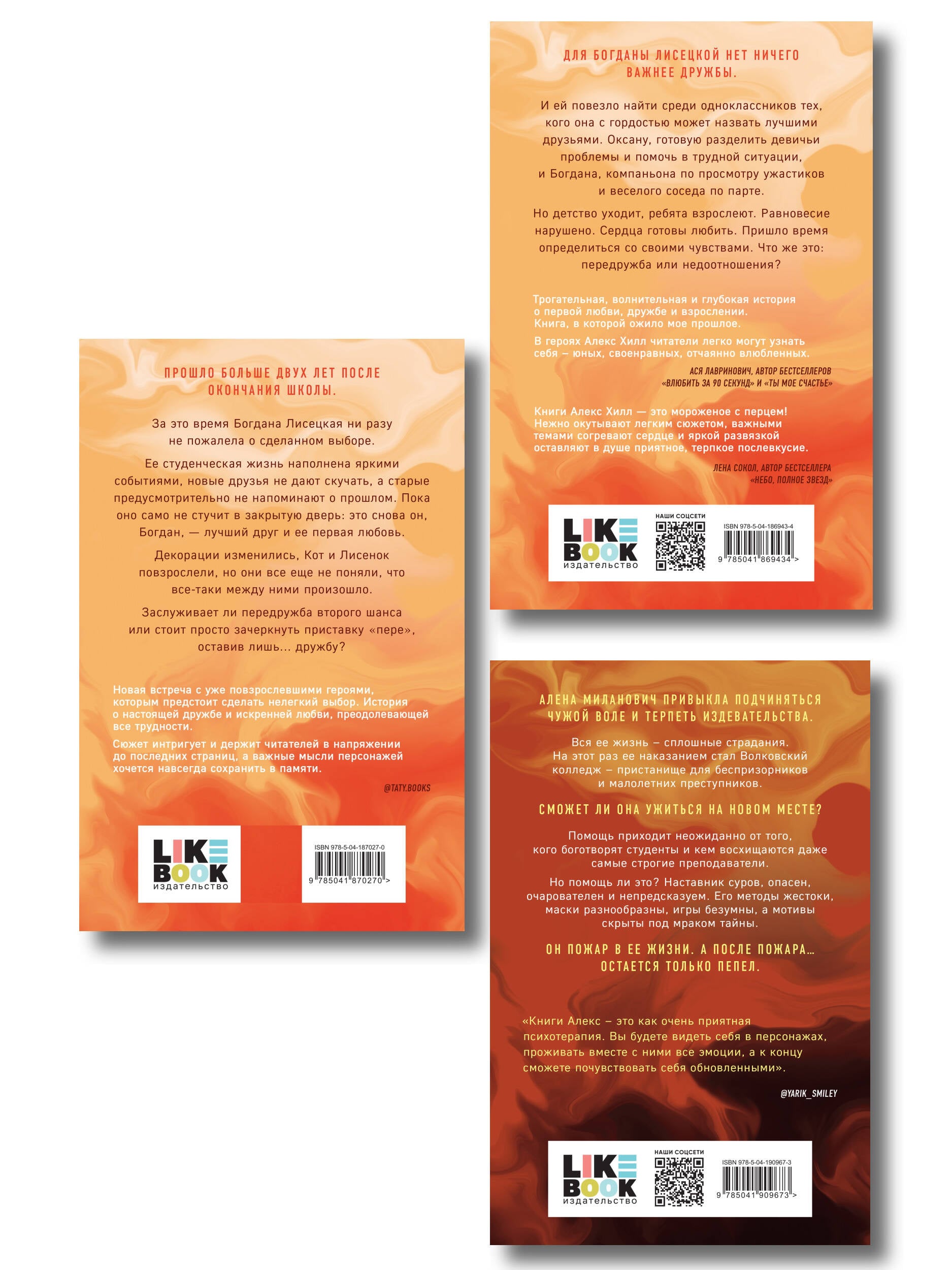 Комплект из книг Алекс Хилл в формате покета! «После тебя только пепел» Бестселлер Алекс Хилл «После тебя только пепел» теперь в удобном формате покета. Алена Миланович привыкла подчиняться чужой воле и терпеть издевательства. Вся ее жизнь - сплошные страдания. На этот раз ее наказанием стал Волковский колледж - пристанище для беспризорников и малолетних преступников. Сможет ли она ужиться на новом месте? Помощь приходит неожиданно, от того, кого боготворят студенты и кем восхищаются даже самые строгие преподаватели. Но помощь ли это? Наставник суров, опасен, очарователен и непредсказуем. Его методы жестоки, маски разнообразны, игры безумны, а мотивы скрыты под мраком тайны. Он - пожар в ее жизни. А после пожара… остается только пепел. «После тебя только пепел» - остросоциальный роман о поиске себя, преодолении страхов и ежедневном выборе, который определяет нашу жизнь. «Передружба. Недоотношения» Самый читаемый роман Алекс Хилл! Нежная и трогательная история о том, как детская привязанность перерождается во что-то более сильное и глубокое. Это книга о взрослении, первой влюбленности и поиске себя. Для Богданы Лисецкой нет ничего важнее дружбы. И ей повезло найти среди одноклассников тех, кого она с гордостью может назвать лучшими друзьями: Оксану, готовую разделить девичьи проблемы и помочь в трудной ситуации, и Богдана, компаньона по просмотру ужастиков и веселого соседа по парте. Но детство уходит, ребята взрослеют. Равновесие нарушено. Сердца готовы любить. Пришло время определиться со своими чувствами. Что же это: передружба или недоотношения? Ася Лавринович, автор бестселлеров «Влюбить за 90 секунд» и «Ты мое счастье»: «Трогательная, волнительная и глубокая история о первой любви, дружбе и взрослении. Книга, в которой ожило мое прошлое. В героях Алекс Хилл читатели легко могут узнать себя - юных, своенравных, отчаянно влюбленных. И это прекрасно». Лена Сокол, автор бестселлера «Небо, полное звезд»: «Книги Алекс - это мороженое с перцем! Нежно окутывают легким сюжетом, важными темами согревают сердце и яркой развязкой оставляют в душе приятное, терпкое послевкусие». «Передружба. Второй шанс» Прошло больше двух лет после окончания школы. За это время Богдана Лисецкая ни разу не пожалела о сделанном выборе. Ее студенческая жизнь наполнена яркими событиями, новые друзья не дают скучать, а старые предусмотрительно не напоминают о прошлом. Пока оно само не стучит в закрытую дверь: это снова он, Богдан - лучший друг и ее первая любовь. Декорации изменились, Кот и Лисенок повзрослели, но они все еще не поняли, что все-таки между ними произошло? Заслуживает ли передружба второго шанса или стоит просто зачеркнуть приставку пере-, оставив лишь... дружбу? Узнаваемое серийное оформление, фирменный авторский слог и неожиданные сюжетные повороты! Героям снова предстоит сделать непростой выбор, остаться собой и не потерять любимых.| Издательство | ООО "Издательство "Эксмо" |