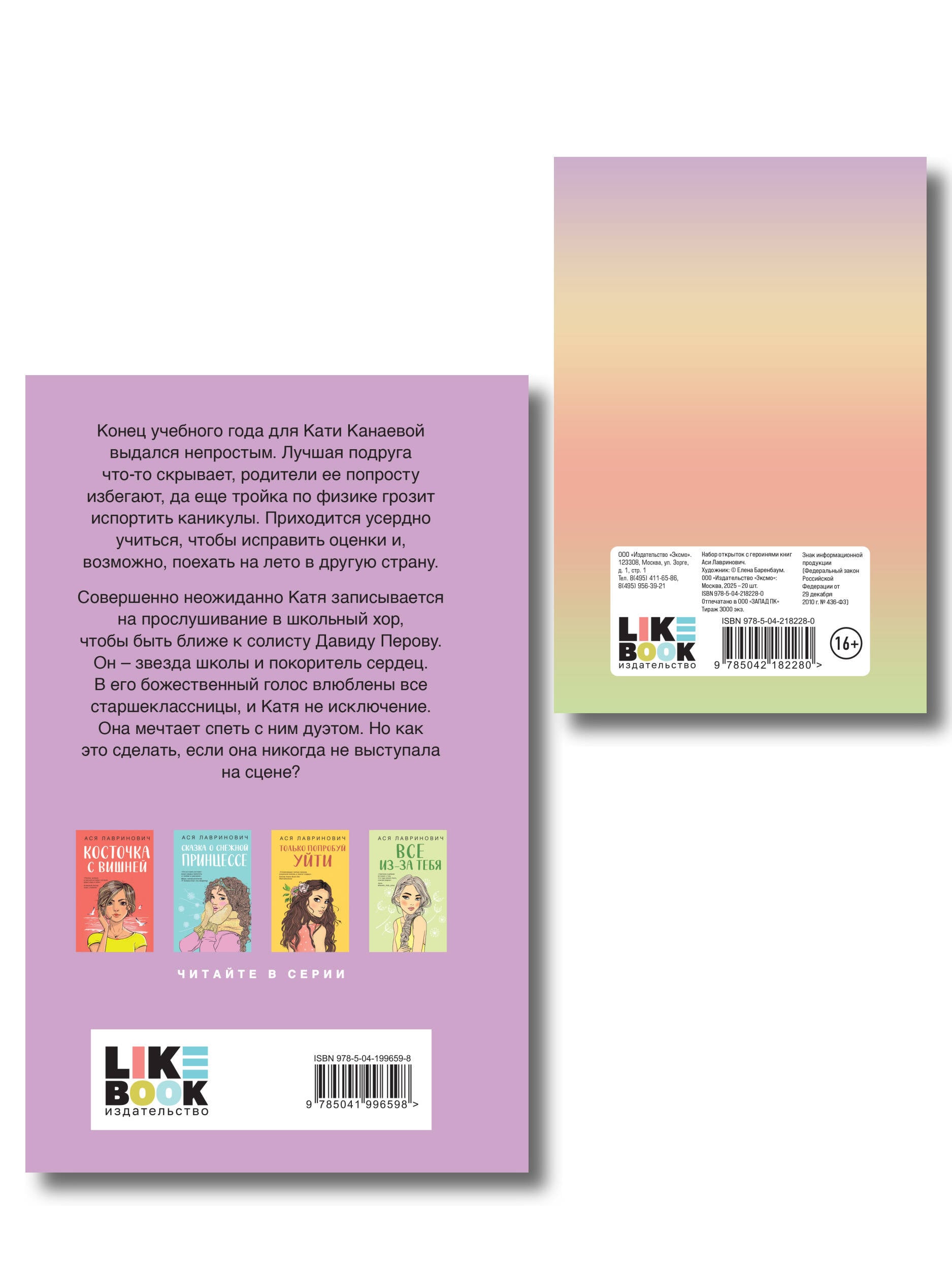 Комплект: Набор открыток с героинями книг Аси Лавринович + «Планы на лето» «Планы на лето» «Уютная история о первой любви, дружбе, самопознании и важности мелочей в нашей жизни». - Книжный блогер Алина Book Star, alinabookstar Конец учебного года для Кати Канаевой выдался непростым. Лучшая подруга что-то скрывает, родители ее попросту избегают, да еще тройка по физике грозит испортить каникулы. Приходится усердно учиться, чтобы исправить оценки и, возможно, поехать на лето в другую страну. Совершенно неожиданно Катя записывается на прослушивание в школьный хор, чтобы быть ближе к солисту Давиду Перову. Он - звезда школы и покоритель сердец. В его божественный голос влюблены все старшеклассницы, и Катя не исключение. Она мечтает спеть с ним дуэтом. Но как это сделать, если она никогда не выступала на сцене? В комплекте с книгой идет набор из 20 красивых открыток с девочками из романов Аси Лавринович, звезды молодежной литературы. Здесь есть не только уже известные и полюбившиеся героини, но и совершенно новые персонажи, созданные потрясающей художницей Еленой Баренбаум. Прекрасный подарок для всех поклонников творчества Аси! Какая из них похожа на тебя? Об авторе Ася Лавринович - один из самых популярных авторов российского янг эдалта в жанре современной сентиментальной прозы. Суммарный тираж ее проданных книг составляет более 1,6 млн экземпляров. Победитель премии «Выбор читателей 2023» на Livelib в номинации «Young adult. Лучшая книга о подростках и для подростков». На две книги Аси - «Загадай любовь» и «Нелюбовь сероглазого короля» - куплены права на экранизацию. А сериал по «Загадай любовь» уже можно посмотреть в онлайн-кинотеатре Okko.| Издательство | ООО "Издательство "Эксмо" |
