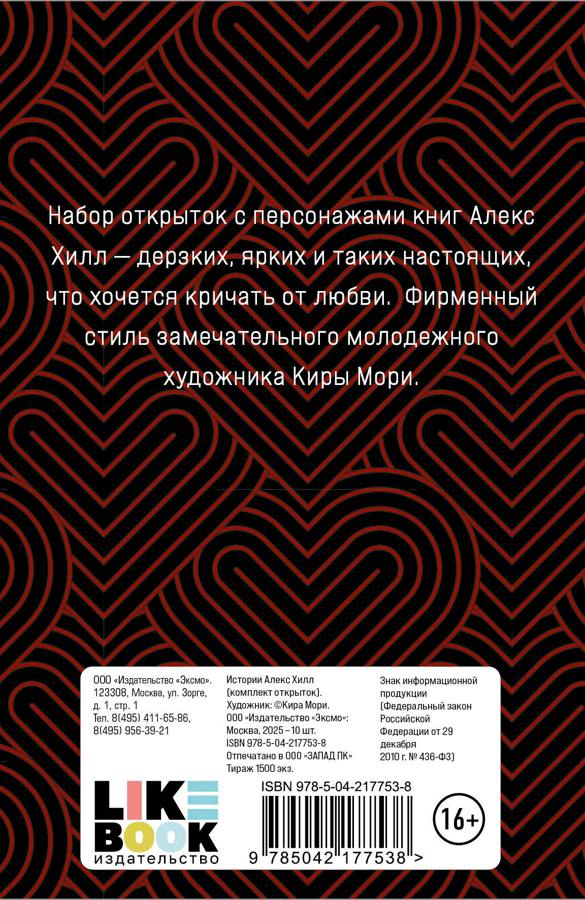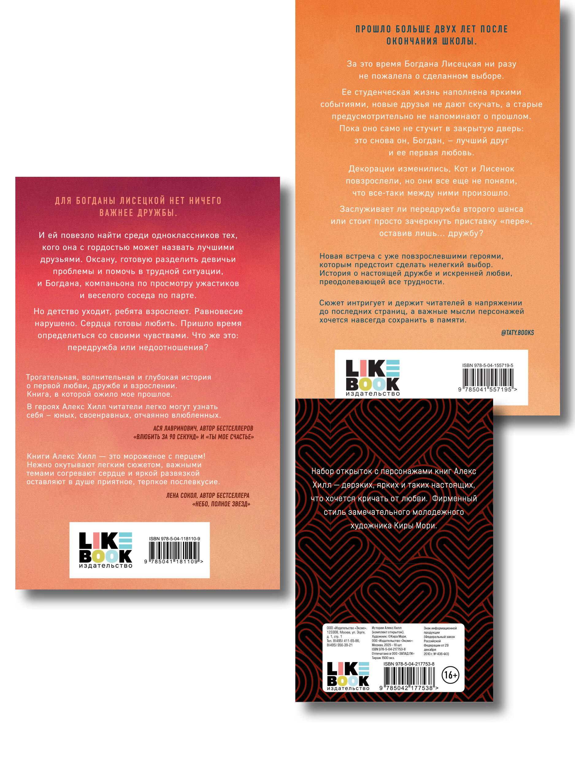 Комплект: «Передружба. Недоотношения» + «Передружба. Второй шанс» + «Истории Алекс Хилл (комплект открыток)» «Передружба. Недоотношения» Новинка от соавтора «Худших подруг» Алекс Хилл! Нежная и трогательная история о том, как детская привязанность перерождается во что-то более сильное и глубокое. Это книга о взрослении, первой влюбленности и поиске себя. Для Богданы Лисецкой нет ничего важнее дружбы. И ей повезло найти среди одноклассников тех, кого она с гордостью может назвать лучшими друзьями: Оксану, готовую разделить девичьи проблемы и помочь в трудной ситуации, и Богдана, компаньона по просмотру ужастиков и веселого соседа по парте. Но детство уходит, ребята взрослеют. Равновесие нарушено. Сердца готовы любить. Пришло время определиться со своими чувствами. Что же это: передружба или недоотношения? Ася Лавринович, автор бестселлеров «Влюбить за 90 секунд» и «Ты мое счастье»: «Трогательная, волнительная и глубокая история о первой любви, дружбе и взрослении. Книга, в которой ожило мое прошлое. В героях Алекс Хилл читатели легко могут узнать себя - юных, своенравных, отчаянно влюбленных. И это прекрасно». Лена Сокол, автор бестселлера «Небо, полное звезд»: «Книги Алекс - это мороженое с перцем! Нежно окутывают легким сюжетом, важными темами согревают сердце и яркой развязкой оставляют в душе приятное, терпкое послевкусие». «Передружба. Второй шанс» Прошло больше двух лет после окончания школы. За это время Богдана Лисецкая ни разу не пожалела о сделанном выборе. Ее студенческая жизнь наполнена яркими событиями, новые друзья не дают скучать, а старые предусмотрительно не напоминают о прошлом. Пока оно само не стучит в закрытую дверь: это снова он, Богдан - лучший друг и ее первая любовь. Декорации изменились, Кот и Лисенок повзрослели, но они все еще не поняли, что все-таки между ними произошло? Заслуживает ли передружба второго шанса или стоит просто зачеркнуть приставку пере-, оставив лишь... дружбу? Продолжение полюбившейся читателям истории от автора бестселлера «Передружба. Недоотношения» Алекс Хилл! Кот и Лисенок повзрослели, их пути разошлись, они больше не школьные друзья, не пара, у каждого своя жизнь. Внезапная встреча рушит все планы, вскрывает старые раны, чувства вспыхивают с новой силой. Но Богдана Лисецкая не намерена повторять историю. Она хочет идти дальше, не оглядываясь назад. Вот только удастся ли ей это, когда она вновь увидит знакомые серые глаза? Узнаваемое серийное оформление, фирменный авторский слог и неожиданные сюжетные повороты! Героям снова предстоит сделать непростой выбор, остаться собой и не потерять любимых. Эта книга - чудесный подарок для поклонников Аси Лавринович и Лены Сокол! «Истории Алекс Хилл (комплект открыток)» ОТКРЫТКИ ПО ИСТОРИЯМ АЛЕКС ХИЛЛ! ГЕРОИ БЕСТСЕЛЛЕРОВ СЕНТИМЕНТАЛЬНОЙ ПРОЗЫ! Вера в чудо - это прекрасно, но вера в себя - куда сильнее. А любовь… Любовь - это то самое топливо, которое придаст сил в трудные времена. Создавайте ее и защищайте. Купайтесь в ней и дарите. Ее запас неисчерпаем. Ее точно хватит на всех. Набор открыток с персонажами книг Алекс Хилл - дерзких, ярких и таких настоящих, что хочется кричать от любви. Фирменный стиль замечательного молодежного художника Киры Мори, качественные материалы, приятные глазу цвета. В набор входят 10 красивых и качественных открыток. Одн