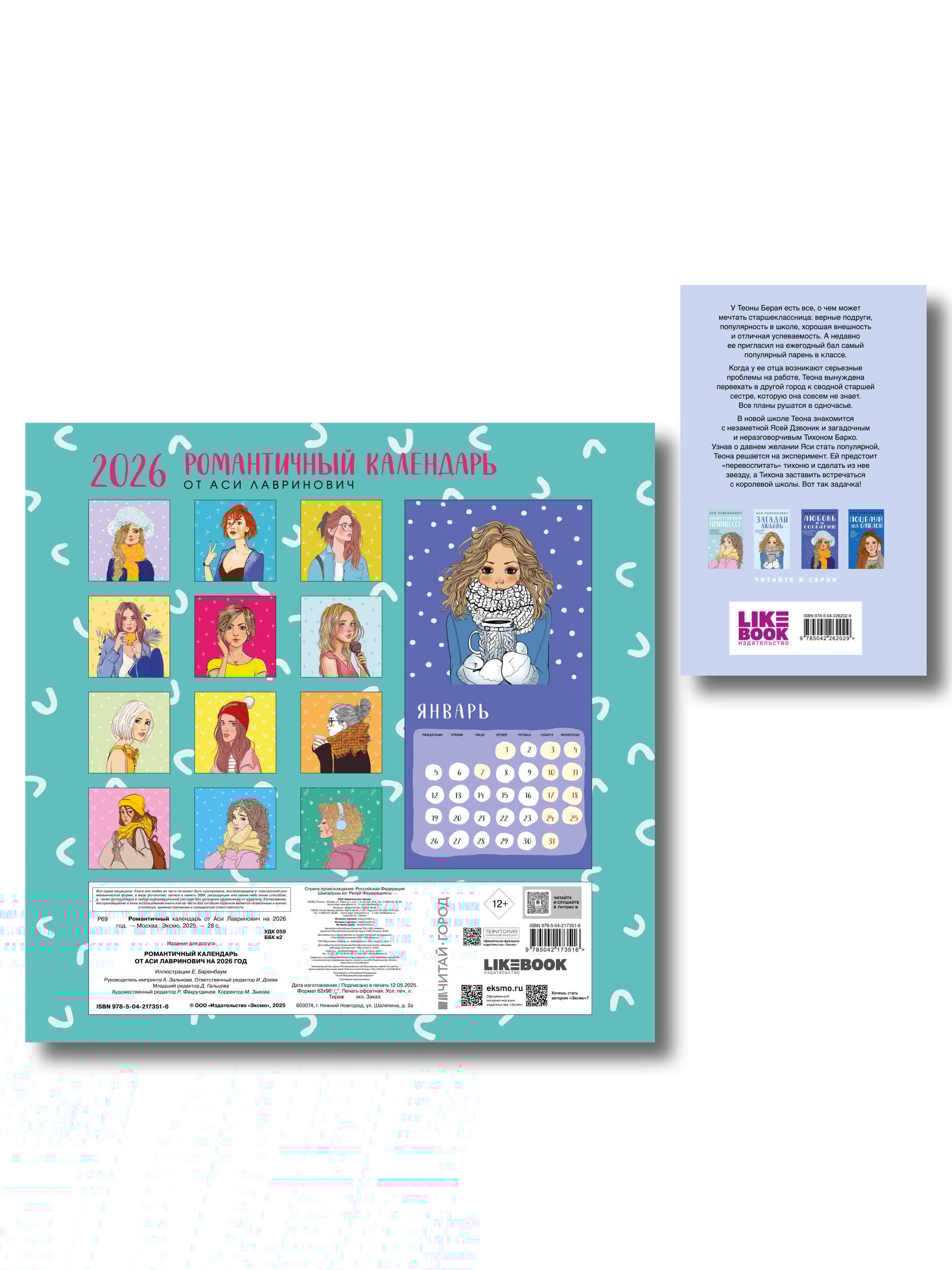Комплект: «Перевоспитать Тихоню» + «Романтичный календарь от Аси Лавринович на 2026 год» «Перевоспитать Тихоню» ЗИМНЯЯ НОВИНКА ОТ АСИ ЛАВРИНОВИЧ, САМОГО ПОПУЛЯРНОГО СОВРЕМЕННОГО ЯНГ-ЭДАЛТ АВТОРА! Суммарный тираж ее книг уже более 1 МИЛЛИОНА проданных экземпляров! Один зимний бал. Одна милая карликовая свинка. И одна маленькая ложь, которая перевернет все с ног на голову. Этот Новый год станет незабываемым! У Теоны Берая есть все, о чем может мечтать старшеклассница: верные подруги, популярность в школе, хорошая внешность и отличная успеваемость. А недавно ее пригласил на ежегодный бал самый популярный парень в классе. Когда у ее отца возникают серьезные проблемы на работе, Теона вынуждена переехать в другой город к сводной старшей сестре, которую она совсем не знает. Все планы рушатся в одночасье. В новой школе Теона знакомится с незаметной Ясей Дзвоник и загадочным и неразговорчивым Тихоном Барко. Узнав о давнем желании Яси стать популярной, Теона решается на эксперимент. Ей предстоит «перевоспитать» тихоню и сделать из нее звезду, а Тихона - заставить встречаться с королевой школы. Вот так задачка! Об авторе Ася Лавринович - один из самых популярных авторов российского янг-эдалта в жанре современной сентиментальной прозы. Суммарный тираж ее проданных книг составляет более 1 млн экземпляров. Победитель премии «Выбор читателей 2023» на Livelib в номинации «Young Adult. Лучшая книга о подростках и для подростков». На две книги Аси - «Загадай любовь» и «Нелюбовь сероглазого короля» - куплены права на экранизацию от ОККО. «Романтичный календарь от Аси Лавринович на 2026 год» Романтичный календарь от Аси Лавринович, самого милого и позитивного автора. Каждый месяц встретит вас яркими красками и очаровательными героинями из разных книг. Календарь непременно подойдет всем любителям творчества писательницы. А роскошные и красочные иллюстрации Елены Баренбаум станут идеальным украшением любого интерьера. Технические параметры: - Тип календаря - настенный перекидной. - Год - 2026. - Календарная сетка - с разбивкой по месяцам. - Вид скрепления - скрепка. - Ширина - 30 см. - Высота - 30 см. - Внутренний блок - мелованная бумага 150 г/м2. - Подложка - плотный гофрокартон для поддержания формы. - Индивидуальная упаковка в плотный целлофановый пакет.| Издательство | ООО "Издательство "Эксмо" |