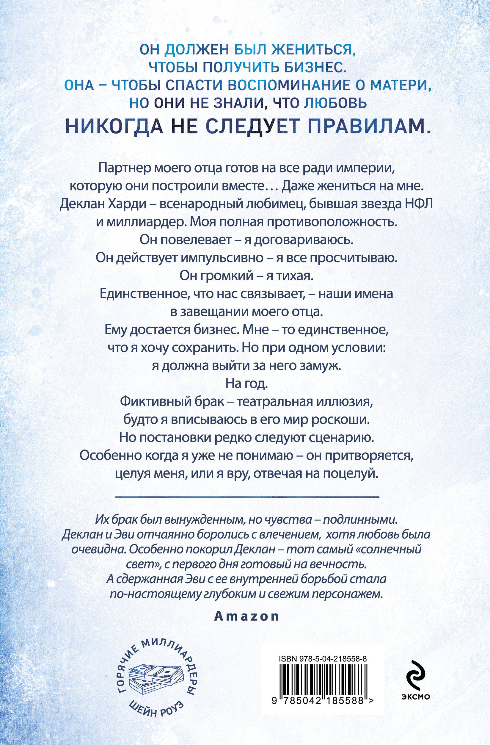 Шейн Роуз представляет пылкую историю о фиктивном браке, где за холодным расчётом скрывается жаркая страсть! Деклан Харди и я - два полюса. Он - громкий и властный миллиардер, я - тихая и прагматичная наследница. Нас навсегда связало завещание отца. Теперь его империя принадлежит ему, а моё сокровище - мне, но при одном условии: я должна на год выйти за него замуж. Наш брак - лишь декорация, красивая ширма. Но под маской безразличия таится притяжение, которое мы не в силах контролировать. Теперь я не знаю, что опаснее: сорваться самой или дать сорваться ему? Под обложкой этой книги - ваши любимые тропы: «фиктивный брак», «вынужденная близость», «враги-возлюбленные», «босс/подчинённая». Идеальное чтение для поклонников эмоциональных и сложных отношений!| Издательство | ООО "Издательство "Эксмо" |