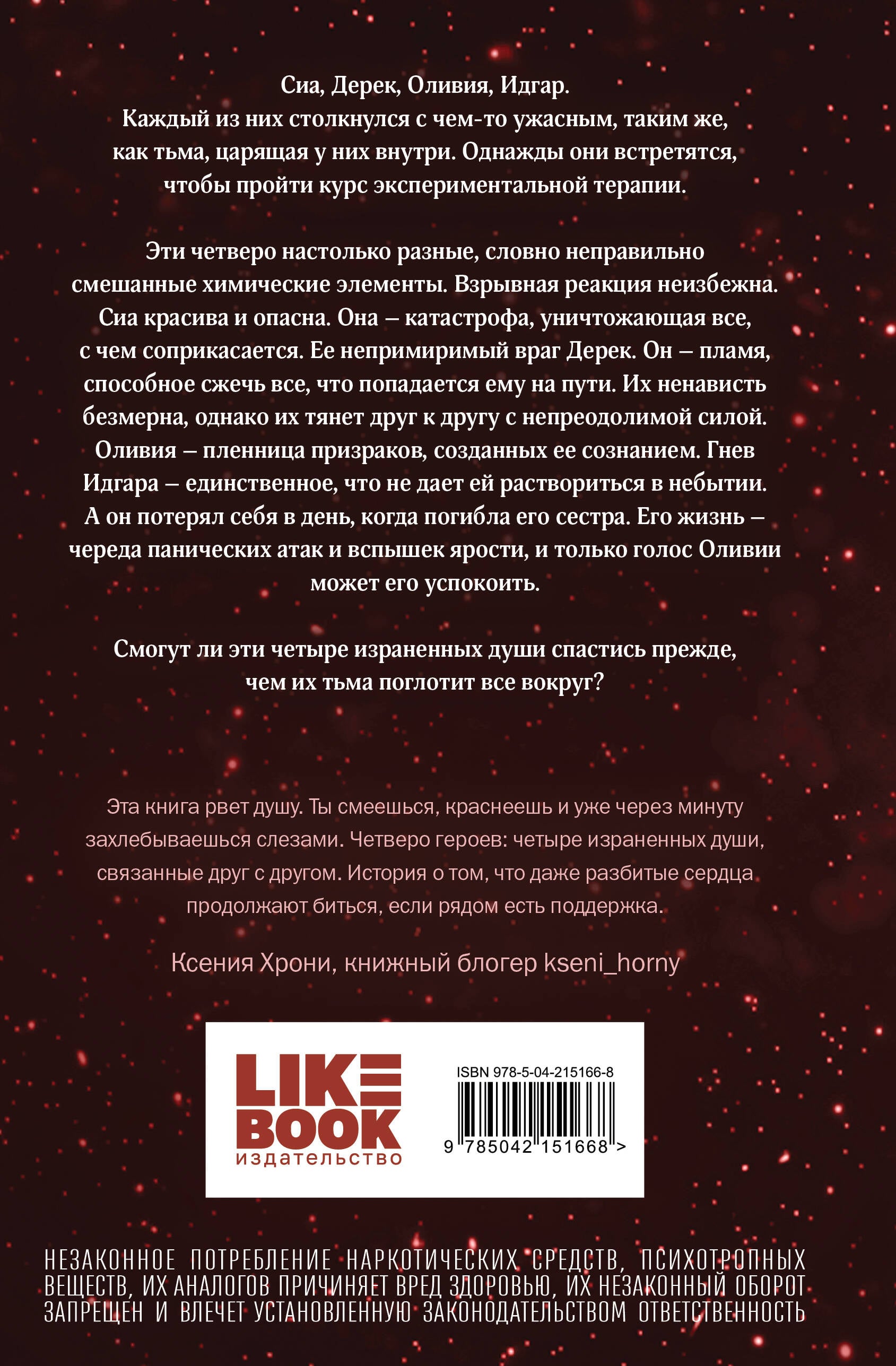 НЕЗАКОННОЕ ПОТРЕБЛЕНИЕ НАРКОТИЧЕСКИХ СРЕДСТВ, ПСИХОТРОПНЫХ ВЕЩЕСТВ, ИХ АНАЛОГОВ ПРИЧИНЯЕТ ВРЕД ЗДОРОВЬЮ, ИХ НЕЗАКОННЫЙ ОБОРОТ ЗАПРЕЩЕН И ВЛЕЧЕТ УСТАНОВЛЕННУЮ ЗАКОНОДАТЕЛЬСТВОМ ОТВЕТСТВЕННОСТЬ. ОТ ОДНОГО ИЗ САМЫХ ПОПУЛЯРНЫХ АВТОРОВ В ИТАЛИИ. ДАРК РОМАНС О ЗАПРЕТНЫХ ЖЕЛАНИЯХ, ТАЙНАХ ПРОШЛОГО И БОРЬБЕ С ВНУТРЕННИМИМ ДЕМОНАМИ. ИДЕАЛЬНОЕ ЧТЕНИЕ ДЛЯ ПОКЛОННИКОВ ТЕМНОЙ РОМАНТИКИ И БЕСТСЕЛЛЕРА «ТВОРЕЦ СЛЕЗ» ЭРИН ДУМ. Даже из тьмы может родиться любовь. Сиа, Дерек, Оливия, Идгар. Каждый из них столкнулся с чем-то ужасным, таким же, как тьма, царящая у них внутри. Однажды они встретятся, чтобы пройти курс экспериментальной терапии. Эти четверо настолько разные, словно неправильно смешанные химические элементы. Взрывная реакция неизбежна. Сиа красива и опасна. Она - катастрофа, уничтожающая все, с чем соприкасается. Ее непримиримый враг - Дерек. Он - пламя, способное сжечь все, что попадается ему на пути. Их ненависть безмерна, однако их тянет друг к другу с непреодолимой силой. Оливия - пленница призраков, созданных ее сознанием. Гнев Идгара - единственное, что не дает ей раствориться в небытии. А он потерял себя в день, когда погибла его сестра. Его жизнь - череда панических атак и вспышек ярости, и только голос Оливии может его успокоить. Смогут ли эти четыре израненные души спастись прежде, чем их тьма поглотит все вокруг? «Эта книга рвет душу. Ты смеешься, краснеешь и уже через минуту захлебываешься слезами. Четверо героев: четыре израненные души, связанные друг с другом. История о том, что даже разбитые сердца продолжают биться, если рядом есть поддержка». - Ксения Хорни, книжный блогер kseni_horny| Издательство | ООО "Издательство "Эксмо" |