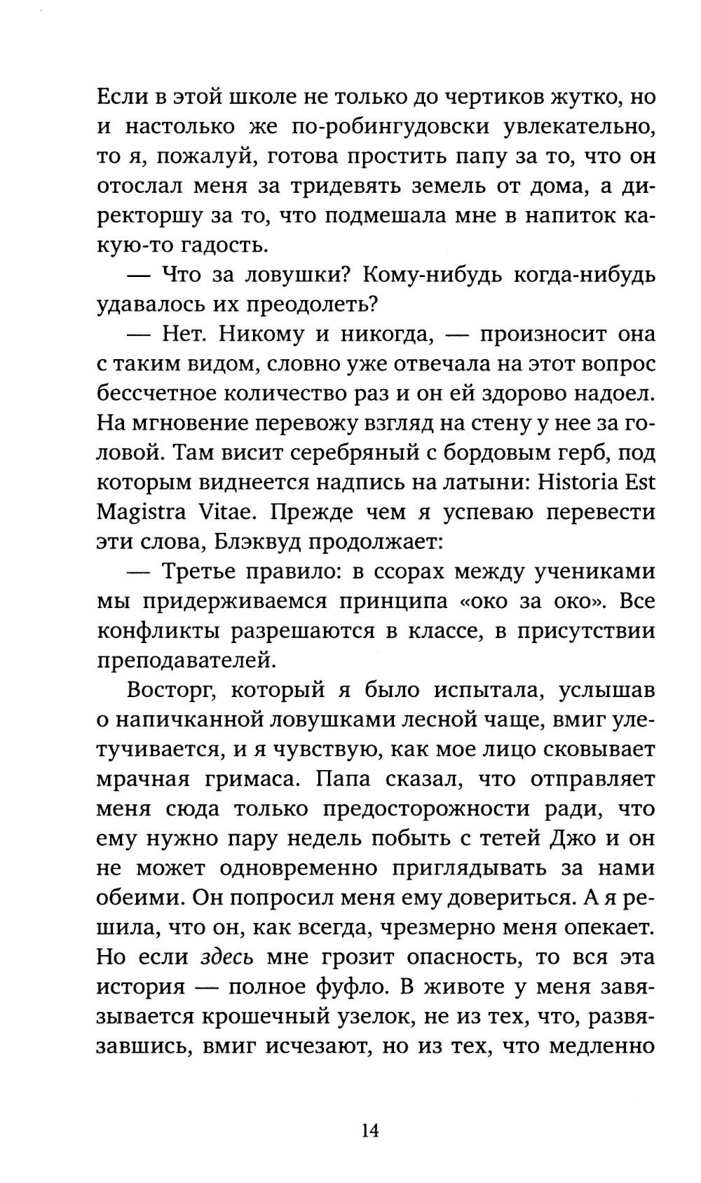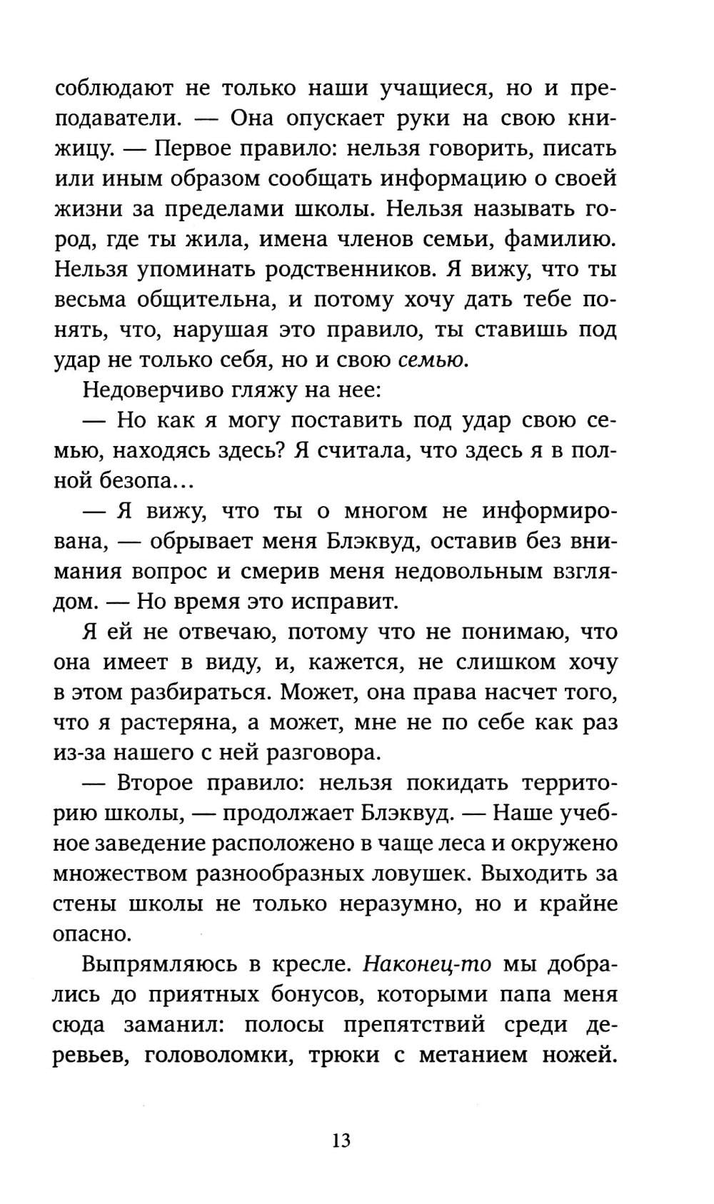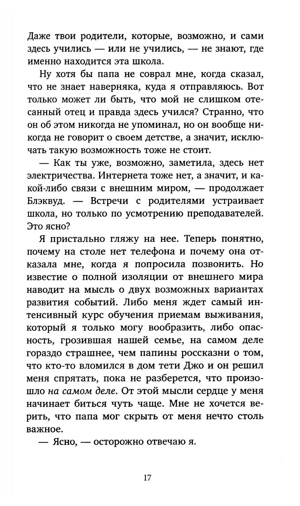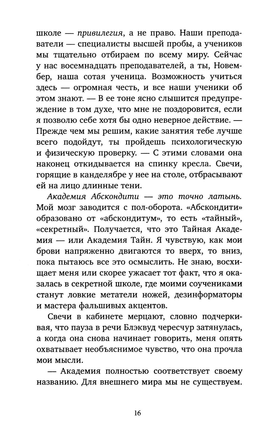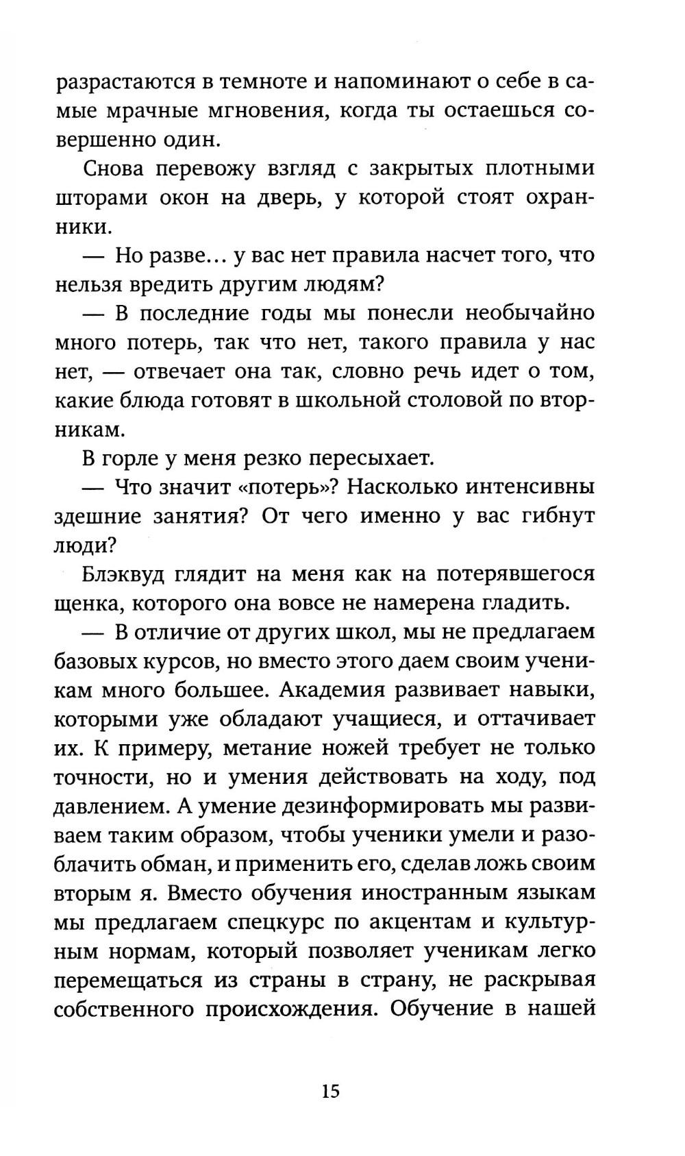 Однажды Новембер Эдли очнулась в старинном замке на краю света. Это ее новая школа? Без электричества, связи с внешним миром и возможности убежать. В загадочной академии обучают дезинформации, манипулированию, боевым искусствам, науке о ядах. Вместо друзей - лишь затаившиеся враги, вместо уроков - смертельные испытания. Единственный, кто настроен дружелюбно, - таинственный парень по имени Аш. Он читает Новембер словно открытую книгу, но сам не спешит раскрывать свои секреты. Все усложняется, когда погибает один из учеников и подозрение падает на Новембер. Сможет ли она найти настоящего убийцу, чтобы избежать смертного приговора и раскрыть тайны академии?| Издательство | Клевер |