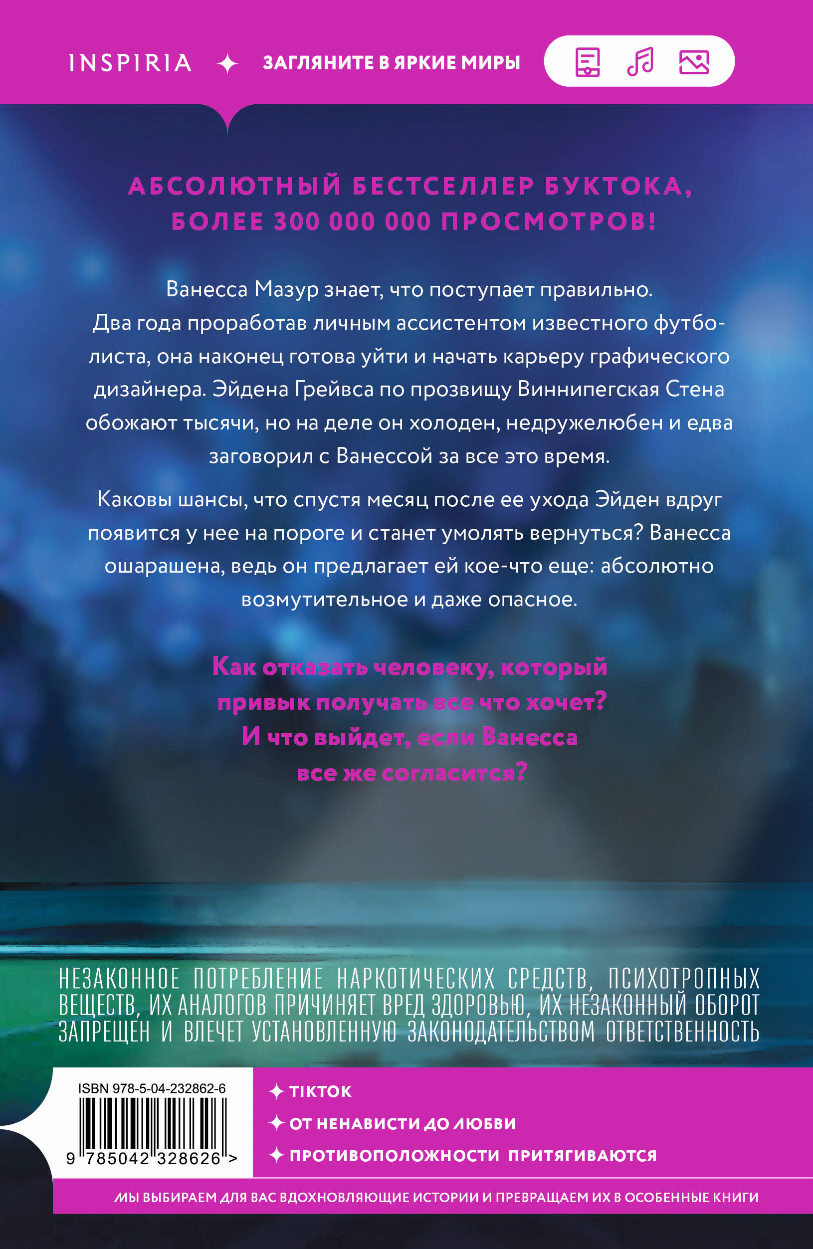 НЕЗАКОННОЕ ПОТРЕБЛЕНИЕ НАРКОТИЧЕСКИХ СРЕДСТВ, ПСИХОТРОПНЫХ ВЕЩЕСТВ, ИХ АНАЛОГОВ ПРИЧИНЯЕТ ВРЕД ЗДОРОВЬЮ, ИХ НЕЗАКОННЫЙ ОБОРОТ ЗАПРЕЩЕН И ВЛЕЧЕТ УСТАНОВЛЕННУЮ ЗАКОНОДАТЕЛЬСТВОМ ОТВЕТСТВЕННОСТЬ. Абсолютный бестселлер БукТока, более 300 000 000 просмотров! Он - звезда. Она - его тень. И они самая неподходящая друг другу пара. Ванесса Мазур знает, что поступает правильно. Два года проработав личным ассистентом известного футболиста, она наконец готова уйти и начать карьеру графического дизайнера. Эйдена Грейвса по прозвищу «Виннипегская стена» обожают тысячи, но на деле он холоден, недружелюбен и едва заговорил с Ванессой за все это время. Каковы шансы, что спустя месяц после ее ухода Эйден вдруг появится у нее на пороге и станет умолять вернуться? Ванесса ошарашена, ведь он предлагает ей кое-что еще: абсолютно возмутительное и даже опасное. Как отказать человеку, который привык получать все, что хочет? И что выйдет, если Ванесса все же согласится? «"Виннипегская стена и я" - это история о безусловном доверии. Она про то, что поступки гораздо важнее любых слов, и про то, что даже самую непробиваемую стену в одночасье может разрушить сила любви. Будьте готовы к тому, что ее герои украдут частичку вашего сердца, оставив взамен послевкусие абсолютного счастья». - Ава Хоуп, писательница, @avahopebooks «Книга, где нет места идеальным героям. Вы не сможете игнорировать безэмоционального Эйдена. Он - "стена", которую Ванессе придется не просто пробить, но и позаботиться о своем израненном сердце. Стилистика Запаты - это про неспешное раскрытие персонажей, медленное развитие любовной линии, про юмор и неизбитый сюжет. Мастхэв среди романов!» - Арина, книжный блогер, @maradyerbook
