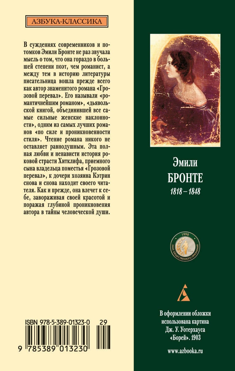 В суждениях современников и потомков Эмили Бронте (1818-1848) не раз звучала мысль о том, что она гораздо в большей степени поэт, чем романист, а между тем в историю литературы писательница вошла прежде всего как автор знаменитого романа "Грозовой перевал". Его называли "романтичнейшим романом", "дьявольской книгой, объединившей все самые сильные женские наклонности", одним из самых лучших романов "по силе и проникновенности стиля". Чтение романа никого не оставляет равнодушным. Эта полная любви и ненависти история роковой страсти Хитклифа, приемного сына владельца поместья "Грозовой перевал", к дочери хозяина Кэтрин снова и снова находит своего читателя. Как и прежде, она влечет к себе, завораживая своей красотой и поражая глубиной проникновения автора в тайны человеческой души.