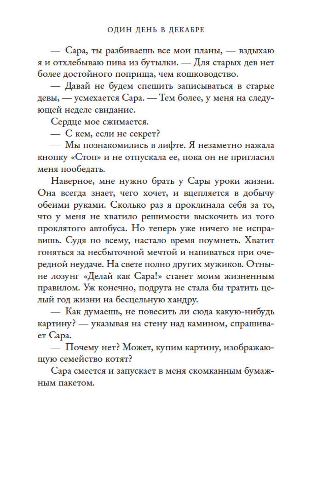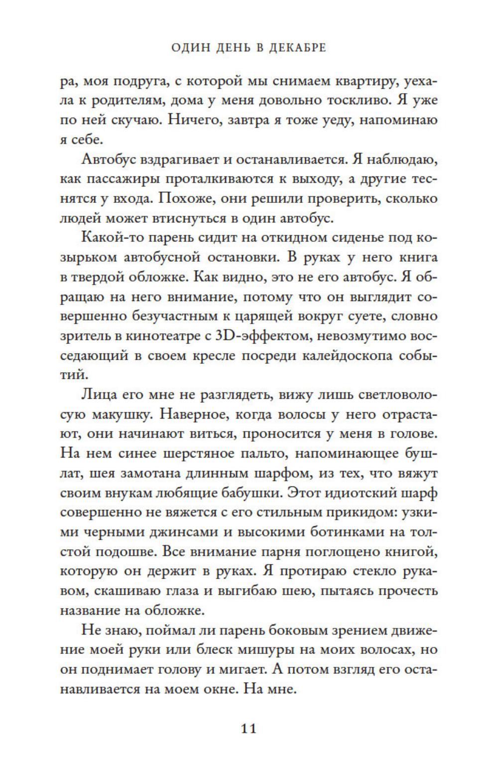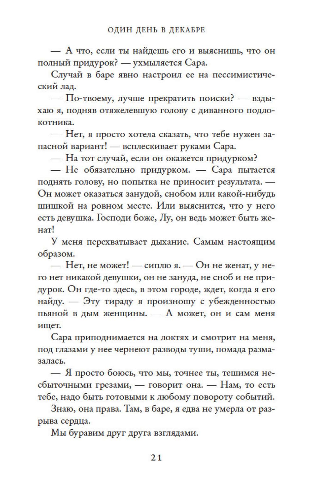 Лори уверена: любовь с первого взгляда существует только в фильмах. Но в один снежный декабрьский день через затуманенное окно автобуса она встречается взглядом с молодым человеком, и между ними пробегает искра. Лори понимает, что безнадежно влюбилась. В течение года она ищет этого молодого человека везде: на улицах Лондона, в метро, кафе, на автобусной остановке, - а находит на рождественской вечеринке, где ее лучшая подруга Сара знакомит Лори со своим новым бойфрендом. Им оказывается Джек, тот самый парень с автобусной остановки... «Один день в декабре» - это радостная, трогательная и невероятно волнующая история любви, показывающая, что судьба закручивает невероятные виражи на пути к счастью.| Издательство | Иностранка |
