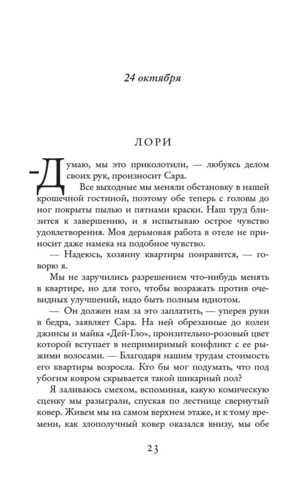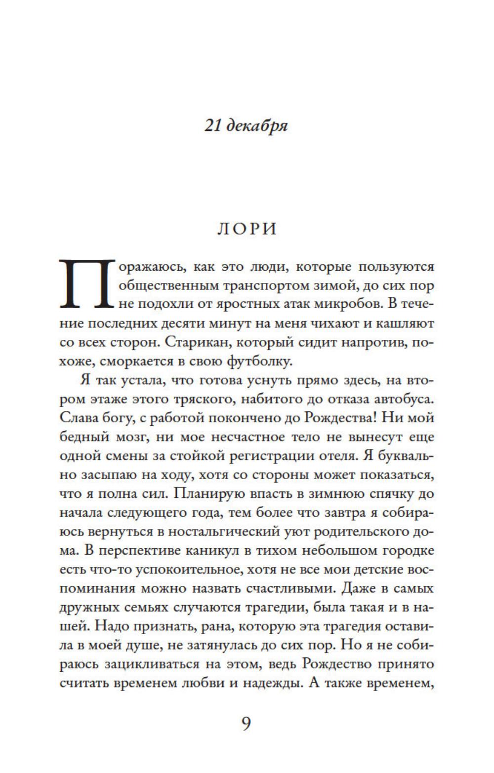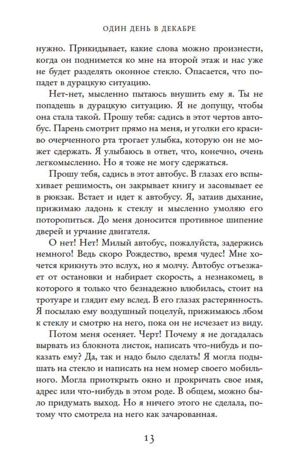 Лори уверена: любовь с первого взгляда существует только в фильмах. Но в один снежный декабрьский день через затуманенное окно автобуса она встречается взглядом с молодым человеком, и между ними пробегает искра. Лори понимает, что безнадежно влюбилась. В течение года она ищет этого молодого человека везде: на улицах Лондона, в метро, кафе, на автобусной остановке, - а находит на рождественской вечеринке, где ее лучшая подруга Сара знакомит Лори со своим новым бойфрендом. Им оказывается Джек, тот самый парень с автобусной остановки... «Один день в декабре» - это радостная, трогательная и невероятно волнующая история любви, показывающая, что судьба закручивает невероятные виражи на пути к счастью.| Издательство | Иностранка |