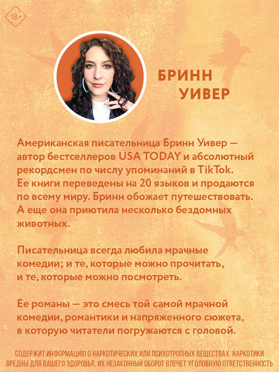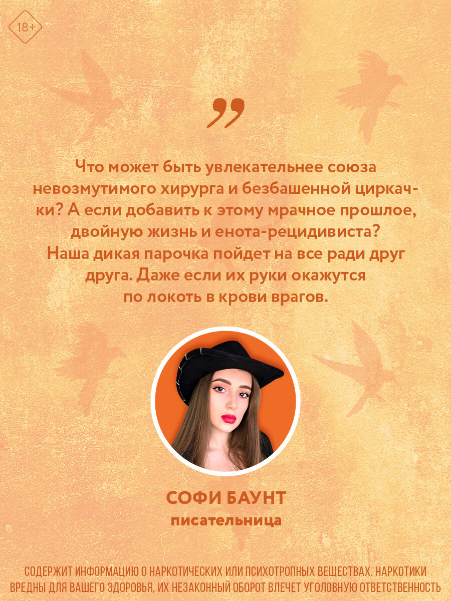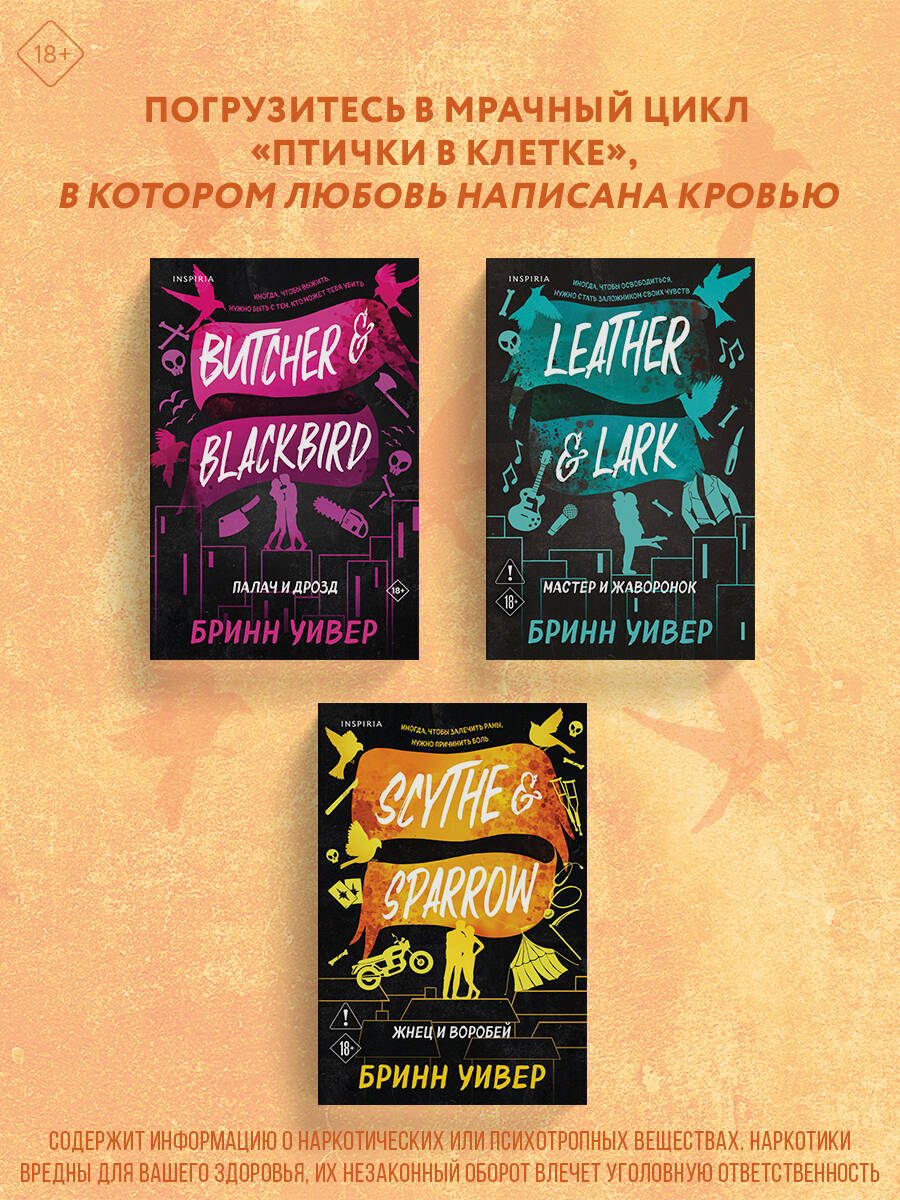 НЕЗАКОННОЕ ПОТРЕБЛЕНИЕ НАРКОТИЧЕСКИХ СРЕДСТВ, ПСИХОТРОПНЫХ ВЕЩЕСТВ, ИХ АНАЛОГОВ ПРИЧИНЯЕТ ВРЕД ЗДОРОВЬЮ, ИХ НЕЗАКОННЫЙ ОБОРОТ ЗАПРЕЩЕН И ВЛЕЧЕТ УСТАНОВЛЕННУЮ ЗАКОНОДАТЕЛЬСТВОМ ОТВЕТСТВЕННОСТЬ. Иногда, чтобы залечить раны, нужно причинить боль. Погрузитесь в мрачный мир, созданный Бринн Уивер, в котором любовь написана кровью. «Жнец и Воробей» - заключительная часть цикла «Птички в клетке». Эсклюзивный подарок только в первом тираже! ОНА СПАСАЕТ ЧУЖИЕ ЖИЗНИ. ОН ПРЯЧЕТ СВОЮ БОЛЬ. ИХ ВСТРЕЧА - ОШИБКА, КОТОРАЯ МОЖЕТ СТАТЬ СПАСЕНИЕМ. Хирург Фионн мечтает залечить свое разбитое сердце, спрятаться от прошлого и не впускать в жизнь новых людей. Но его покой нарушает Роуз, дерзкая мотогонщица и цирковая звезда, которая скрывает куда больше, чем кажется на первый взгляд. Для одних она яркая артистка, но для тех, кто оказался в ловушке, она - шанс на спасение, ведь Роуз умеет находить выход даже из самой тесной клетки. Когда призраки прошлого настигают Фионна и Роуз, а любовь становится опасной, героям предстоит решить: хватит ли у них смелости расправить крылья и вырваться на волю - даже если за это придется заплатить самую высокую цену.| Издательство | ООО "Издательство "Эксмо" |