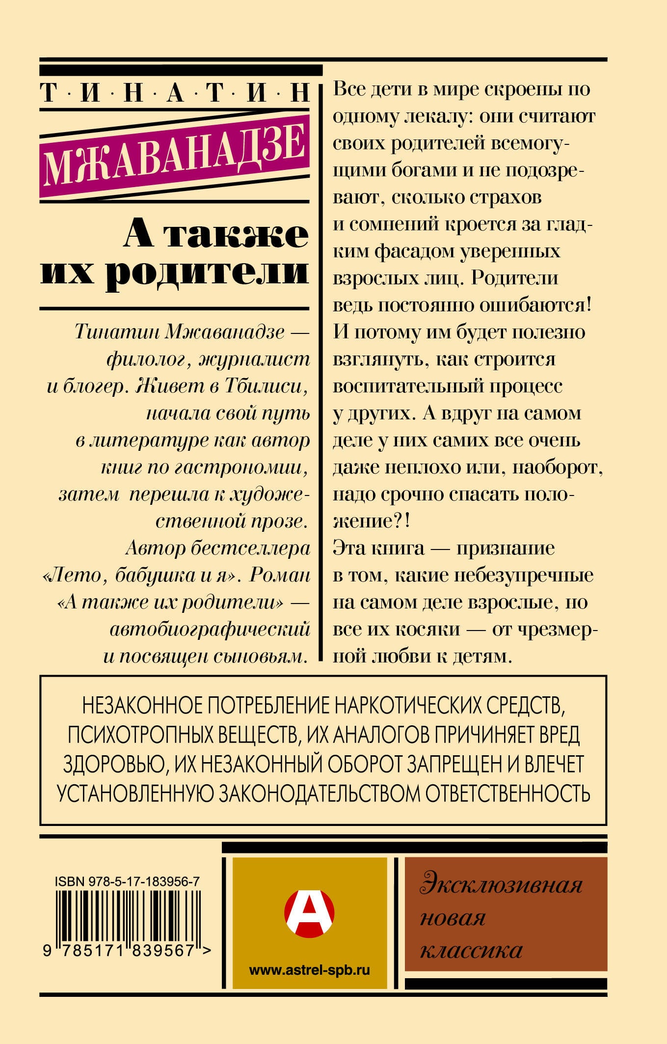 НЕЗАКОННОЕ ПОТРЕБЛЕНИЕ НАРКОТИЧЕСКИХ СРЕДСТВ, ПСИХОТРОПНЫХ ВЕЩЕСТВ, ИХ АНАЛОГОВ ПРИЧИНЯЕТ ВРЕД ЗДОРОВЬЮ, ИХ НЕЗАКОННЫЙ ОБОРОТ ЗАПРЕЩЕН И ВЛЕЧЕТ УСТАНОВЛЕННУЮ ЗАКОНОДАТЕЛЬСТВОМ ОТВЕТСТВЕННОСТЬ. - «А также их родители» - лирическо‑юмористический роман о буднях семейной жизни, написанный с теплотой, самоиронией и фирменным грузинским колоритом. - Автобиографическая история от Тинатин Мжаванадзе - грузинской писательницы, автора бестселлера «Лето, бабушка и я» и ряда кулинарных книг. - Книга рассказывает о радостях и испытаниях родительства: автор делится откровенными и смешными историями из опыта воспитания двух сыновей. - В центре сюжета - история молодой мамы двух непоседливых мальчиков, которая учится находить баланс между родительскими обязанностями и собственной жизнью. Через череду забавных ситуаций, бытовых казусов и трогательных моментов она постигает искусство родительства и понимает, что главное в этом процессе - любовь, терпение и умение посмеяться над собой. - Переиздание в серии «Эксклюзивная новая классика» - удобный формат покета с узнаваемым оформлением. - Издание будет ценно родителям, будущим мамам и папам, а также всем, кто ценит душевные истории с долей юмора и теплым взглядом на жизнь.