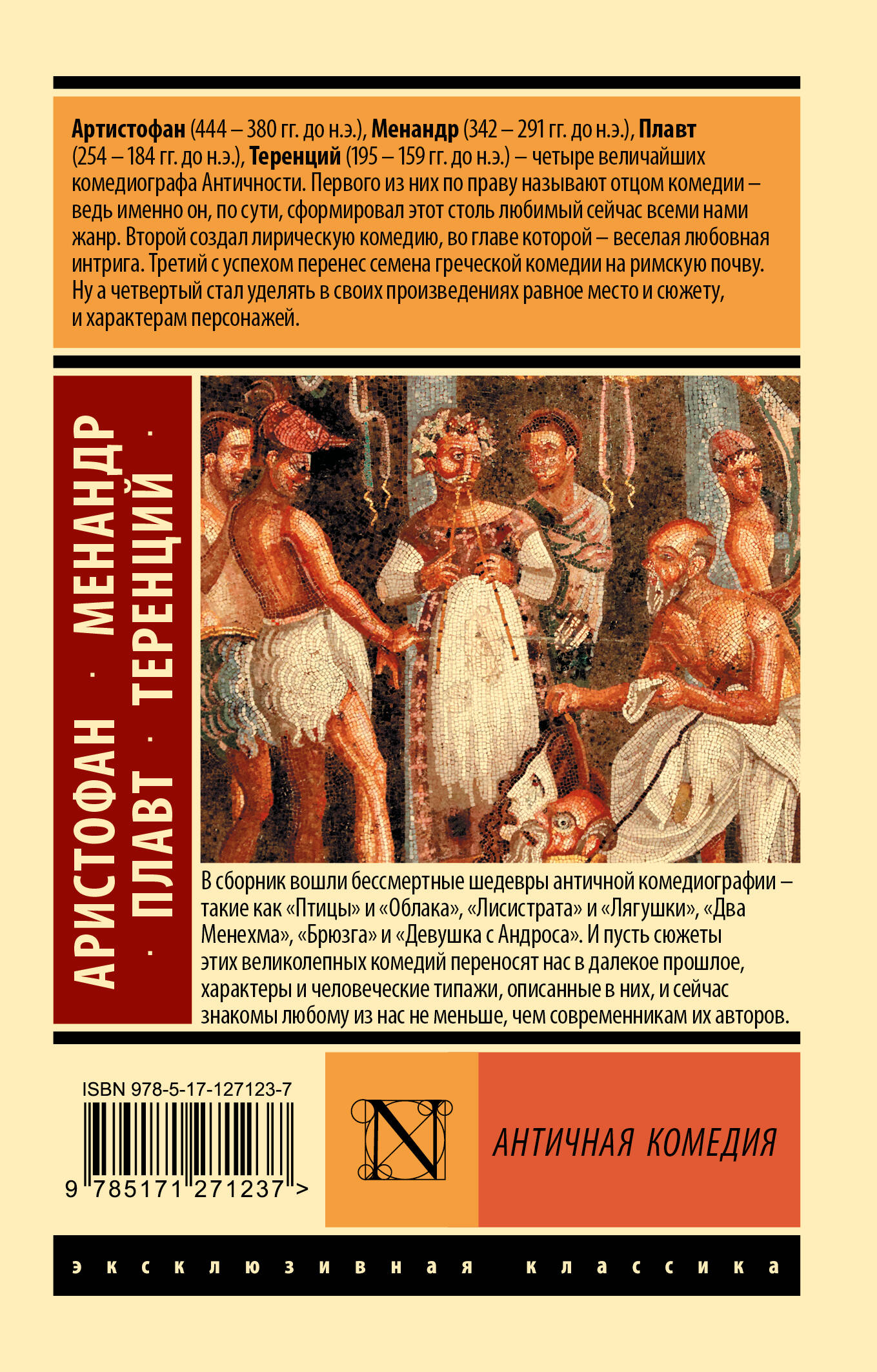 В сборник вошли бессмертные шедевры античной комедиографии - такие, как "Птицы" и "Облака", "Лисистрата" и "Лягушки", "Два Менехма", "Брюзга" и "Девушка с Андроса". И пусть сюжеты этих великолепных комедий переносят нас в далекое прошлое, - характеры и человеческие типажи, описанные в них, и сейчас знакомы любому из нас не меньше, чем современникам их авторов.| Издательство | ИЗДАТЕЛЬСТВО "АСТ" |