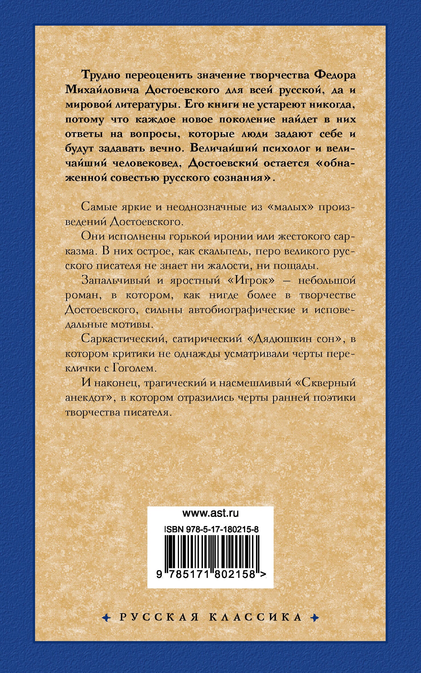 Самые яркие и неоднозначные из "малых" произведений Достоевского. Они исполнены горькой иронии или жестокого сарказма. В них острое, как скальпель, перо великого русского писателя не знает ни жалости, ни пощады. Запальчивый и яростный "Игрок" - небольшой роман, в котором, как нигде более в творчестве Достоевского, сильны автобиографические и исповедальные мотивы. Саркастический, сатирический "Дядюшкин сон", в котором критики не однажды усматривали черты переклички с Гоголем. И наконец, трагический и насмешливый "Скверный анекдот", в котором отразились черты ранней поэтики творчества писателя.