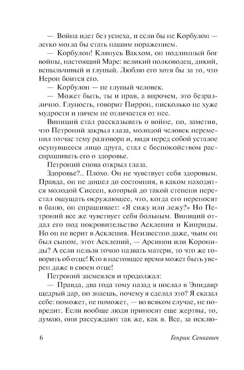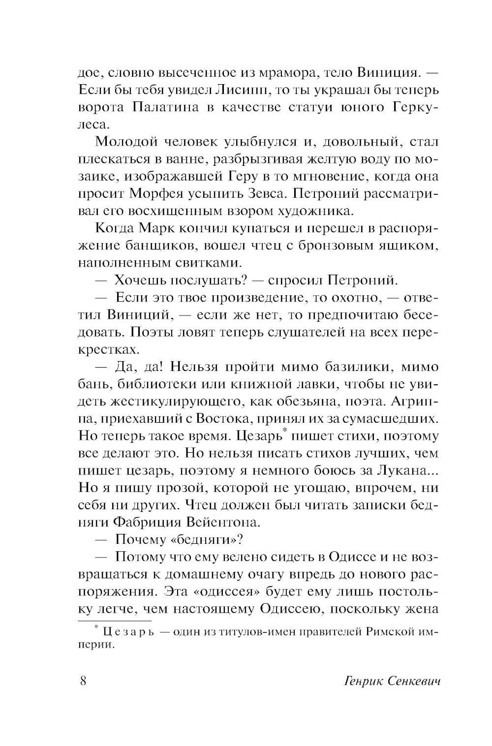 Самый прославленный роман Сенкевича, переведенный более чем на 40 языков. Первый век нашей эры, время деяний апостолов и становления христианства. Безжалостное правление полубезумного императора Нерона, погрязший в пороках Вечный город, массовые казни и гонения на новую религию... Именно здесь, на фоне драматических событий Древнего Рима, навсегда изменивших облик западной цивилизации, разворачивается трагическая история любви молодого патриция Марка Виниция к прекрасной варварке Лигии.| Издательство | АСТ |