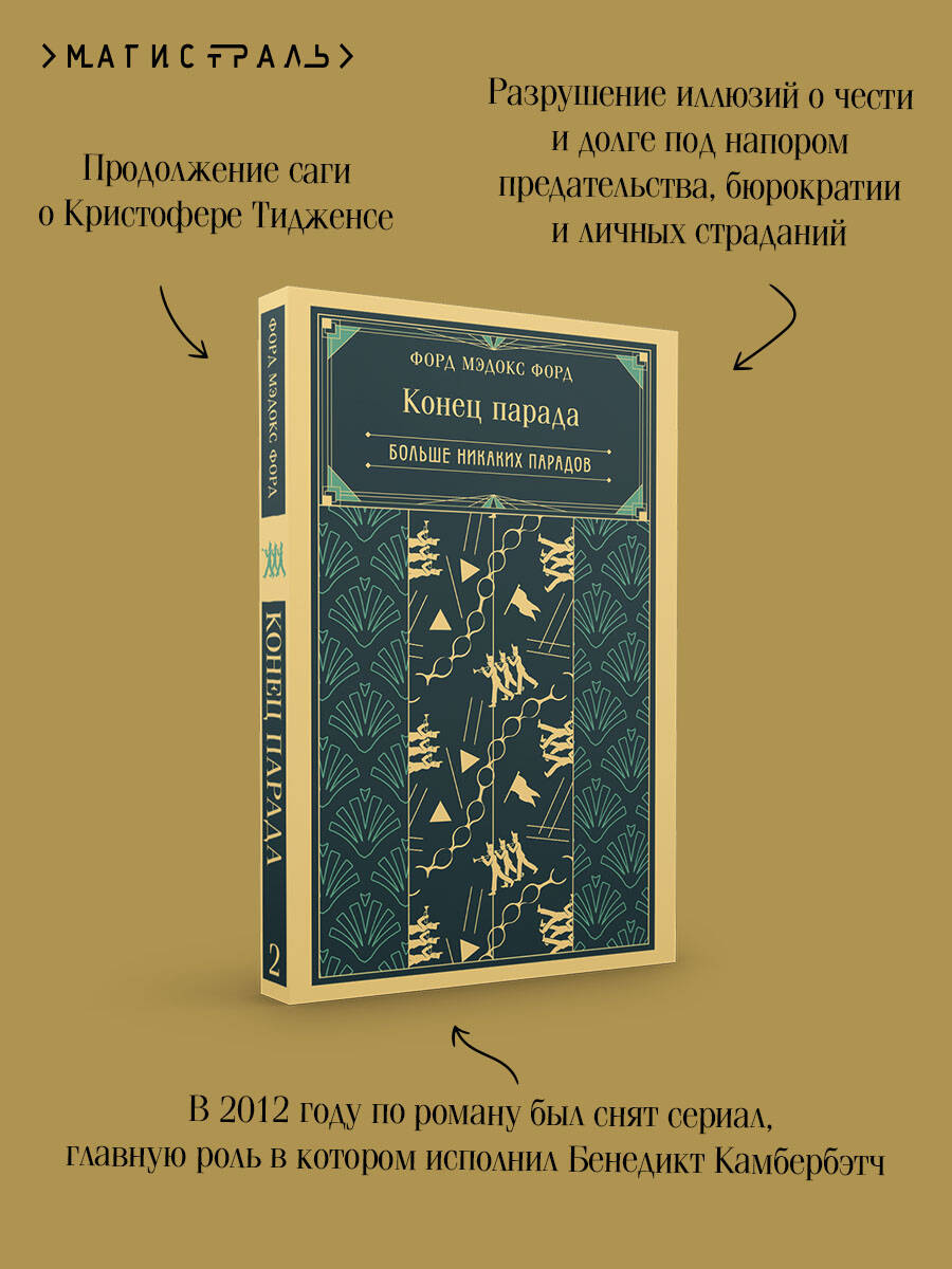 «Больше никаких парадов», впервые опубликованная в 1926 году, - вторая книга тетралогии «Конец парада» английского писателя Форда Мэдокса Форда. Великая война меняет всё. В этой истории, охватывающей более десятилетия, война переворачивает с ног на голову мир привилегированного английского аристократа, офицера и джентльмена Кристофера Тидженса. Она заставляет его подвергнуть сомнению всё, что ему дорого: социальный порядок, мораль, брак и верность. Она подрывает самые основы английского общества. Это мощная история о любви, предательстве и разочаровании во времена ужаса и смятения, написанная одним из лучших британских романистов. «Больше никаких парадов» и вся тетралогия «Конец парада» - это незабываемое исследование напряженности в обществе, противостоящем безумию и насилию. В 2012 году по роману был снят сериал, главную роль в котором исполнил Бенедикт Камбербэтч. Форд Мэдокс Форд (1873-1939) - автор более 80 романов, влиятельный редактор, эссеист, критик, поэт и прозаик. Он дружил со многими лучшими писателями своего времени: Генри Джеймсом, Гербертом Уэллсом, Стивеном Крейном и Томасом Харди. Форд также основал журнал «English Review», взяв Эрнеста Хемингуэя на должность младшего редактора и опубликовав произведения Джеймса Джойса и Гертруды Стайн. Тетралогия Форда заняла 57-е место в списке «100 лучших романов» по версии Modern Library.| Издательство | ООО "Издательство "Эксмо" |