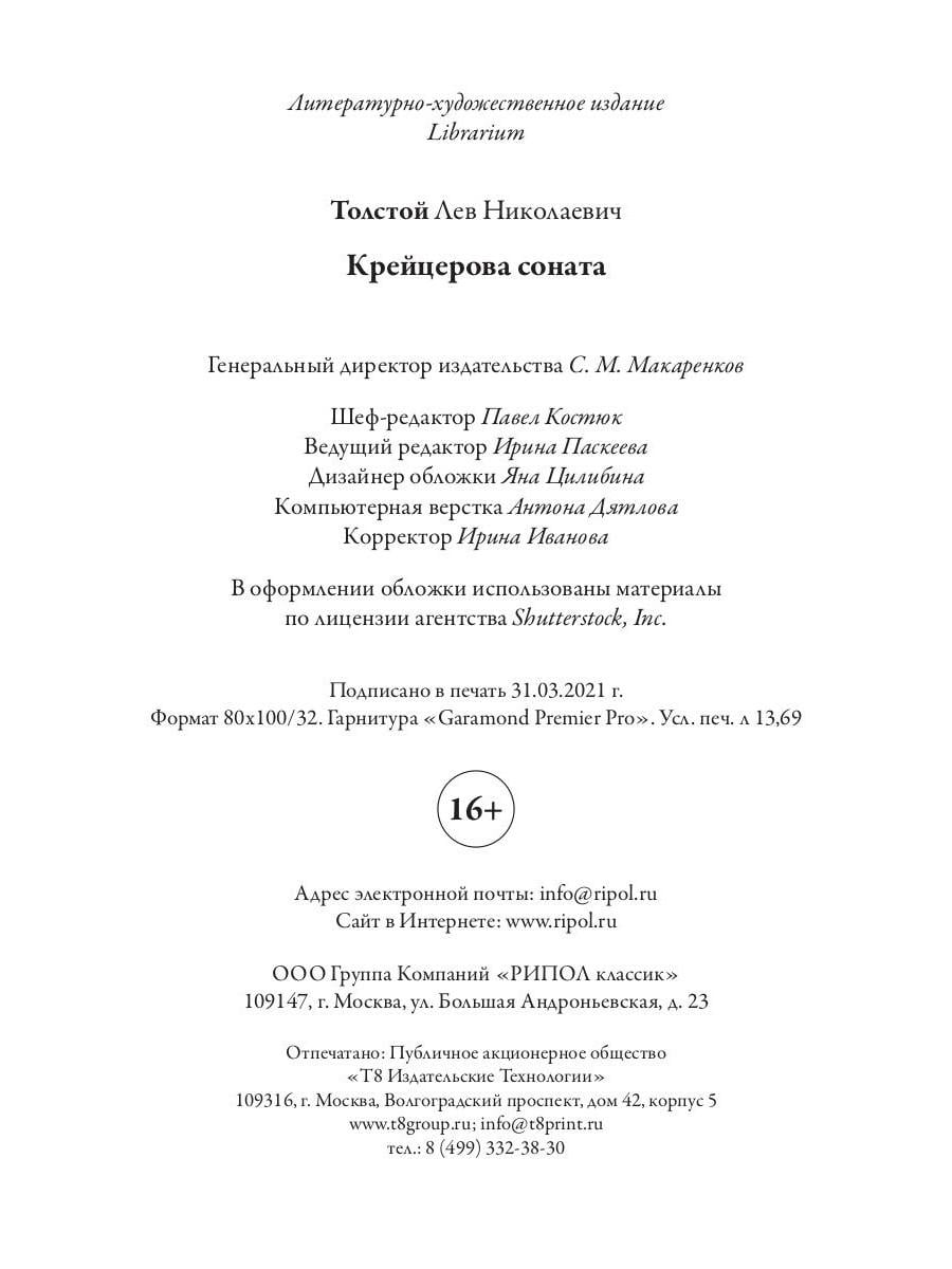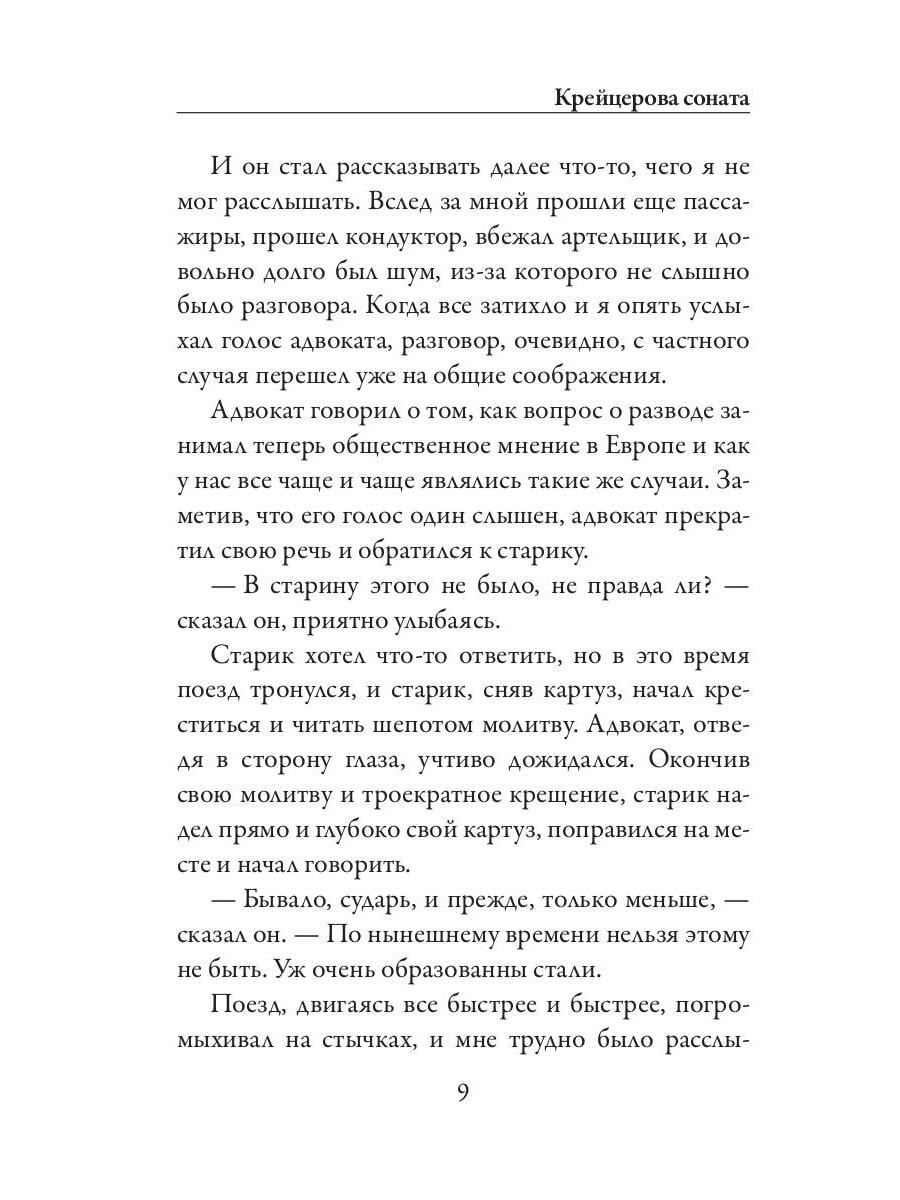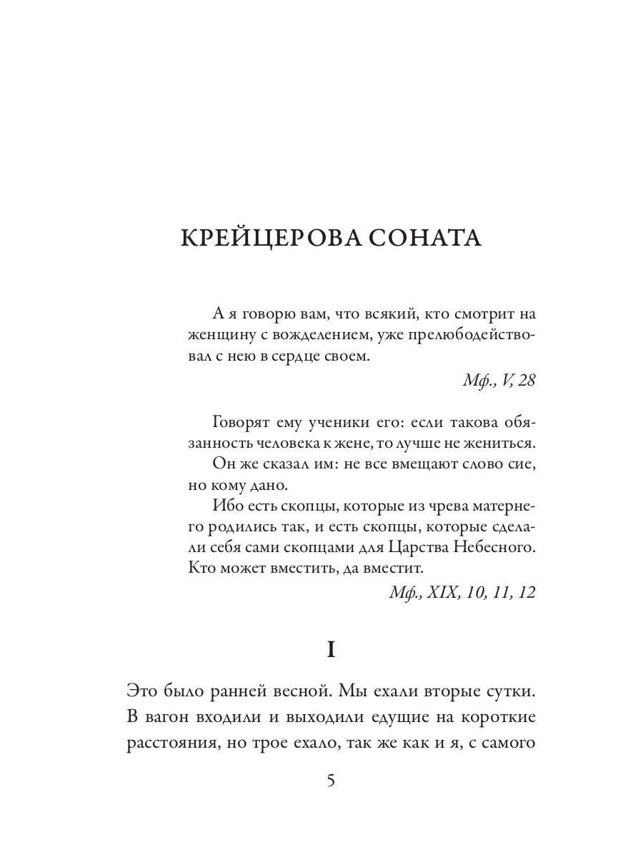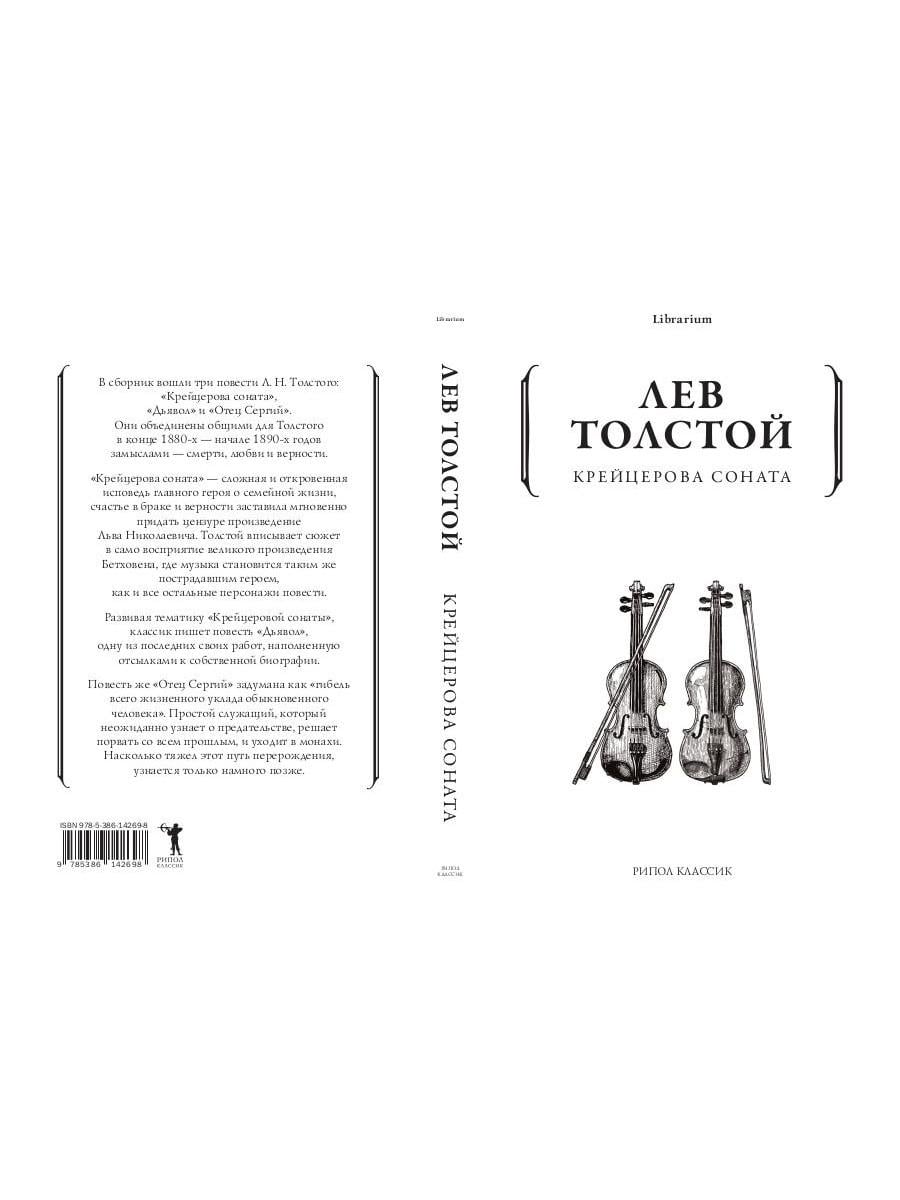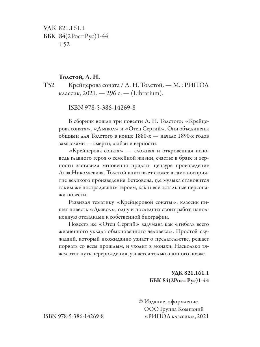 В сборник вошли три повести Л. Н. Толстого: «Крейцерова соната», «Дьявол» и «Отец Сергий». Они объединены общими для Толстого в конце 1880-х - начале 1890-х годов замыслами - смерти, любви и верности. «Крейцерова соната» - сложная и откровенная исповедь главного героя о семейной жизни, счастье в браке и верности заставила мгновенно придать цензуре произведение Льва Николаевича. Толстой вписывает сюжет в само восприятие великого произведения Бетховена, где музыка становится таким же пострадавшим героем, как и все остальные персонажи повести. Развивая тематику «Крейцеровой сонаты», классик пишет повесть «Дьявол», одну и последних своих работ, наполненную отсылками к собственной биографии. Повесть же «Отец Сергий» задумана как «гибель всего жизненного уклада обыкновенного человека». Простой служащий, который неожиданно узнает о предательстве, решает порвать со всем прошлым, и уходит в монахи. Насколько тяжел этот путь перерождения, узнается только намного позже.| Издательство | Рипол Классик |