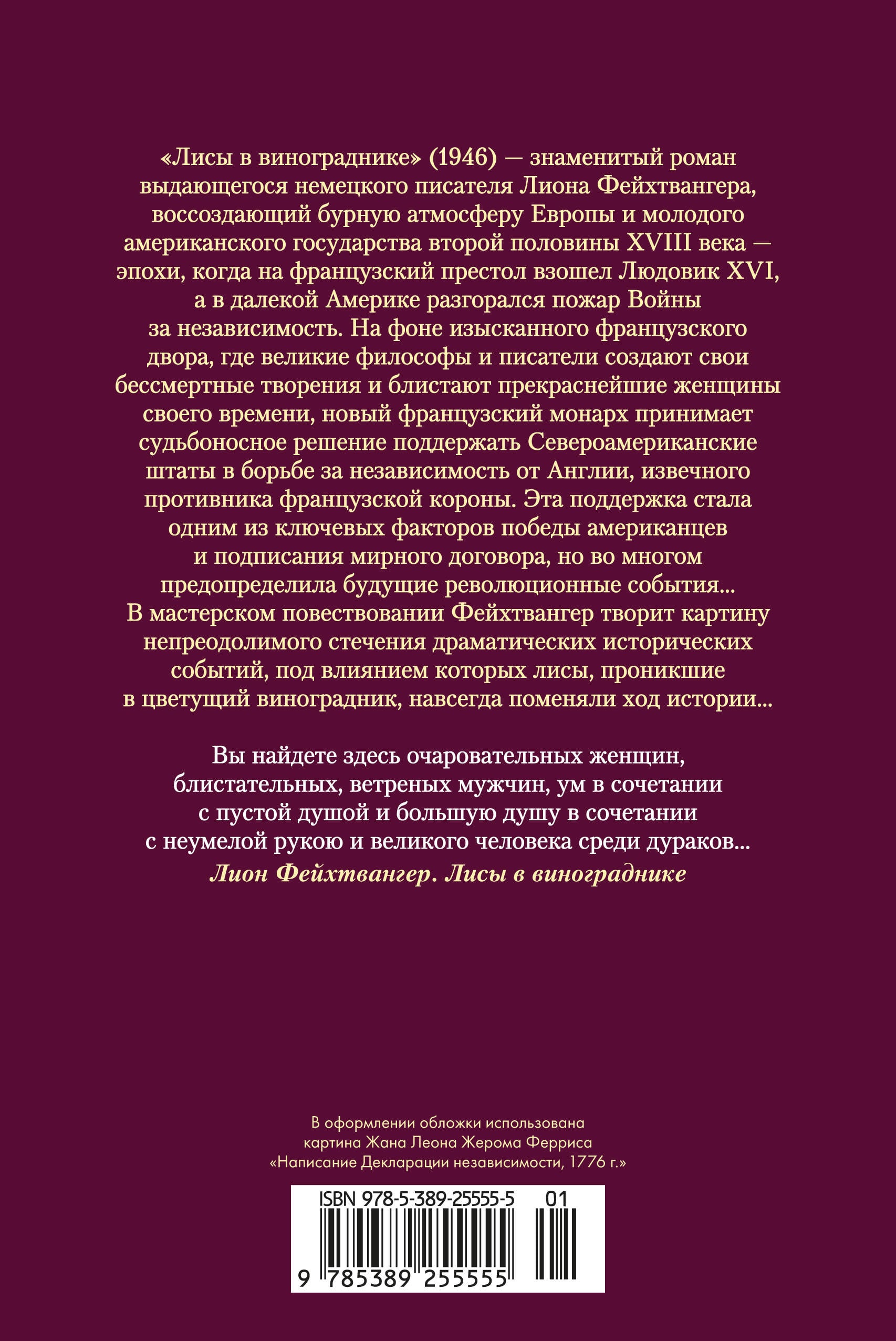 «Лисы в винограднике» (1946) - знаменитый роман выдающегося немецкого писателя Лиона Фейхтвангера, воссоздающий бурную атмосферу Европы и молодого Американского государства второй половины XVIII века - эпохи, когда на французский престол взошел Людовик XVI, а в далекой Америке разгорался пожар Войны за независимость. На фоне изысканного французского двора, где великие философы и писатели создают свои бессмертные творения и блистают прекраснейшие женщины своего времени, новый французский монарх принимает судьбоносное решение поддержать Североамериканские штаты в борьбе за независимость от Англии, извечного противника французской короны. Эта поддержка стала одним из ключевых факторов победы американцев и подписания мирного договора, но во многом предопределила будущие революционные события… Книга станет прекрасным подарком любителям исторических романов, литературы XX века и поклонникам творчества Лиона Фейхтвангера.