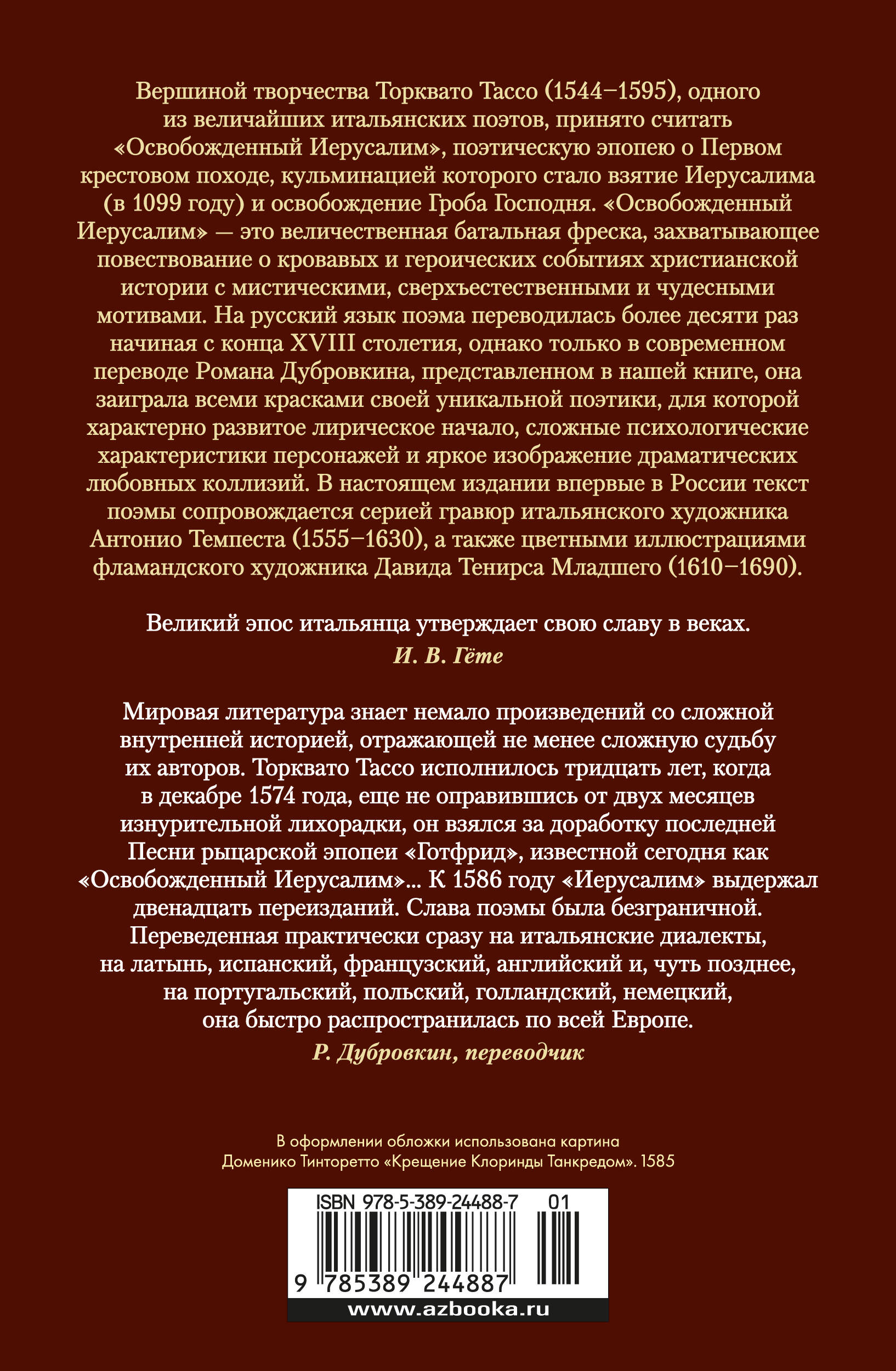 Вершиной творчества Торквато Тассо (1544-1595), одного из величайших итальянских поэтов, принято считать "Освобожденный Иерусалим", поэтическую эпопею о Первом крестовом походе, кульминацией которого стало взятие Иерусалима (в 1099 году) и освобождение Гроба Господня. "Освобожденный Иерусалим" - это батальная фреска, захватывающее повествование о кровавых и героических событиях христианской истории с мистическими, сверхъестественными и чудесными мотивами. На русский язык поэма переводилась более десяти раз начиная с конца XVIII столетия, однако только в современном переводе Романа Дубровкина, представленном в нашей книге, она заиграла всеми красками своей уникальной поэтики, для которой характерно развитое лирическое начало, сложные психологические характеристики персонажей и яркое изображение драматических любовных коллизий. В настоящем издании впервые в России текст поэмы сопровождается серией гравюр итальянского художника Антонио Темпеста (1555-1630), а также цветными иллюстрациями фламандского художника Давида Тенирса Младшего (1610-1690).| Издательство | Азбука-Аттикус Издат.группа ООО |