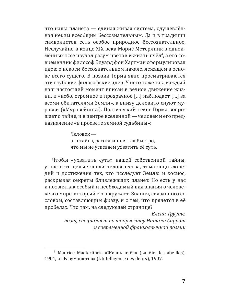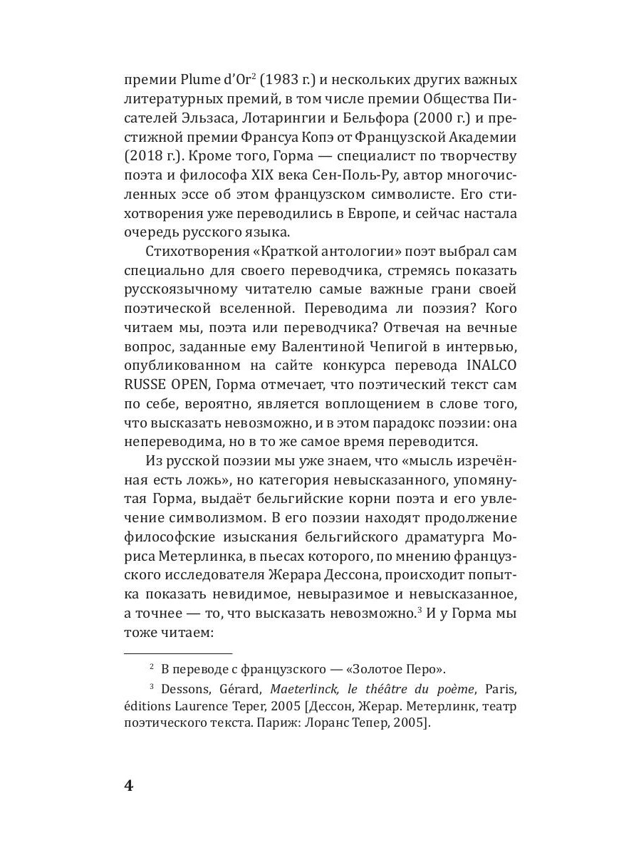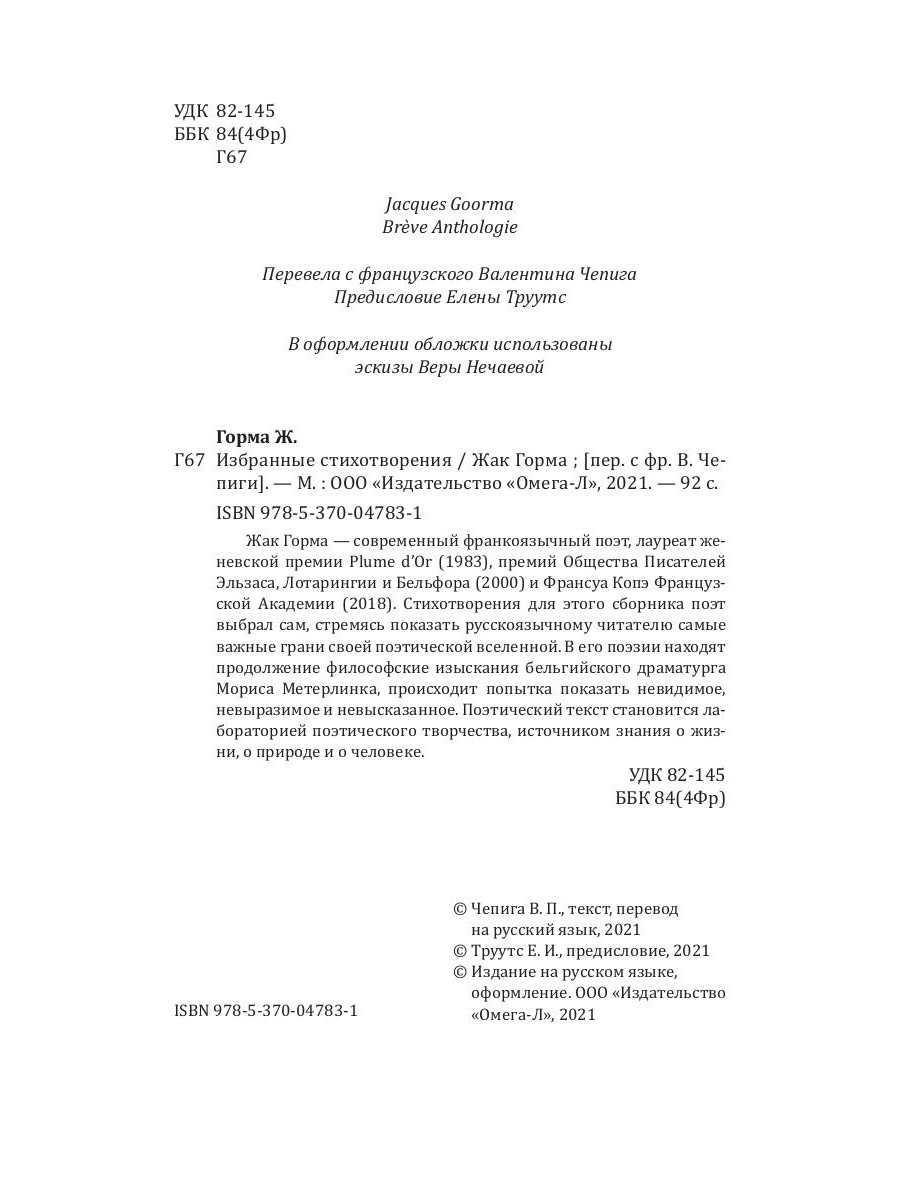 Жак Горма - современный франкоязычный поэт, лауреат женевской премии Plume d'Or (1983), премий Общества Писателей Эльзаса, Лотарингии и Бельфора (2000) и Франсуа Копэ Французской Академии (2018). Стихотворения для этого сборника поэт выбрал сам, стремясь показать русскоязычному читателю самые важные грани своей поэтической вселенной. В его поэзии находят продолжение философские изыскания бельгийского драматурга Мориса Метерлинка, происходит попытка показать невидимое, невыразимое и невысказанное. Поэтический текст становится лабораторией поэтического творчества, источником знания о жизни, о природе и о человеке.| Издательство | Омега-Л |