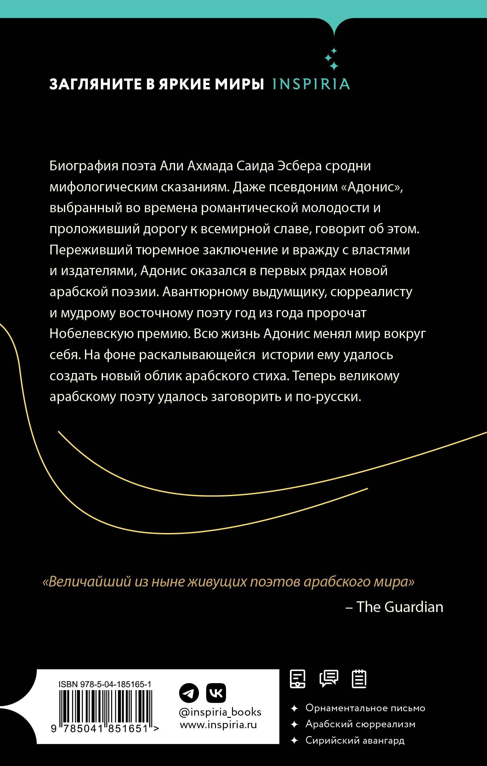 Кажется, что биография поэта Али Ахмада Саида Эсбера сродни мифологическим сказаниям. Даже псевдоним «Адонис», выбранный во времена романтической молодости и проложивший дорогу к всемирной славе, говорит об этом. Переживший заключение, непонимание со стороны властей и издателей Адонис оказался в первых рядах новой арабской поэзии. Авантюрному выдумщику и скрупулёзному исследователю жизни Востока год из года пророчат Нобелевскую премию. Всю жизнь Адонис менял мир вокруг себя. На фоне раскалывающейся истории ему удалось создать новый облик арабского стиха. Теперь сирийскому правдоискателю удалось заговорить и по-русски.| Издательство | ООО "Издательство "Эксмо" |