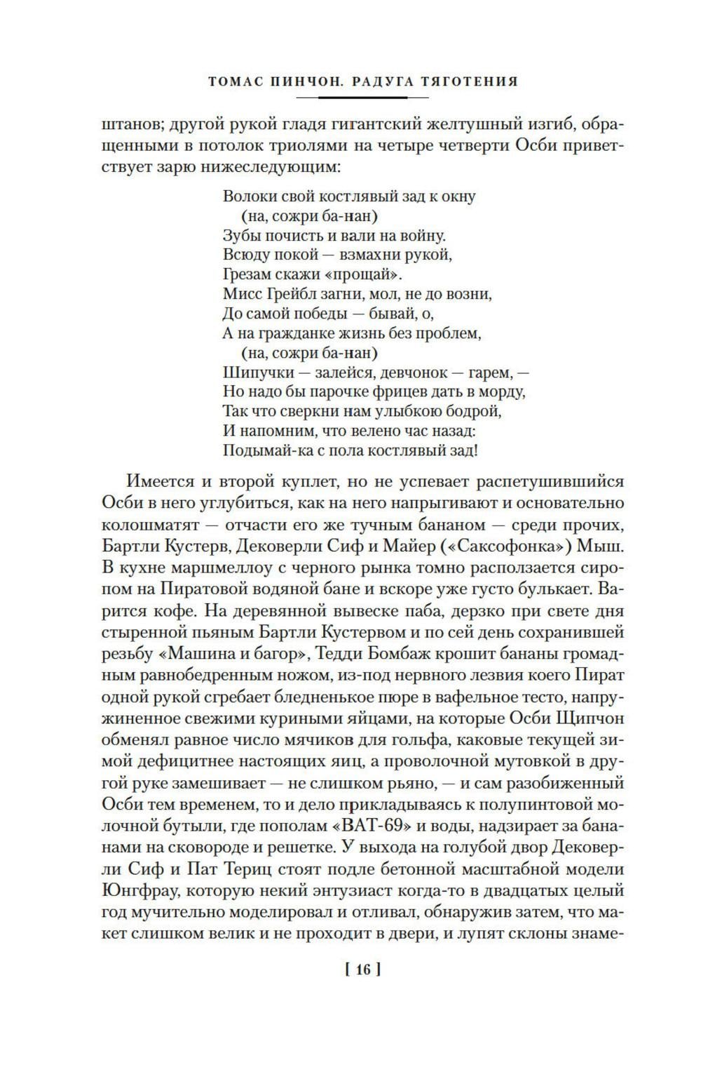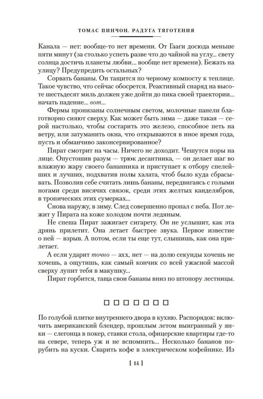 СОДЕРЖИТ ИНФОРМАЦИЮ О НАРКОТИЧЕСКИХ ИЛИ ПСИХОТРОПНЫХ ВЕЩЕСТВАХ, УПОТРЕБЛЕНИЕ КОТОРЫХ ОПАСНО ДЛЯ ЗДОРОВЬЯ. ИХ НЕЗАКОННЫЙ ОБОРОТ ВЛЕЧЕТ УГОЛОВНУЮ ОТВЕТСТВЕННОСТЬ. Томас Пинчон - наряду с Сэлинджером, «великий американский затворник», один из крупнейших писателей мировой литературы XX, а теперь и XXI века, после первых же публикаций единодушно признанный классиком уровня Набокова, Джойса и Борхеса. Его «Радуга тяготения» - это главный послевоенный роман мировой литературы, вобравший в себя вторую половину XX века так же, как джойсовский «Улисс» вобрал первую. Это грандиозный постмодернистский эпос и едкая сатира, помноженная на фарс трагедия и радикальнейшее антивоенное высказывание, контркультурная библия и взрывчатая смесь иронии с конспирологией; наконец, это уникальный читательский опыт и сюрреалистический травелог через преисподнюю нашего коллективного прошлого. Без «Радуги тяготения» не было бы ни «Маятника Фуко» Умберто Эко, ни всего киберпанка, вместе взятого, да и сам пейзаж современной литературы был бы совершенно иным. Вот уже почти полвека в этой книге что ни день открывают новые смыслы, но единственное правильное прочтение так и остается, к счастью, недостижимым. Получившая главную американскую литературную награду - Национальную книжную премию США, номинированная на десяток других престижных премий и своим радикализмом вызвавшая лавину отставок почтенных жюри, «Радуга тяготения» остается вне оценочной шкалы и вне времени.| Издательство | Азбука |