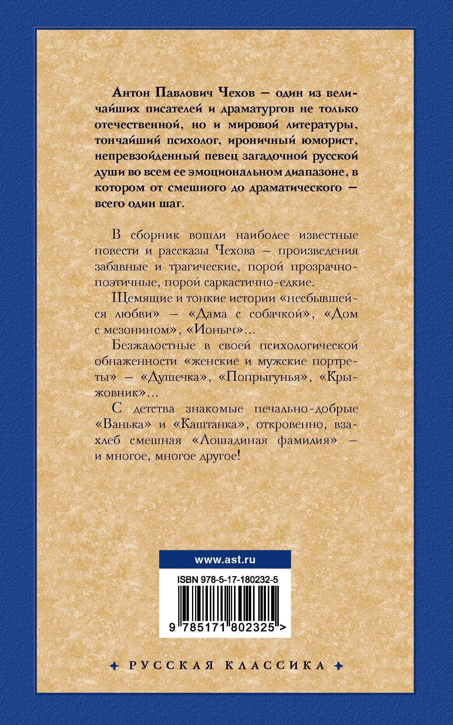 Проникновенная "Дама с собачкой" - и печальная "Попрыгунья". Хлесткий "Человек в футляре" - и озорные "Мальчики". Беспощадная "Палата номер шесть" - и трогательная "Каштанка". В этот сборник вошли рассказы и повести разных лет, серьезные и смешные, юмористические и трагические, взрослые и детские. Однако о чем бы ни писал великий Чехов - неизменными всегда оставались его поразительное чувство слова и глубокое понимание человеческой природы.