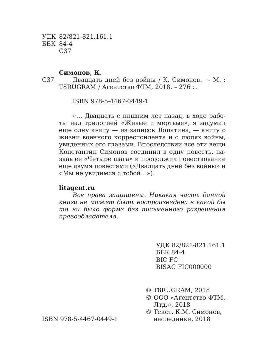«... Двадцать с лишним лет назад, в ходе работы над трилогией «Живые и мертвые», я задумал еще одну книгу - из записок Лопатина, - книгу о жизни военного корреспондента и о людях войны, увиденных его глазами. Впоследствии все эти вещи Константин Симонов соединил в одну повесть, назвав ее «Четыре шага» и продолжил повествование еще двумя повестями («Двадцать дней без войны» и «Мы не увидимся с тобой...»).| Издательство | Т8 RUGRAM |