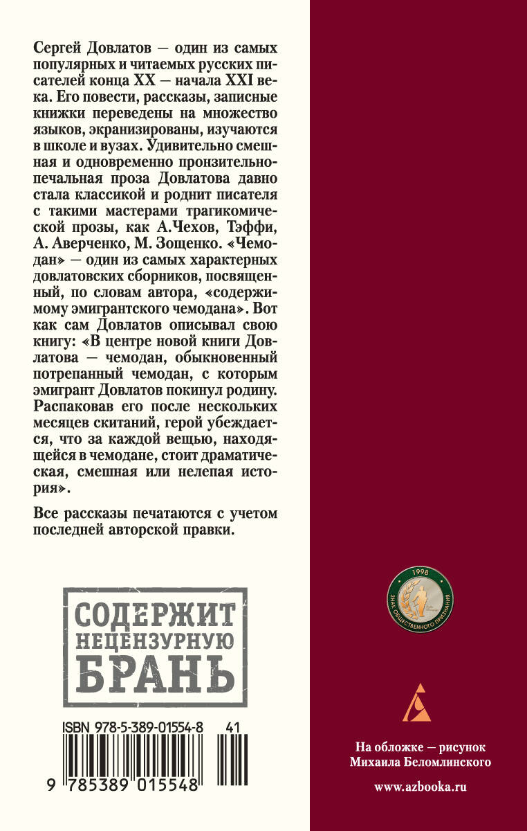 Сергей Довлатов верил в одно - в "улыбку разума". Эта достойная сдержанная позиция принесла писателю повсеместную известность. На родине вот уже десять лет Довлатов - один из самых устойчиво читаемых авторов; его проза инсценирована, экранизарована, изучается в школе и ВУЗах, переведена на японский и основные европейские языки. Перед вами - ещё одно его произведение.| Издательство | Азбука-Аттикус Издат.группа ООО |
