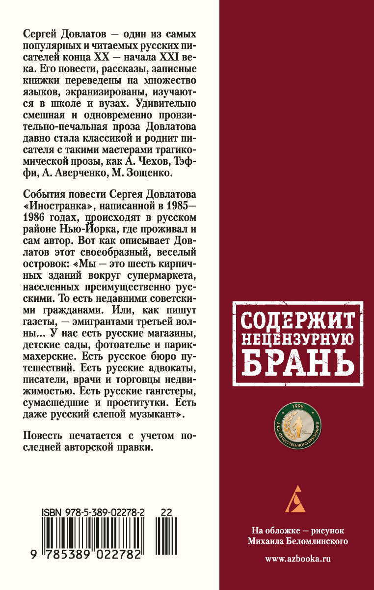 Сергей Довлатов - один из наиболее популярных и читаемых русских писателей конца XX - начала XXI века. Его повести, рассказы и записные книжки переведены на множество языков, экранизированы, изучаются в школе и вузах. "Заповедник", "Зона", "Иностранка", "Наши", "Чемодан" - эти и другие удивительно смешные и пронзительно печальные довлатовские вещи давно стали классикой. "Отморозил пальцы ног и уши головы", "выпил накануне - ощущение, как будто проглотил заячью шапку с ушами", "алкоголизм излечим - пьянство - нет" - шутки Довлатова запоминаешь сразу и на всю жизнь, а книги перечитываешь десятки раз. Они никогда не надоедают.| Издательство | Азбука-Аттикус Издат.группа ООО |