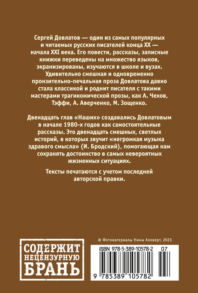 Сергей Довлатов - один из самых популярных и читаемых русских писателей конца ХХ - начала XXI века. Его повести, рассказы, записные книжки переведены на множество языков, экранизированы, изучаются в школе и вузах. Удивительно смешная и одновременно пронзительно-печальная проза Довлатова давно стала классикой и роднит писателя с такими мастерами трагикомической прозы, как А. Чехов, Тэффи, А. Аверченко, М. Зощенко. Двенадцать глав "Наших" создавались Довлатовым в начале 1980-х годов как самостоятельные рассказы. Это двенадцать смешных, светлых историй, в которых звучит "негромкая музыка здравого смысла" (И. Бродский), помогающая нам сохранять достоинство в самых невероятных жизненных ситуациях.| Издательство | Азбука-Аттикус Издат.группа ООО |