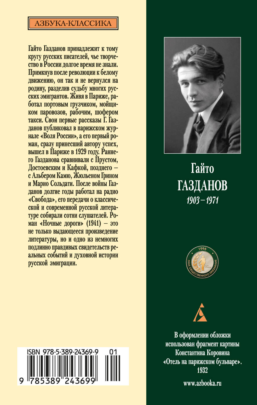 Гайто Газданов принадлежит к тому кругу русских писателей, чье творчество в России долгое время не знали. Примкнув после революции к белому движению, он так и не вернулся на родину, разделив судьбу многих русских эмигрантов. Живя в Париже, работал портовым грузчиком, мойщиком паровозов, рабочим, шофером такси. Свои первые рассказы Г. Газданов публиковал в парижском журнале "Воля России", а его первый роман, сразу принесший автору успех, вышел в Париже в 1929 году. Раннего Газданова сравнивали с Прустом, Достоевским и Кафкой, позднего - с Альбером Камю, Жюльеном Грином и Марио Сольдати. После войны Газданов долгие годы работал на радио "Свобода", его передачи о классической и современной русской литературе собирали сотни слушателей. Роман "Ночные дороги" (1941) - это не только выдающееся произведение литературы, но и одно из немногих подлинно правдивых свидетельств реальных событий и духовной истории русской эмиграции.| Издательство | Азбука-Аттикус Издат.группа ООО |