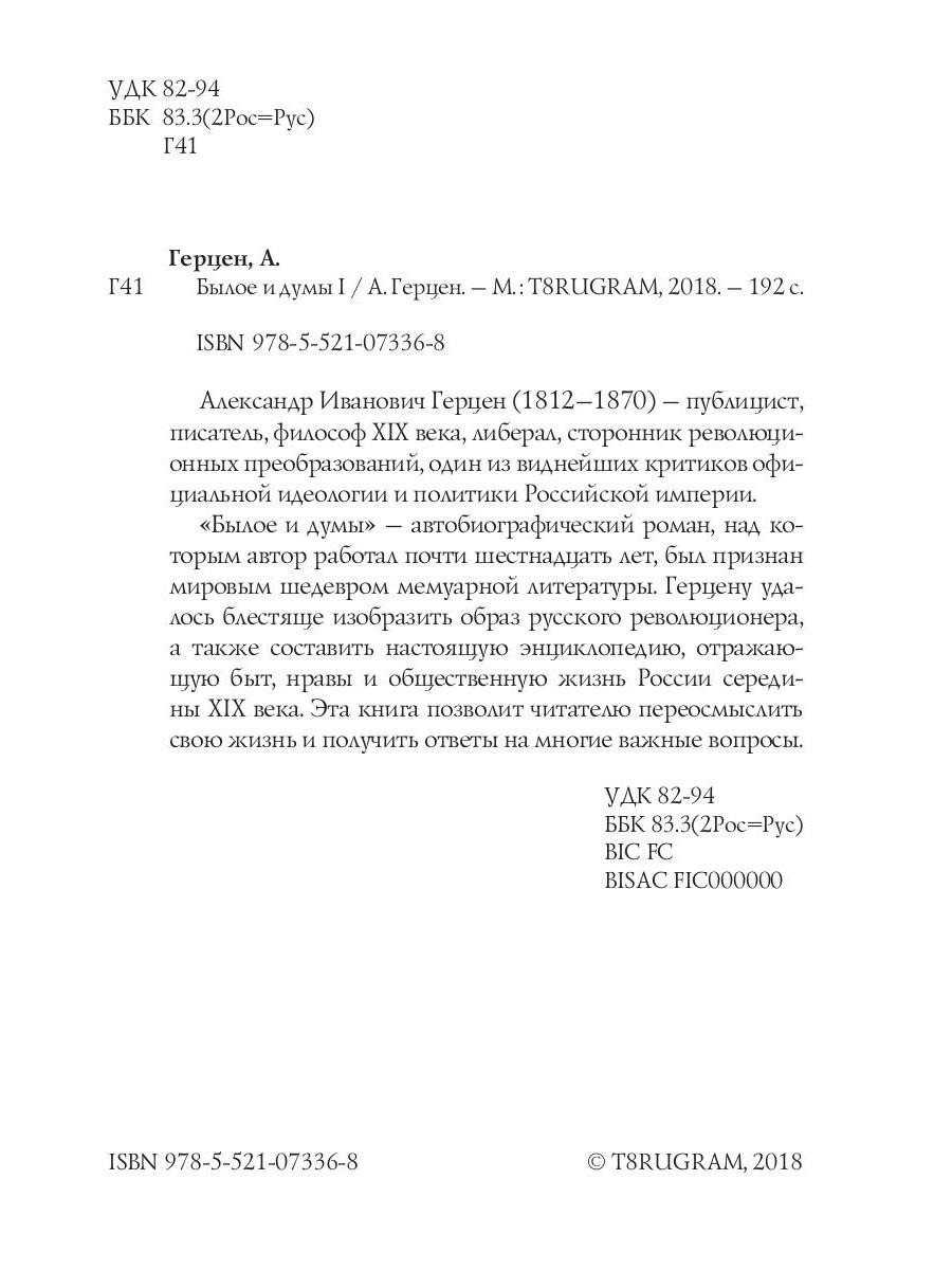 Александр Иванович Герцен (1812-1870) - публицист, писатель, философ XIX века, либерал, сторонник революционных преобразований, один из виднейших критиков официальной идеологии и политики Российской империи. «Былое и думы» - автобиографический роман, над которым автор работал почти шестнадцать лет, был признан мировым шедевром мемуарной литературы. Герцену удалось блестяще изобразить образ русского революционера, а также составить настоящую энциклопедию, отражающую быт, нравы и общественную жизнь России середины XIX века Эта книга позволит читателю переосмыслить свою жизнь и получить ответы на многие важные вопросы.| Издательство | Т8 RUGRAM |