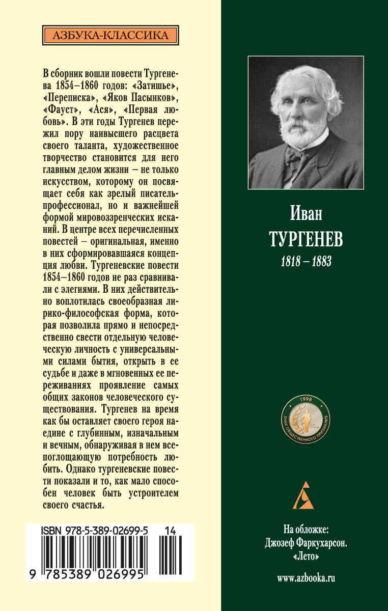 В сборник вошли повести И. С. Тургенева 1854-1860 годов: "Затишье", "Переписка", "Яков Пасынков", "Фауст", "Ася", "Первая любовь". Содержание книги определено не только хронологической, но и внутренней связью этих произведений - темой любви. Тургенев на время как бы оставляет человека наедине с глубинным, изначальным и вечным, обнаруживая в нем всепоглощающую потребность любить. Однако тургеневские повести показали и то, как мало способен быть человек устроителем своего счастья.| Издательство | Азбука-Аттикус Издат.группа ООО |