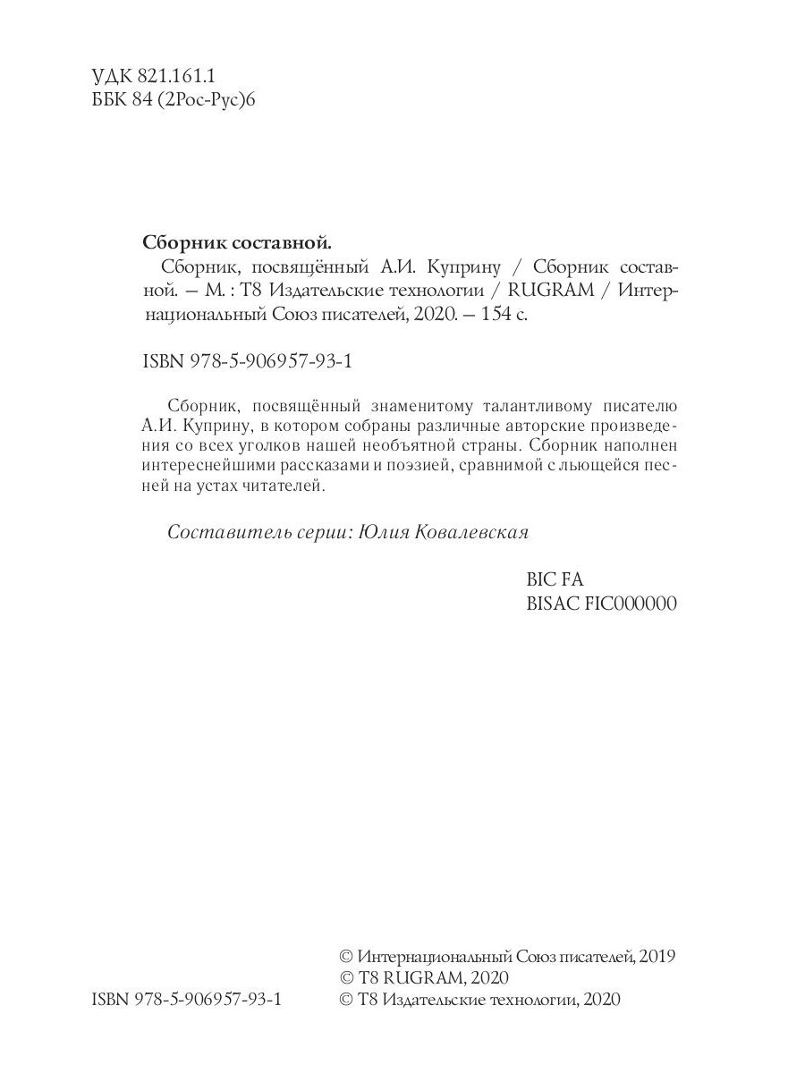 Сборник, посвященный знаменитому талантливому писателю А.И. Куприну, в котором собраны различные авторские произведения со всех уголков нашей необъятной страны. Сборник наполнен интереснейшими рассказами и поэзией, сравнимой с льющейся песней на устах читателей.| Издательство | Т8 RUGRAM |