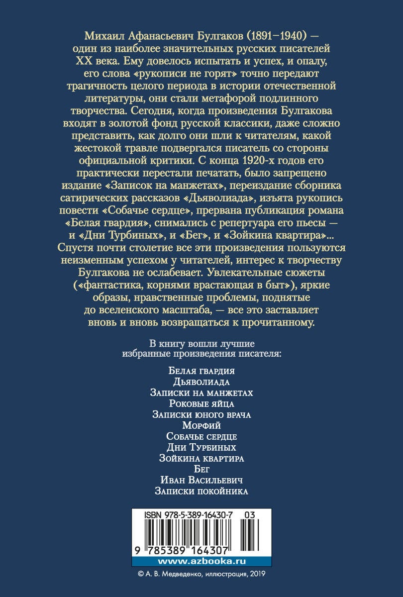 Михаил Афанасьевич Булгаков (1891-1940) - один из наиболее значительных русских писателей ХХ века. Ему довелось испытать и успех, и опалу, его слова "рукописи не горят" точно передают трагичность целого периода в истории отечественной литературы, они стали метафорой подлинного творчества. Сегодня, когда произведения Булгакова входят в золотой фонд русской классики, даже сложно представить, как долго они шли к читателям, какой жестокой травле подвергался писатель со стороны официальной критики. С конца 1920-х годов его практически перестали печатать, было запрещено издание "Записок на манжетах", переиздание сборника сатирических рассказов "Дьяволиада", изъята рукопись повести "Собачье сердце", прервана публикация романа "Белая гвардия", снимались с репертуара его пьесы - и "Дни Турбиных", и "Бег", и "Зойкина квартира"... Спустя почти столетие все эти произведения пользуются неизменным успехом у читателей, интерес к творчеству Булгакова не ослабевает. Увлекательные сюжеты ("фантастика, корнями врастающая в быт"), яркие образы, нравственные проблемы, поднятые до вселенского масштаба, - все это заставляет вновь и вновь возвращаться к прочитанному.| Издательство | Азбука-Аттикус Издат.группа ООО |