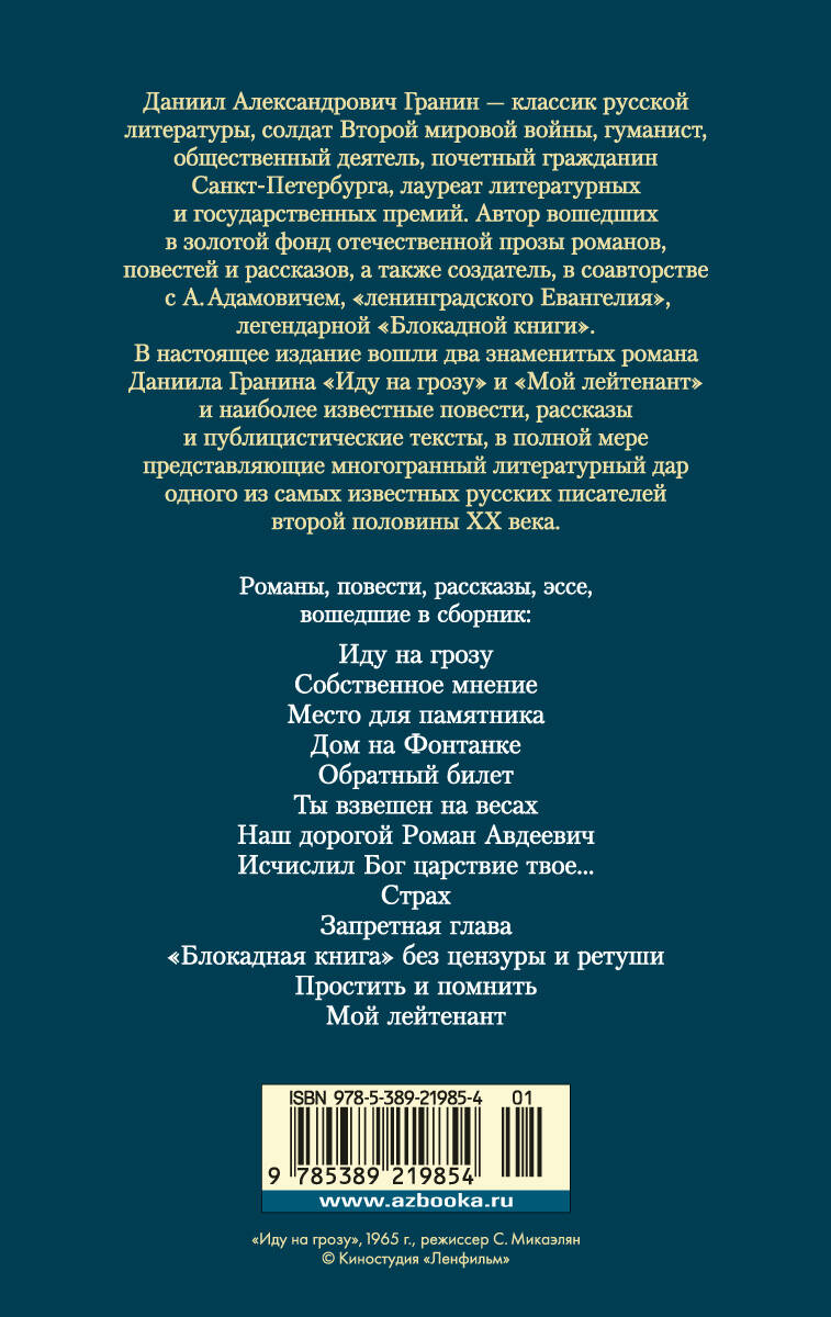 Даниил Александрович Гранин - классик русской литературы, солдат Второй мировой войны, гуманист, общественный деятель, почетный гражданин Санкт-Петербурга, лауреат литературных и государственных премий. Автор вошедших в золотой фонд отечественной прозы романов, повестей и рассказов, а также создатель, в соавторстве с А. Адамовичем, "ленинградского Евангелия", легендарной "Блокадной книги". В настоящее издание вошли два знаменитых романа Даниила Гранина "Иду на грозу" и "Мой лейтенант" и наиболее известные повести, рассказы и публицистические тексты, в полной мере представляющие многогранный литературный дар одного из самых известных русских писателей второй половины ХХ века.