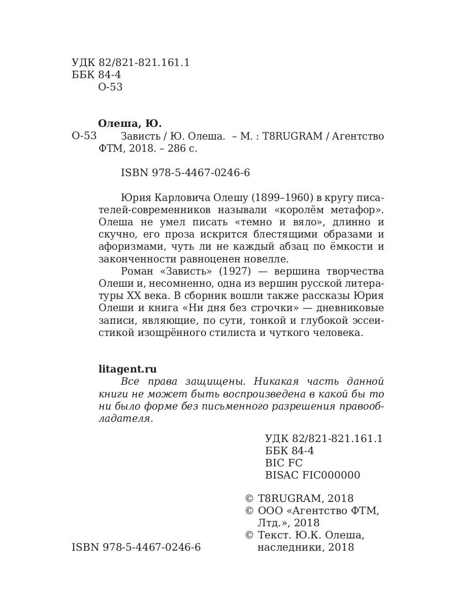 Юрия Карловича Олешу (1899-1960) в кругу писателей-современников называли «королём метафор». Олеша не умел писать «темно и вяло», длинно и скучно, его проза искрится блестящими образами и афоризмами, чуть ли не каждый абзац по ёмкости и законченности равноценен новелле. Роман «Зависть» (1927) - вершина творчества Олеши и, несомненно, одна из вершин русской литературы XX века. В сборник вошли также рассказы Юрия Олеши и книга «Ни дня без строчки» - дневниковые записи, являющие, по сути, тонкой и глубокой эссеистикой изощрённого стилиста и чуткого человека.| Издательство | Т8 RUGRAM |
