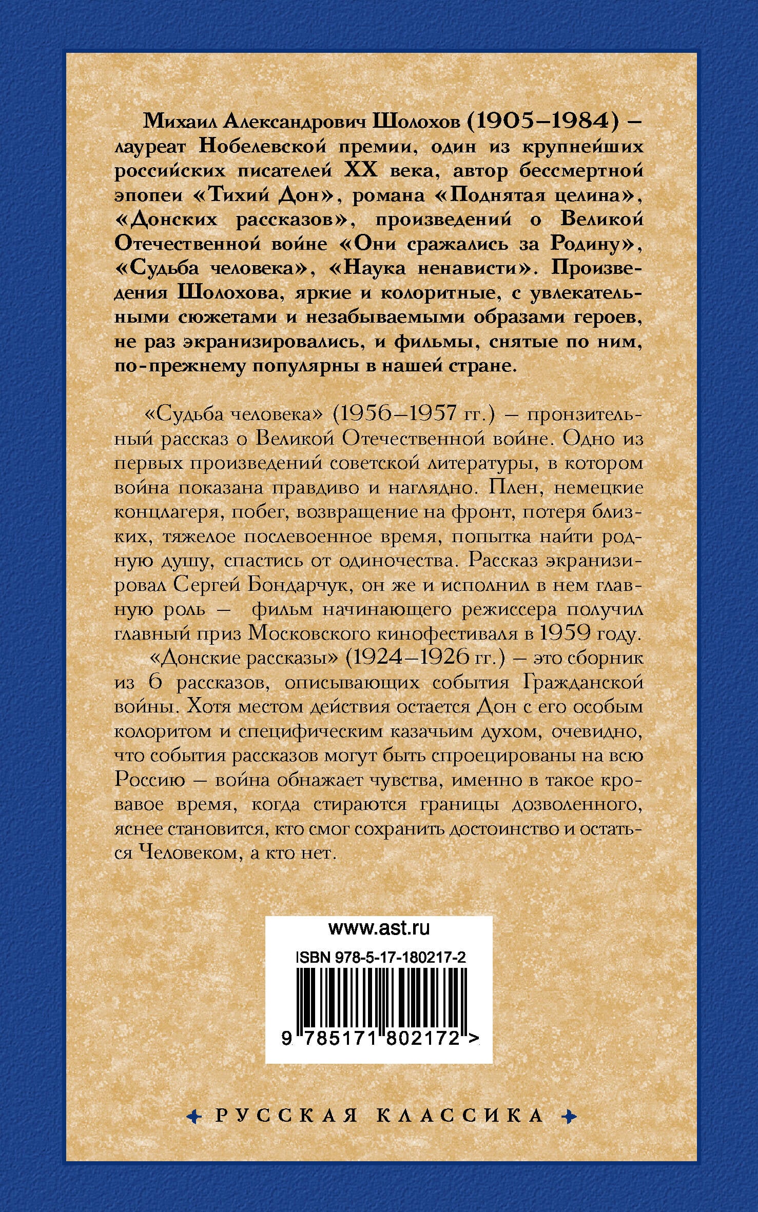 "Судьба человека" (1956-1957 гг.) - пронзительный рассказ о временах Великой Отечественной войны. Одно из первых произведений советской литературы, в котором война показана правдиво и наглядно. Плен, немецкие концлагеря, побег, возвращение на фронт, потеря близких, тяжелое послевоенное время, попытка найти родную душу, спастись от одиночества. Рассказ экранизировал Сергей Бондарчук, он же и исполнил в нем главную роль, - фильм начинающего режиссера получил главный приз Московского кинофестиваля в 1959 году. "Донские рассказы" (1924-1926 гг.) - это сборник из 6 рассказов, описывающих события Гражданской войны. Хотя местом действия остается Дон с его особым колоритом и специфическим казачьим духом, очевидно, что события рассказов могут быть спроецированы на всю Россию - война обнажает чувства, именно в такое кровавое время, когда стираются границы дозволенного, яснее становится, кто смог сохранить достоинство и остаться Человеком, а кто нет.| Издательство | Издательство "АСТ" |