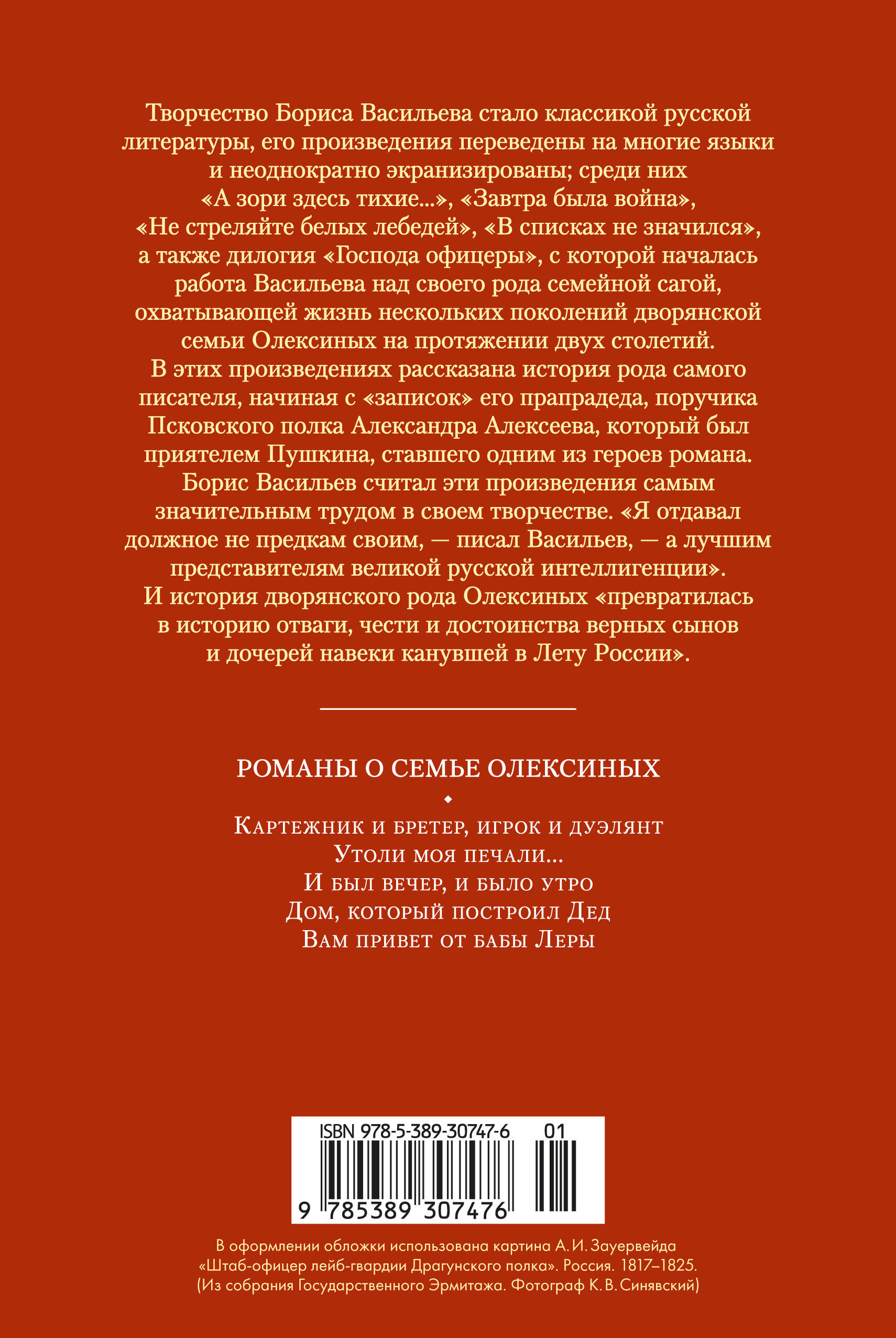 Творчество Бориса Васильева стало классикой русской литературы, его произведения переведены на многие языки и неоднократно экранизированы; среди них «А зори здесь тихие», «Завтра была война», «Не стреляйте белых лебедей», «В списках не значился», а также дилогия «Господа офицеры», с которой началась работа Васильева над своего рода семейной сагой, охватывающей жизнь нескольких поколений дворянской семьи Олексиных на протяжении двух столетий. В этих произведениях рассказана история рода самого писателя, начиная с «записок» его прапрадеда, поручика Псковского полка Александра Алексеева, который был приятелем Пушкина, ставшего одним из героев романа. Борис Васильев считал эти произведения самым значительным трудом в своем творчестве. «Я отдавал должное не предкам своим, - писал Васильев, - а лучшим представителям великой русской интеллигенции». И история дворянского рода Олексиных «превратились в историю отваги, чести и достоинства верных сынов и дочерей навеки канувшей в Лету России». В настоящее издание вошли романы «Картежник и бретер, игрок и дуэлянт», «Утоли моя печали...», «И был вечер, и было утро», «Дом, который построил Дед», «Всем привет от бабы Леры», которые (наряду с дилогией "Господа офицера", опубликованной отдельным изданием) составили сагу об Олексиных.