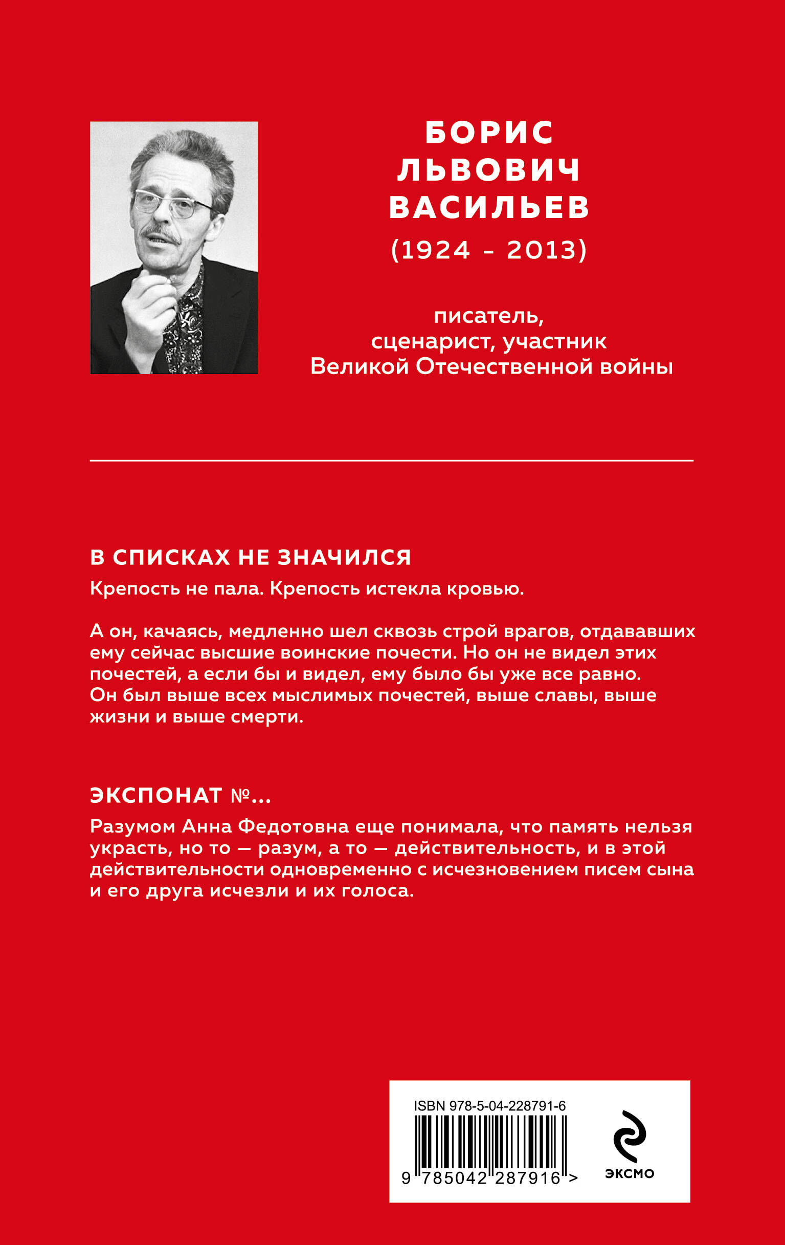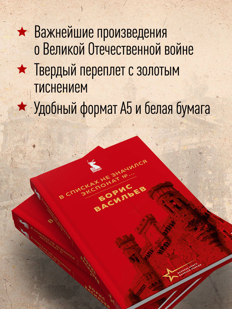 Великие книги Великой Победы. Должен знать каждый. В 2025 году вся Россия и весь мир отметили 80-летие Победы над фашизмом. Для каждого из нас Великая Война и память о ней - священна. К сожалению, живых свидетелей и героических участников страшных событий почти не осталось. Но у нас есть их воспоминания в книгах и фильмах военных лет. Цель серии - вспомнить главные книги победы, показать детям и подросткам важность их чтения, сохранить и передать главное слово о войне, написанное кровью и мужеством советских военных писателей. Серия в новом современном оформлении включает в себя культурный минимум книг по Великой Отечественной войне, который должен знать каждый. Борис Львович Васильев (1924-2013) - известный советский писатель и драматург, уроженец Смоленска, ушедший добровольцем на фронт во время Великой Отечественной войны. 21 июня 1941 года молодой лейтенант Коля Плужников, получив назначение на постоянное место службы, приезжает в Брест. Переполненные залы ожидания вокзала и толпа увешанных багажом людей не настораживают охваченного радостными надеждами юношу. Коля спешит к месту расположения своей части - в Брестскую крепость… Солдата не успевают зачислить в личный состав военнослужащих, а в четыре утра раздаются артиллерийские разрывы - началась война. Так, не значась в списках, он принимает участие в первом в своей жизни бою, который продлится десять месяцев... «В списках не значился» - это история о самоотверженности и героизме солдат, павших в безжалостной войне, о силе человека и любви, о Великой Победе, сотканной из подвигов и веры. «Экспонат №...» рассказывает об Анне Фёдоровне, матери, потерявшей на войне единственного сына. Храня его письма с фронта, она живёт ими до конца своих дней, пока неумолимое течение времени не превращает её святыню в безымянный музейный «экспонат».| Издательство | ООО "Издательство "Эксмо" |