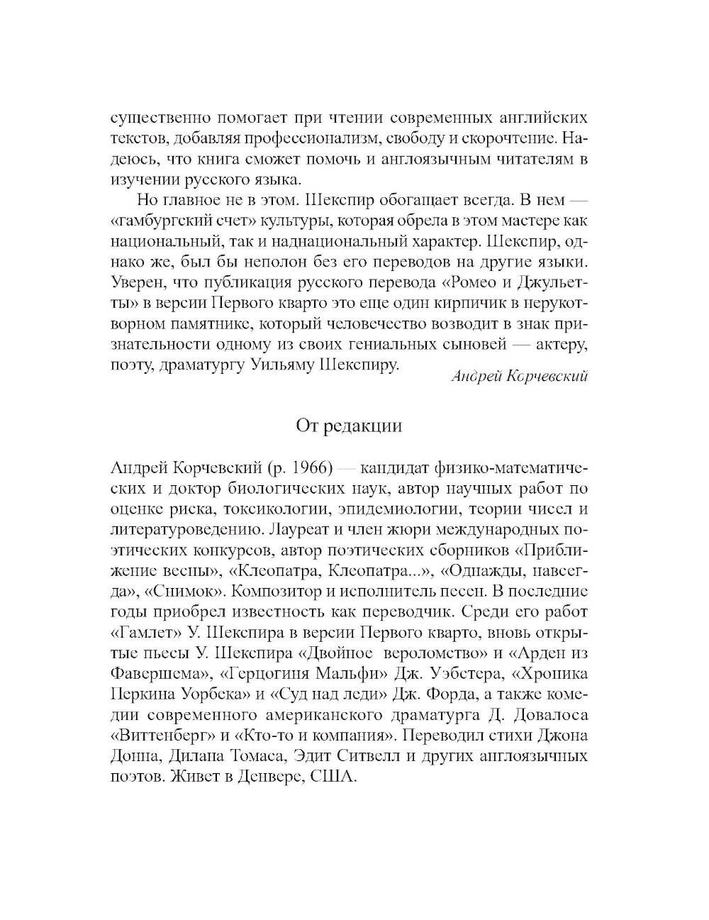 Впервые в России выходит поэтический перевод на русский язык «Трагедии Ромео и Джульетты» Уильяма Шекспира в изначальной версии (Первое кварто), которая заметно отличается от широко известного варианта трагедии сжатостью и динамичностью развития сюжета. При этом, по мнению шекспироведов, многие строки Первого кварто обладают несомненной самостоятельностью и поэтической мощью, не только не проигрывающей позднейшим вариантам, но и в ряде случаев превосходящей более поздние издания. Из предисловия переводчика: Более 420 лет назад произошло не слишком громкое событие, о значении которого люди продолжают спорить до сегодняшних дней. В 1597 году в книжных лавках Лондона и за его пределами появилась книга небольшого формата - впервые опубликованный издателем Джоном Декстером текст пьесы «Ромео и Джульетта», входившей в репертуар популярнейшего театра «Слуги лорда Хансдона» (который будет вскоре переименован в «Слуги Лорда-камергера», а затем в «Слуги короля» - откуда уже недалеко и до прогремевшего на века театра «Глобус»). По многим свидетельствам, «Трагедия Ромео и Джульетты» в формате так называемого Первого кварто (книжка размером примерно 8 на 6 дюймов) была распродана очень быстро. Саму же пьесу впервые поставили в 1595 году, и она уже несколько лет не сходила со сцены. В 1599 году появится и Второе кварто пьесы, а затем, год за годом, вышло еще несколько изданий. Началось путешествие шекспировской трагедии не только по театральным подмосткам, но и в безграничном океане книжного мира. «Ромео и Джульетта» и в XXI веке остается одним из главных произведений Шекспира, лидирующим по количеству постановок и переведенным на бесчисленные языки...| Издательство | Текст |