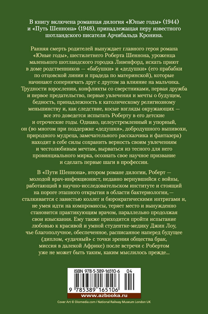 Романная дилогия шотландского писателя Арчибальда Кронина "Юные годы" (1944) и "Путь Шеннона" (1948) во многом автобиографична. Ранняя смерть родителей вынуждает шестилетнего Роберта Шеннона искать приют в доме родственников, которые начинают соперничать друг с другом за влияние на мальчика. Трудности взросления, конфликты со сверстниками, первая дружба и первое предательство, бедность, принадлежность к католическому религиозному меньшинству и, как следствие, косые взгляды окружающих - все это доведется испытать Роберту в его детские и отроческие годы. Однако, целеустремленный и упорный, он находит в себе силы сохранить верность своим увлечениям и честолюбивым мечтам, вырваться из тесного для него провинциального мирка, осознать свое научное призвание и сделать первые шаги в профессии. Во втором романе дилогии Роберт - молодой амбициозный врач-инфекционист, недавно вернувшийся с войны, работающий в научно-исследовательском институте и стоящий на пороге этапного открытия в области бактериологии - сталкивается с завистью коллег и бюрократическими интригами, и, не умея идти на компромиссы, теряет место и вынужденно становится практикующим врачом, параллельно продолжая свои изыскания. Ему также приходится пройти испытание любовью к красивой и умной Джин Лоу, чье благополучное и обеспеченное будущее, расписанное наперед ее родителями, после встречи с Робертом уже не может быть прежним…| Издательство | Издательство АЗБУКА ООО |