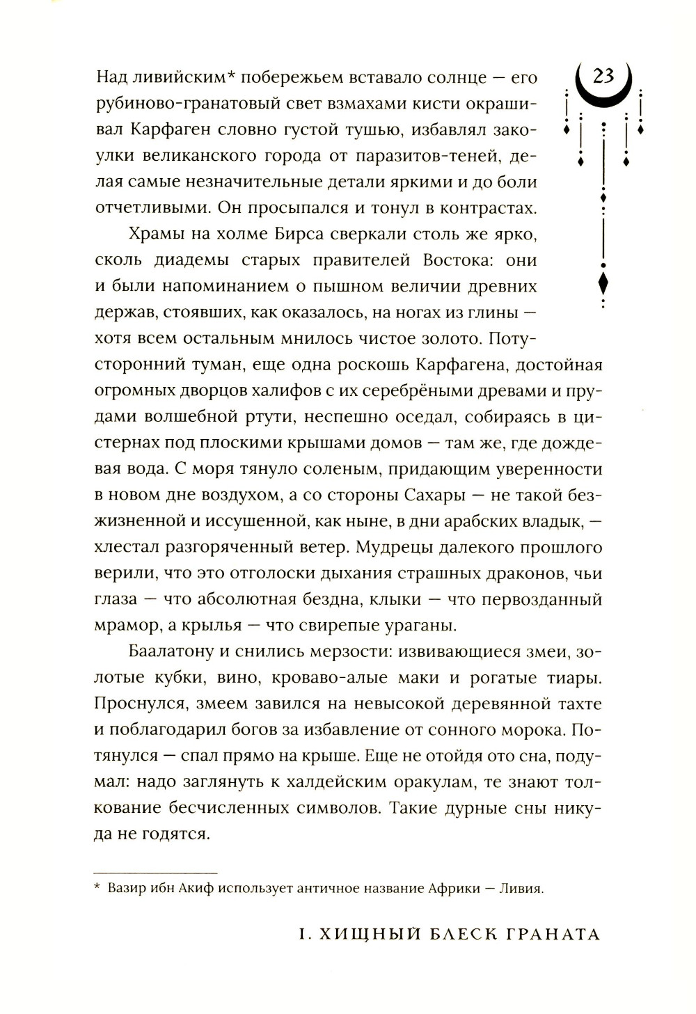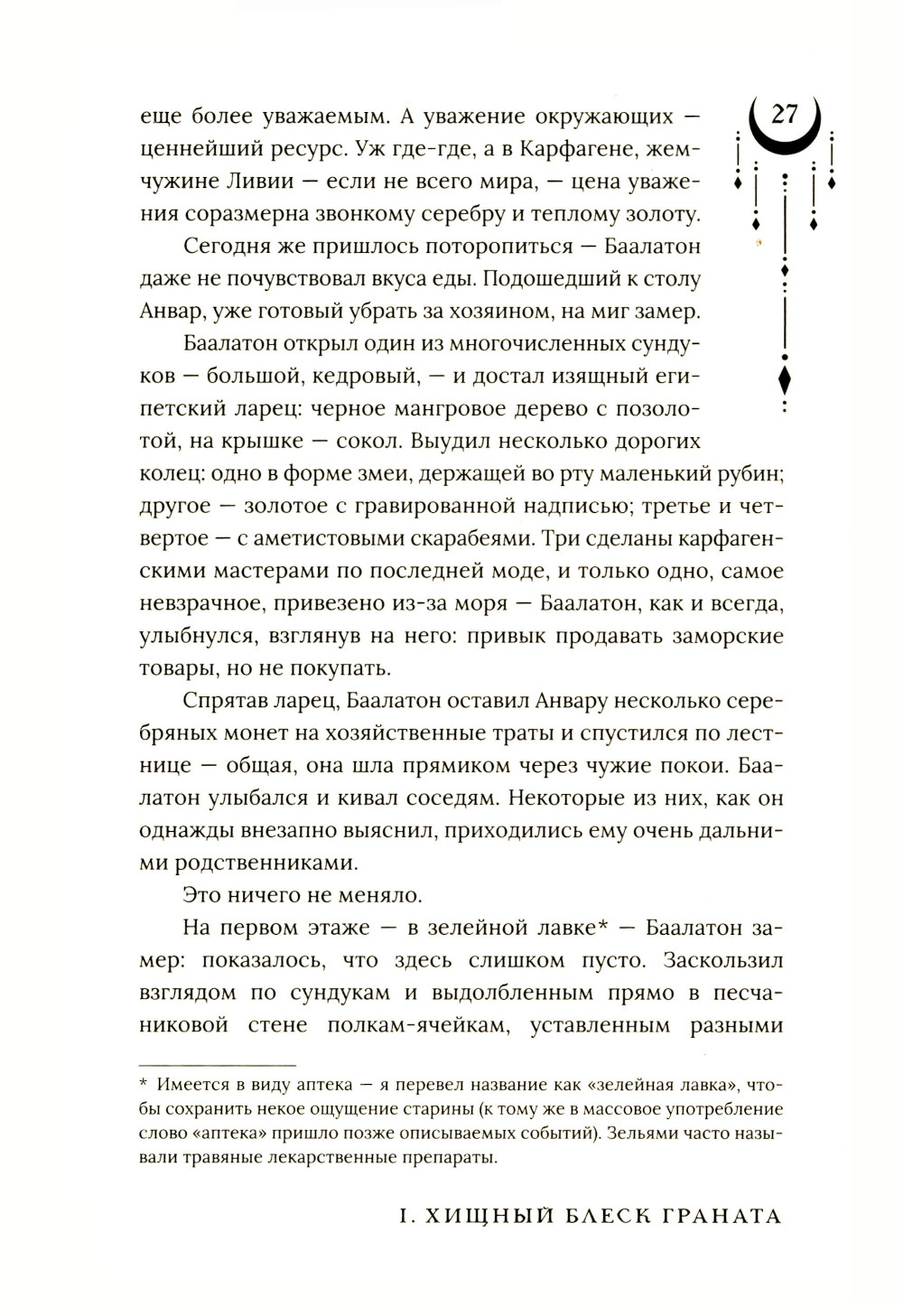 Карфагенский купец Баалатон всю жизнь хотел продавать фантастических тварей. Он отправляется на поиски Драконьего Камня, награда за который поможет исполнить мечту. Однако находит не только его, но и прекрасную дикарку, которую забирает с собой. Цена за сокровище велика - Баалатон заболевает странной болезнью. Лицо его покрывается чешуей, а в голове звучат змеиные голоса. Но никто не в силах помочь ему. Тем временем по улицам Карфагена ползут недобрые слухи. Город замер в ожидании собственного конца, гремят пророчества, творится темное колдовство. Сможет ли Баалатон избежать метаморфозы души и тела? Готов ли пожертвовать жизнью таинственной дикарки ради собственных целей? Но главное - удастся ли ему сохранить человечность?| Издательство | ИД КомпасГид |