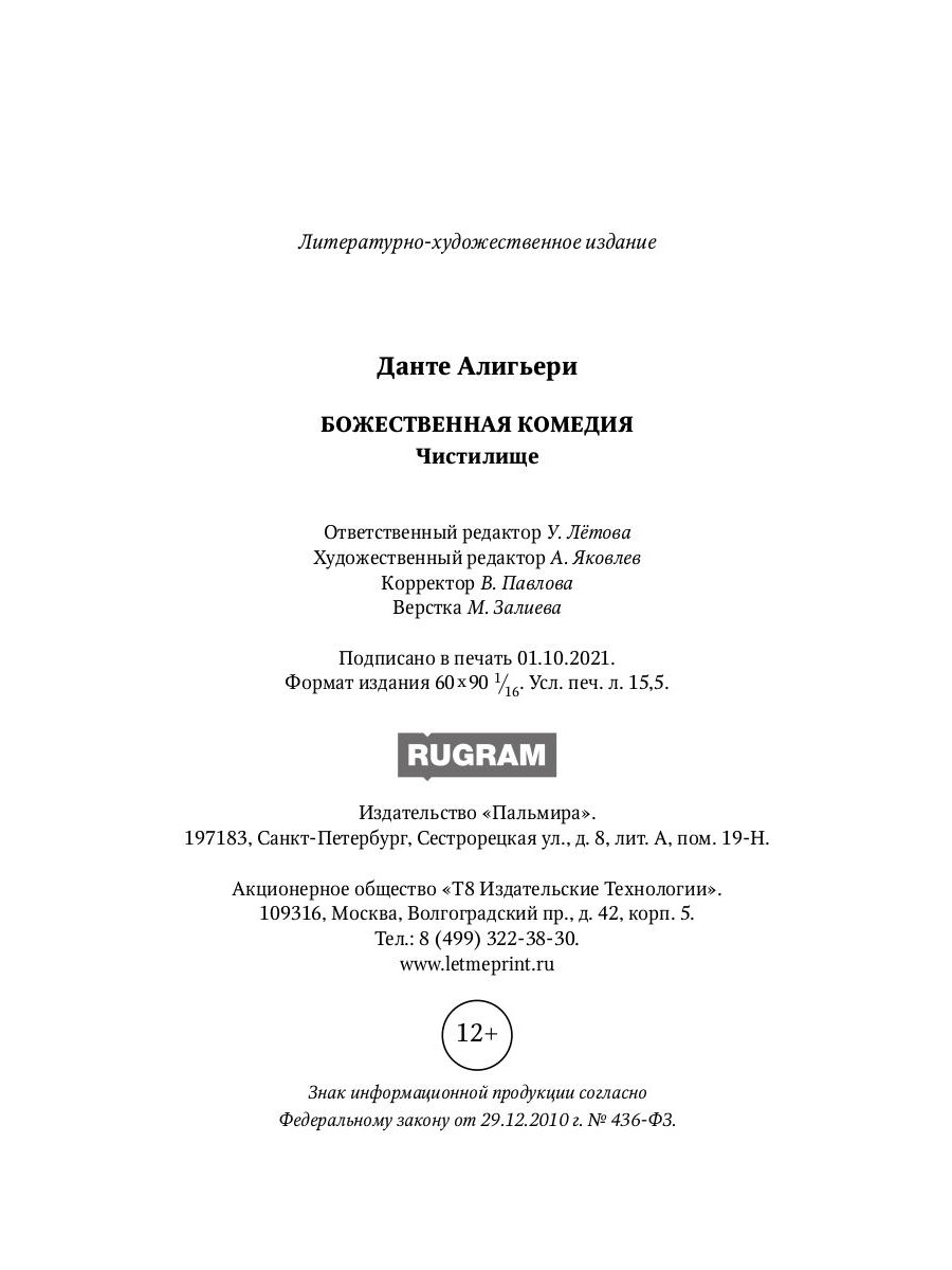 В настоящей книге представлен перевод второй кантики величайшего памятника мировой культуры - «Божественной комедии» (1308-1321), выполненный членом-корреспондентом РАН, доктором педагогических наук В. Г. Маранцманом. Данте Алигьери, образованнейший человек своего времени, отразил в своей поэме представления о мире, знания и культуру Средневековья во всей полноте, создав таким образом настоящую средневековую энциклопедию научных, политических, философских, этических, богословских знаний. Он соединил в своем творении традиционный жанр «хождений» в загробный мир и новаторское отражение современности. Во второй части поэмы описан путь через чистилище, часть загробного мира, куда попадают души, успевшие рано или поздно покаяться в совершенных грехах.| Издательство | Т8 RUGRAM |