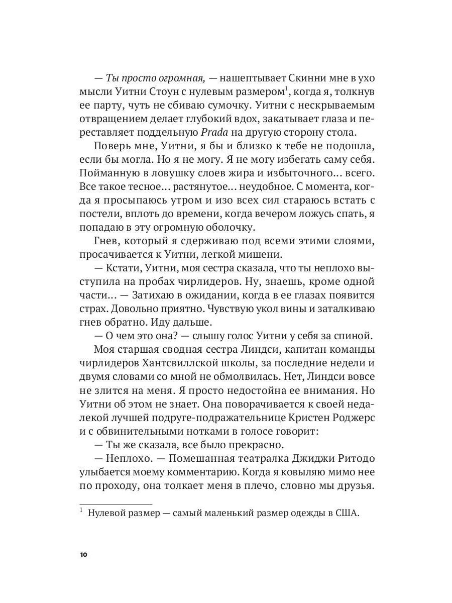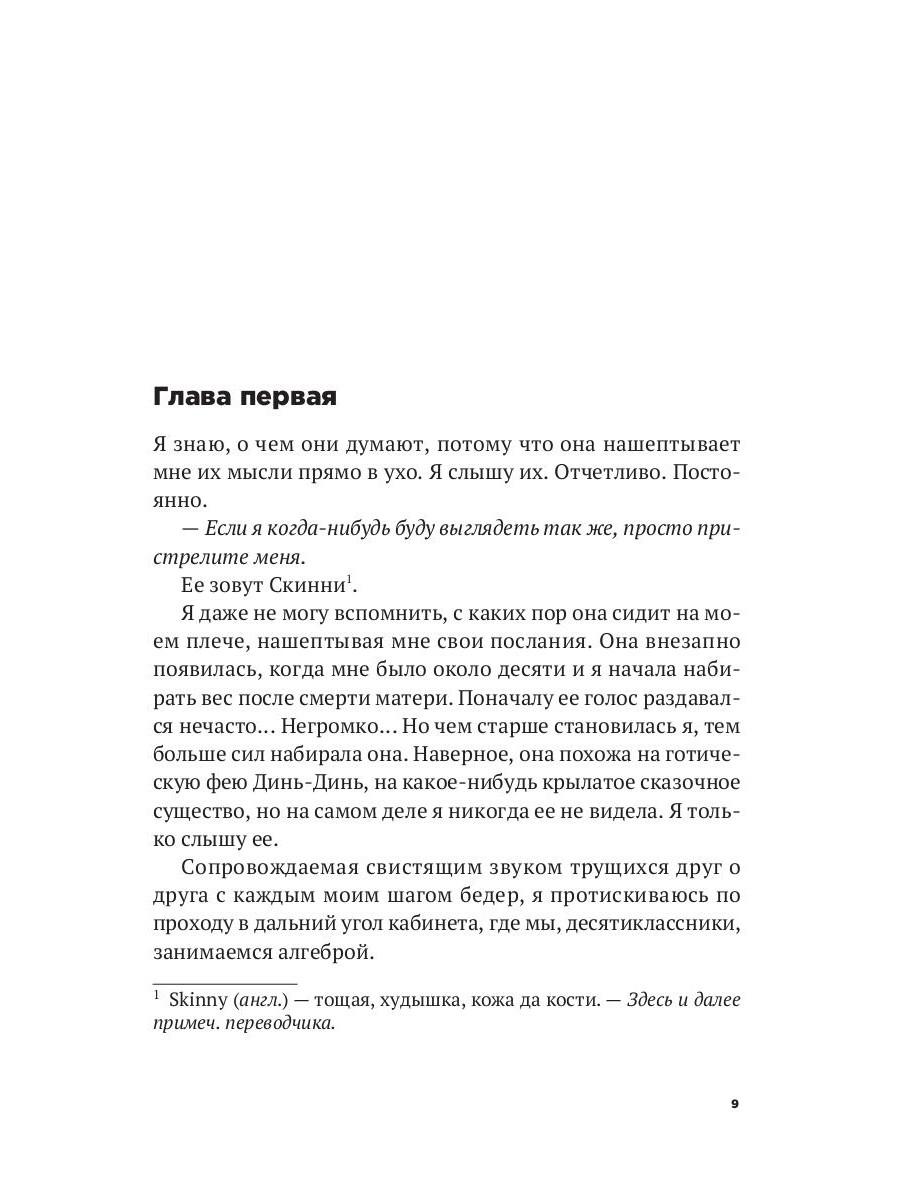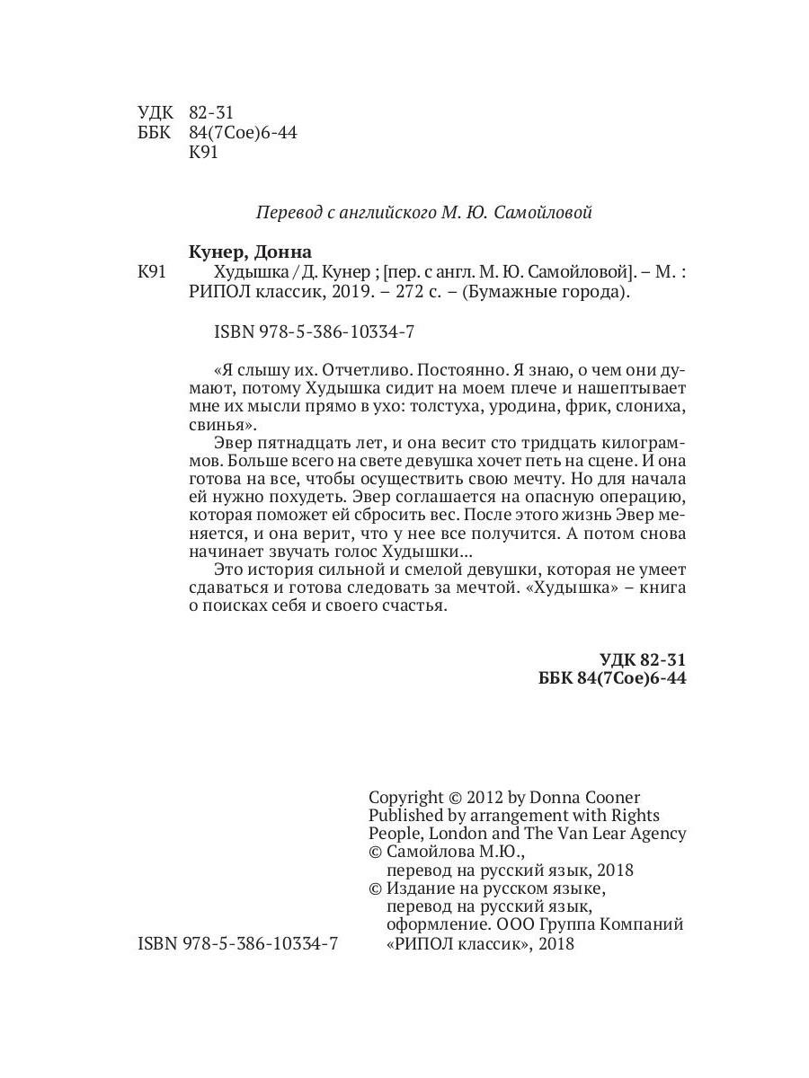 «Я слышу их. Отчетливо. Постоянно. Я знаю, о чем они думают, потому Худышка сидит на моем плече и нашептывает мне их мысли прямо в ухо: толстуха, уродина, фрик, слониха, свинья». Эвер пятнадцать лет, и она весит сто тридцать килограммов. Больше всего на свете девушка хочет петь на сцене. И она готова на все, чтобы осуществить свою мечту. Но для начала ей нужно похудеть. Эвер соглашается на опасную операцию, которая поможет ей сбросить вес. После этого жизнь Эвер меняется, и она верит, что у нее все получится. А потом снова начинает звучать голос Худышки... Это история сильной и смелой девушки, которая не умеет сдаваться и готова следовать за мечтой. «Худышка» - книга о поисках себя и своего счастья.| Издательство | Рипол Классик |