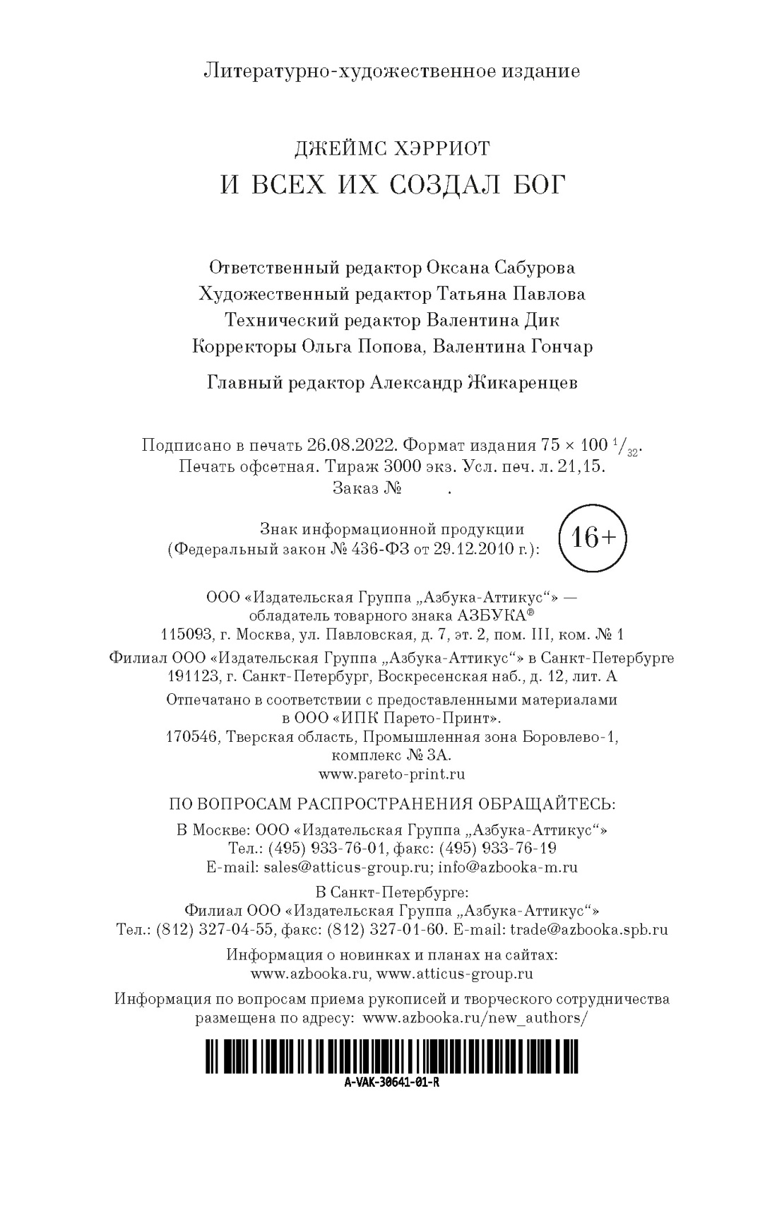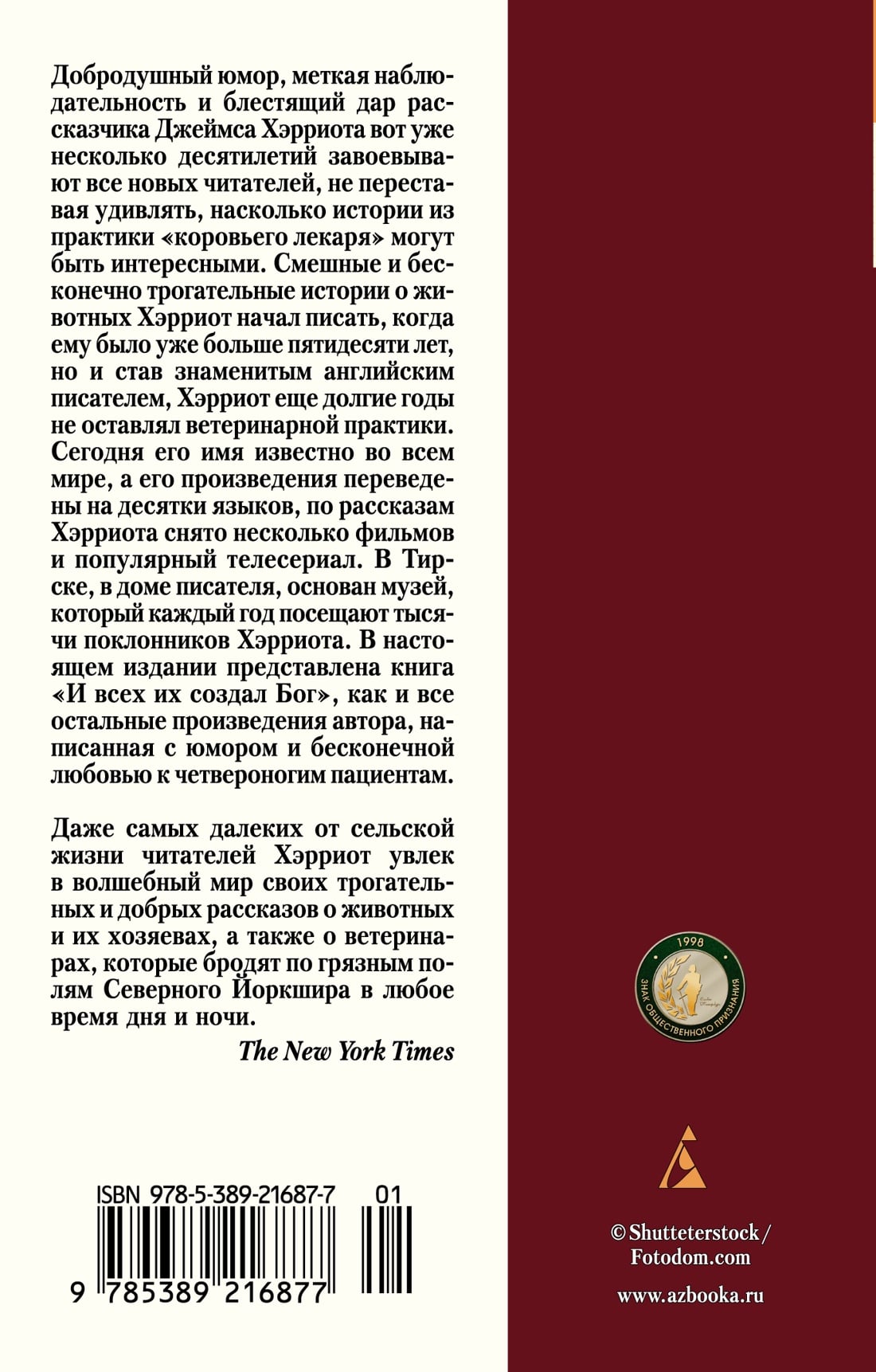 Добродушный юмор, меткая наблюдательность и блестящий дар рассказчика Джеймса Хэрриота вот уже несколько десятилетий завоевывают все новых читателей, не переставая удивлять, насколько истории из практики «коровьего лекаря» могут быть интересными. Смешные и бесконечно трогательные истории о животных Хэрриот начал писать, когда ему было уже больше пятидесяти лет, но и став знаменитым английским писателем, Хэрриот еще долгие годы не оставлял ветеринарной практики. Сегодня его имя известно во всем мире, а его произведения переведены на десятки языков, по рассказам Хэрриота снято несколько фильмов и популярный телесериал. В Тирске, в доме писателя, основан музей, который каждый год посещают тысячи поклонников Хэрриота. В настоящем издании представлена книга «И всех их создал Бог», как и все остальные произведения автора, написанная с юмором и бесконечной любовью к его четвероногим пациентам.| Издательство | Азбука |